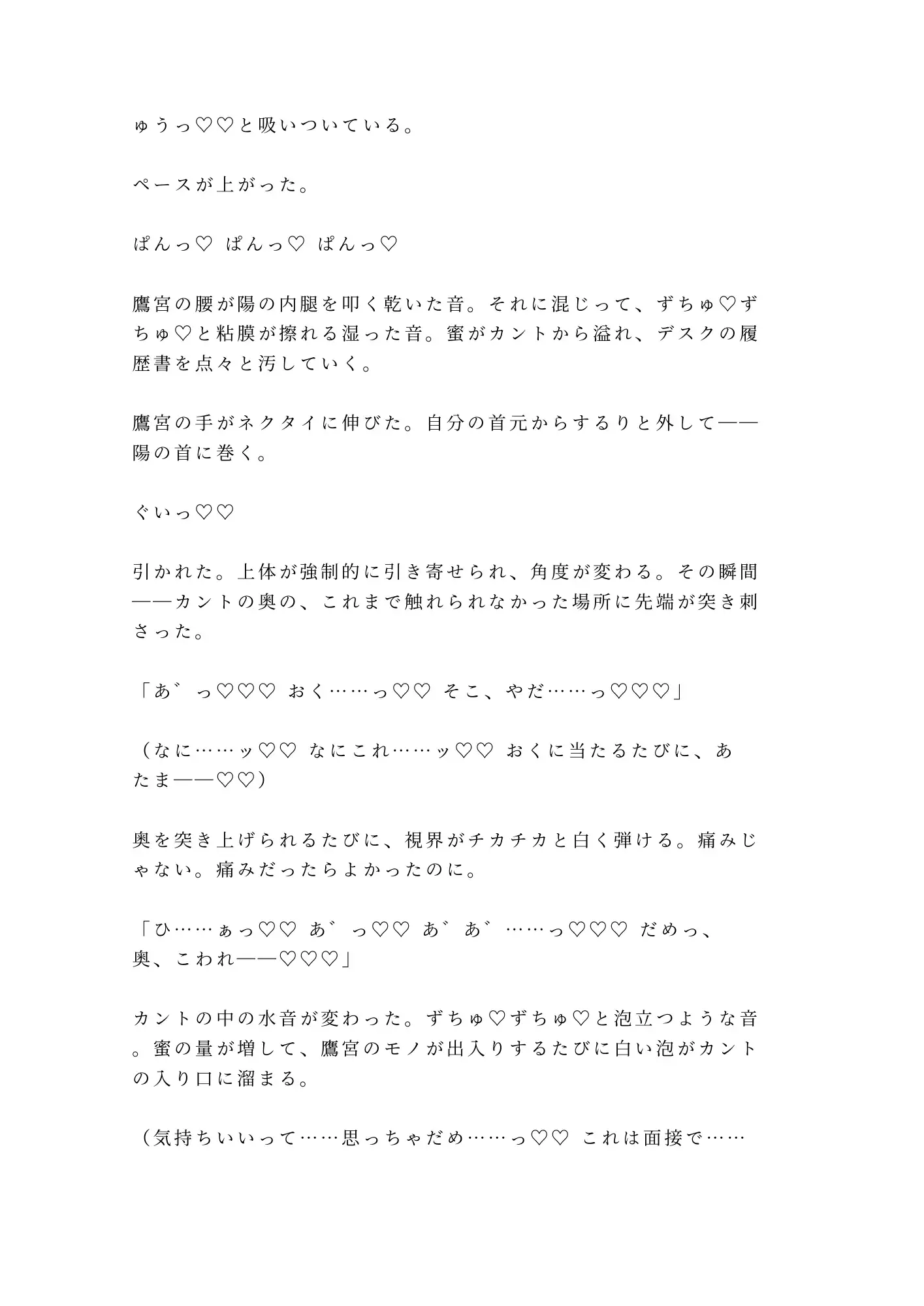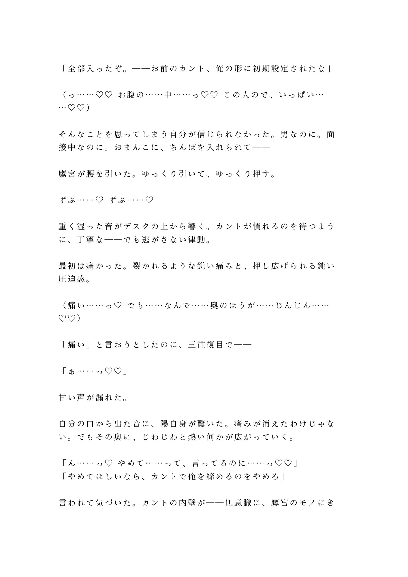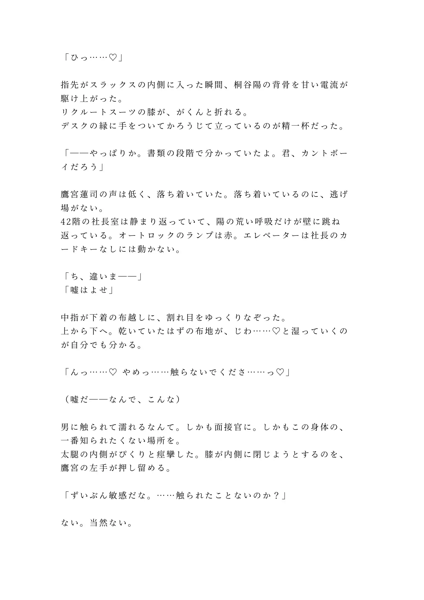 就活最終面接——それは、人生が決まる場所。奨学金四百万を抱えた大学生・桐谷陽にとって、目の前の内定通知書は命綱そのものだった。しかし42階の社長室で待っていたのは、採用試験でも適性検査でもない。若き社長・鷹宮蓮司による、身体の「査定」だった。
