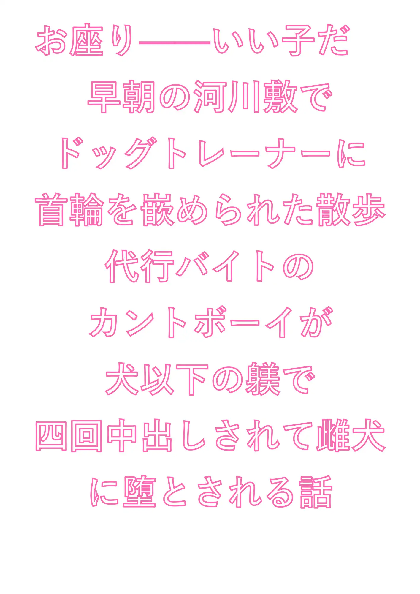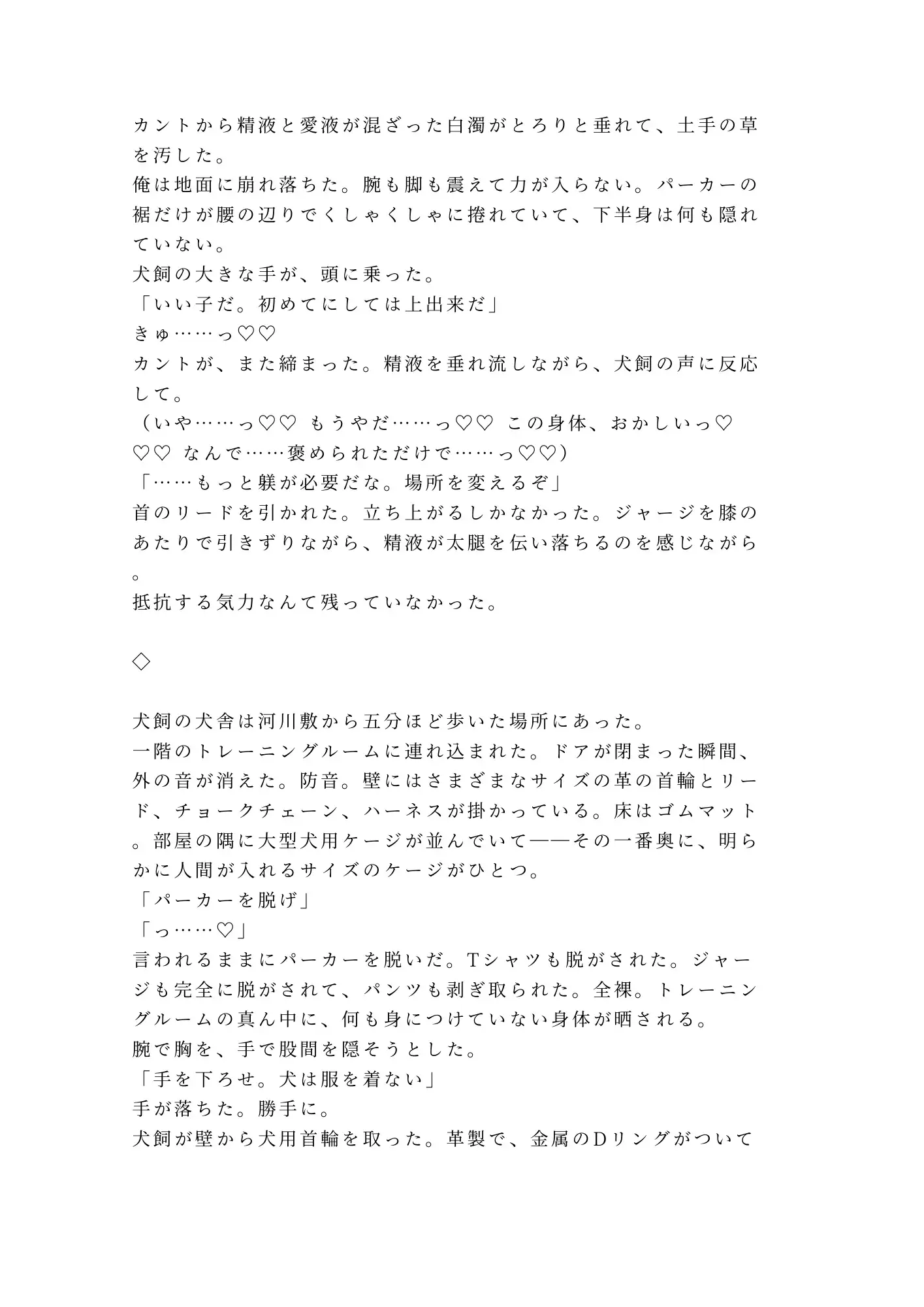 河川敷で四つん這いのまま初めてを奪われ、犬舎のトレーニングルームに連れ込まれ、革の首輪とハーネスを装着される。「お座り」「伏せ」「おねだり」——犬の基礎訓練と称した躾が始まる。褒められるたびに堕ち、罰されるたびに身体が覚え、四回の中出しを経て、青年の理性は完全に砕け散る。