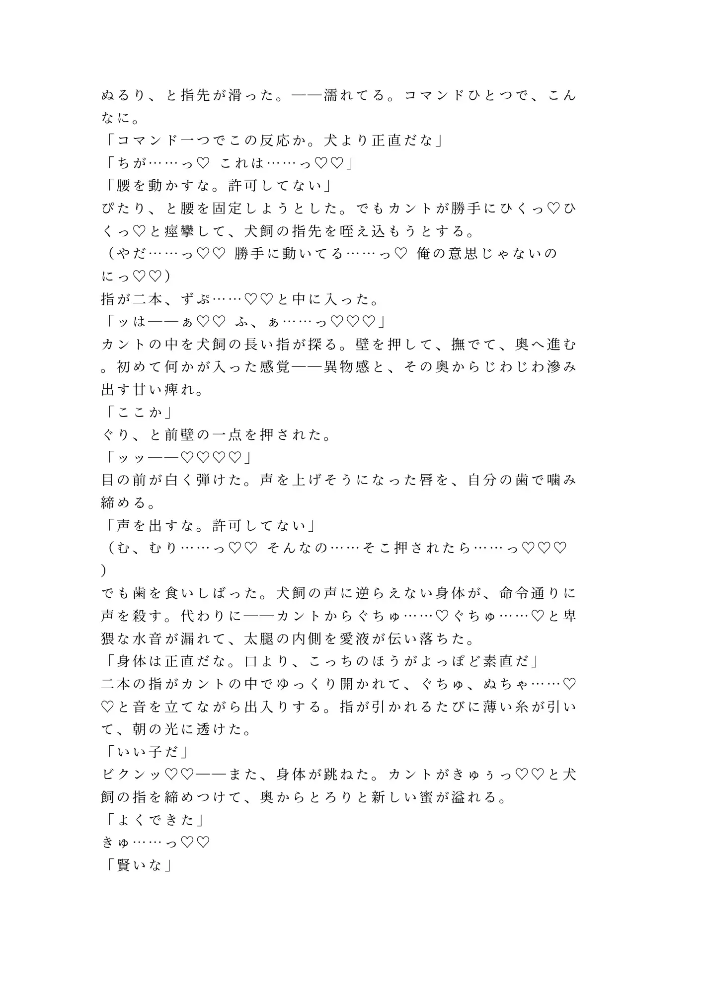 青年には誰にも言えない秘密がある。男の身体に女性器を持つカントボーイ。コンプレックスで誰にも触らせたことのないその場所が、犬飼のコマンドひとつでとろりと濡れて反応する。「いい子だ」と褒められるだけでカントが締まり、頭を撫でられるだけで下腹が疼く。家でも学校でも誰にも褒めてもらえなかった渇望が、快楽と直結していた。