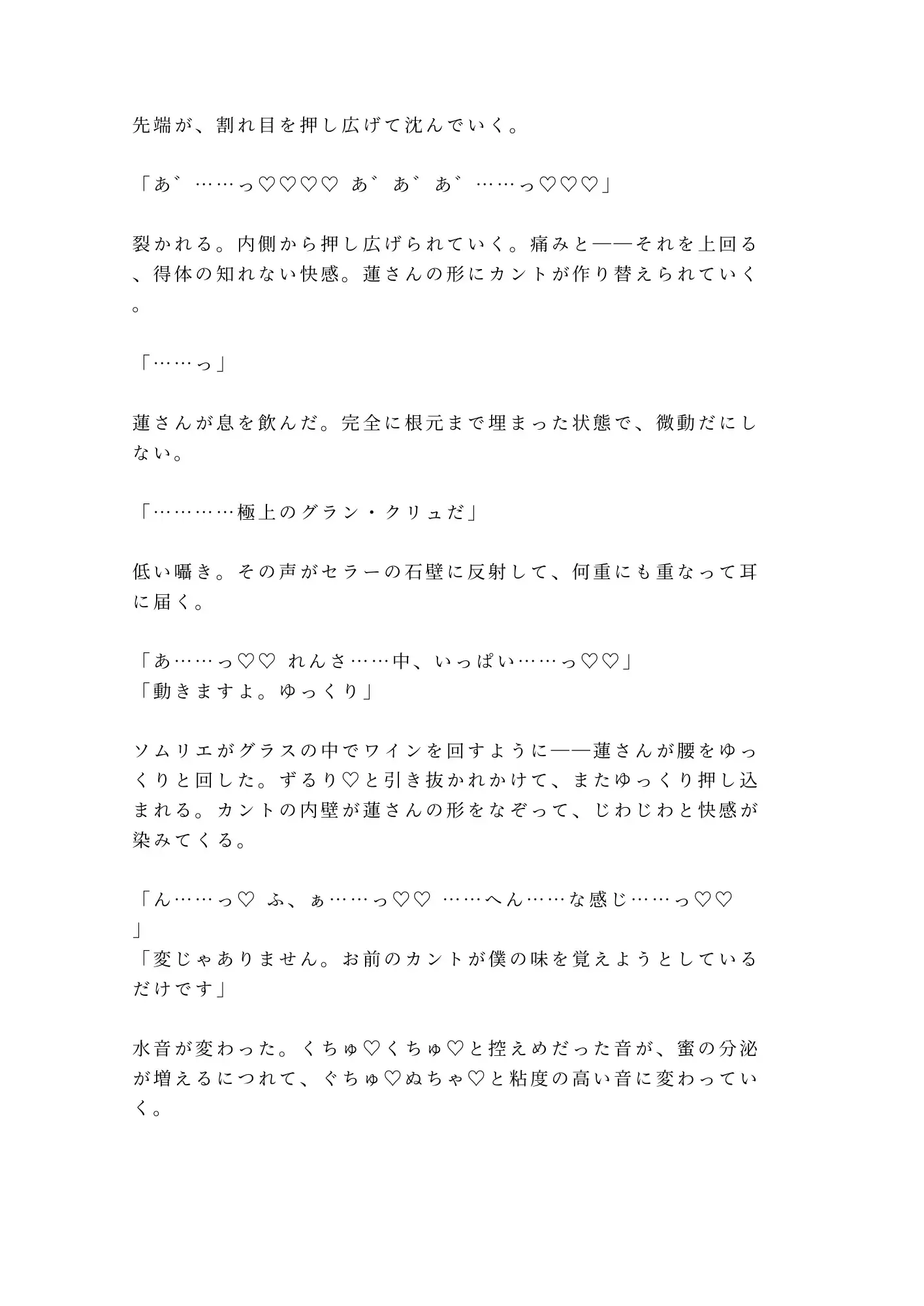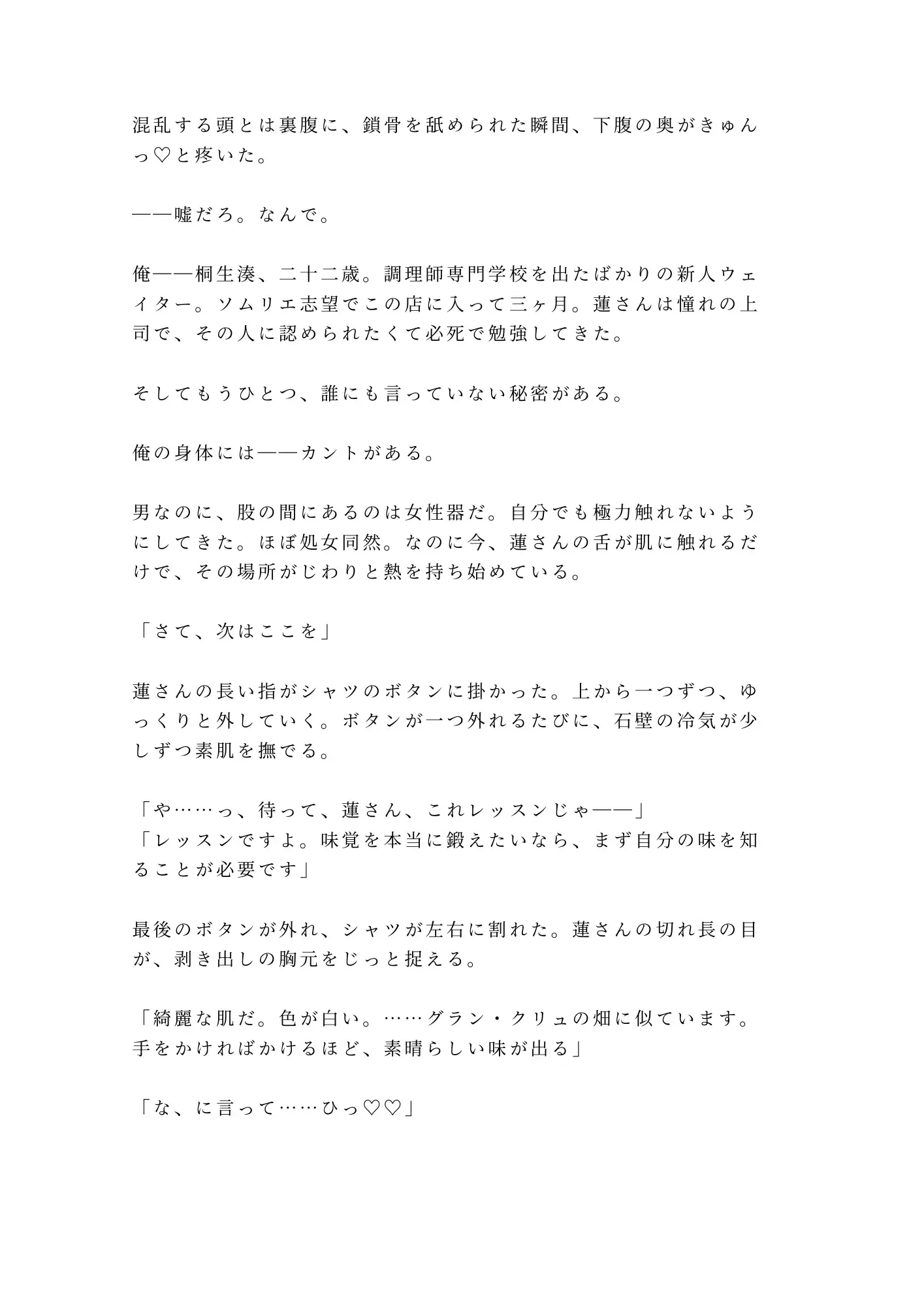 閉店後のワインセラー。室温十六度、石壁のアーチ天井に反響するのは——ワインを注ぐ音ではなく、カントボーイの嬌声だった。調理師専門学校を卒業したばかりの新人ウェイター・桐生湊、二十二歳。誰にも明かせない秘密を股の間に隠しながら、憧れのヘッドソムリエ・神楽坂蓮のもとでソムリエを目指していた。「テイスティングの特別レッスン」に誘われ、疑いもなくセラーへ降りた夜、地下二階のロックが閉まる音とともに、湊の日常は終わりを告げる。