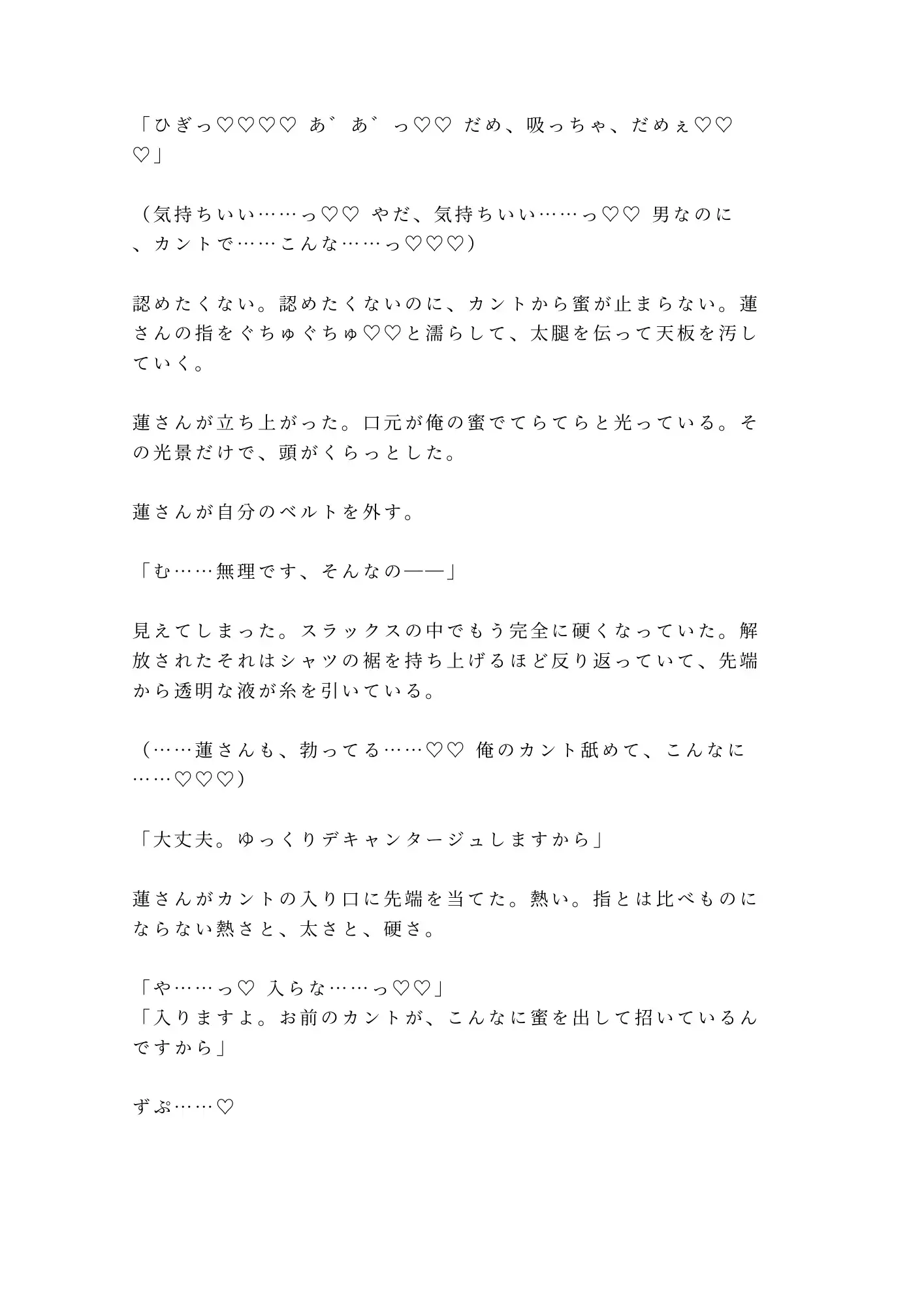 業界で”舌の魔術師”と呼ばれるソムリエの舌が、首筋から鎖骨、胸、そしてその先へ。ワインの品評と同じ精密さで全身を舐め尽くされ、触れたことすらなかったカントの味まで暴かれていく。テイスティングノートをつけるように湊の味を言語化しながら、蓮は一切の手加減をしない。