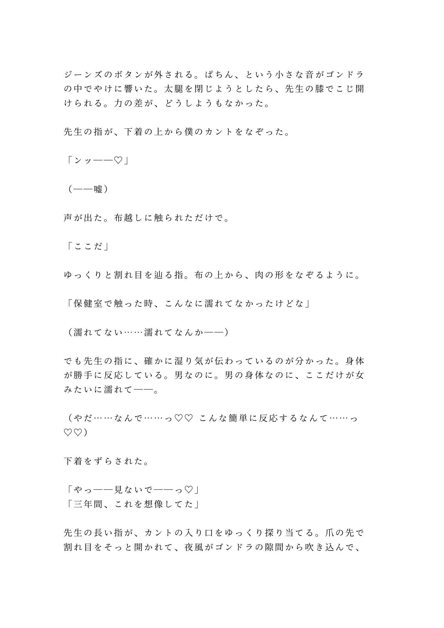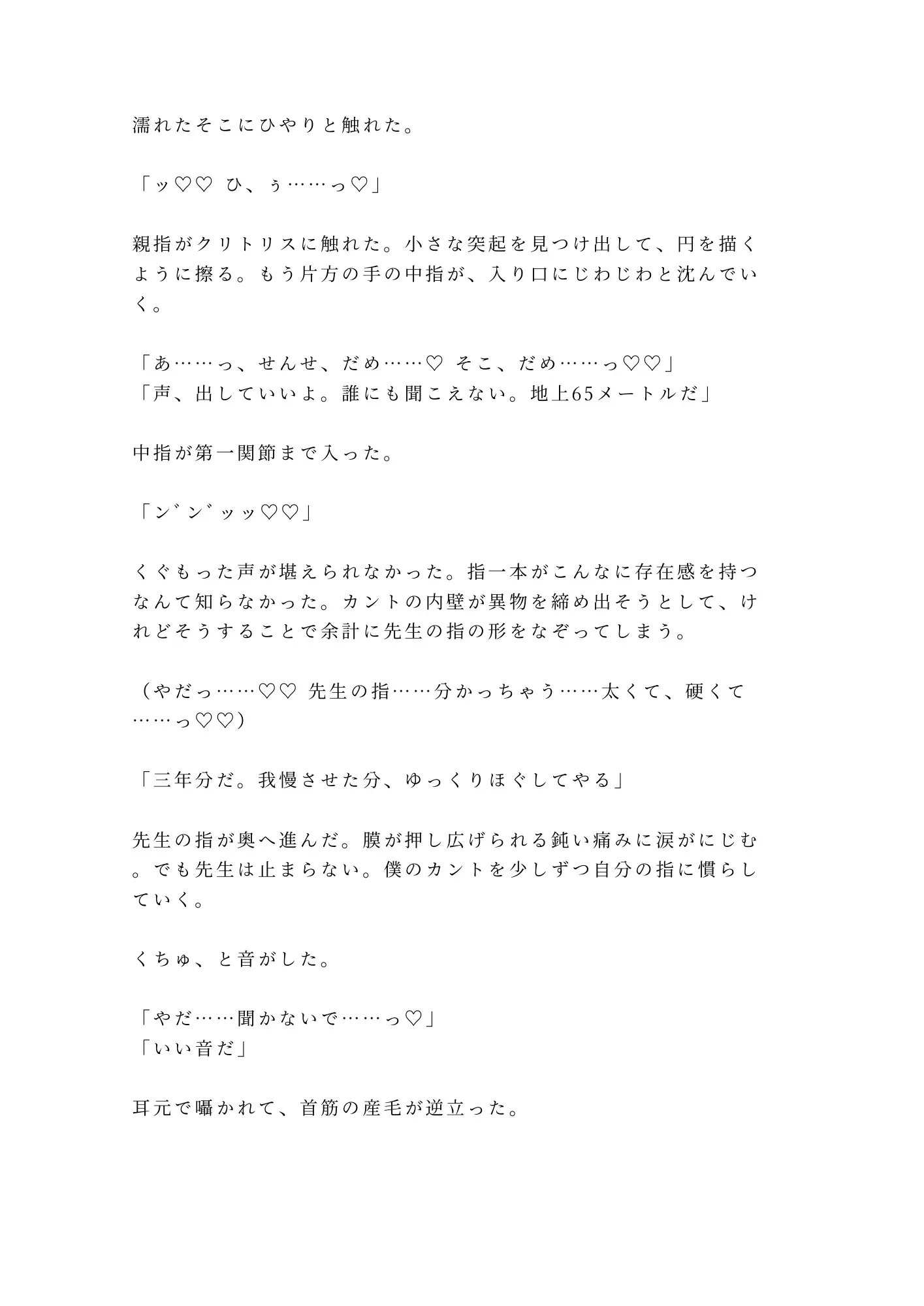 三年間の執着を隠し続けた元担任×秘密を抱えたカントボーイの教え子——二人きりの空中密室で、我慢の箍が外れる。