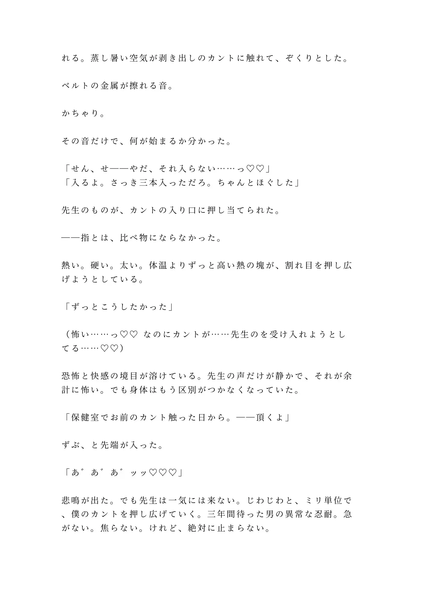 卒業しても、あの日の指の感触が消えない——。高校二年の保健室。体質検査と称して触れられたカントの記憶を、柊奏汰は誰にも言えないまま三年間抱えてきた。元担任・白石とは卒業以来会っていない。もう関わることはないと思っていた。