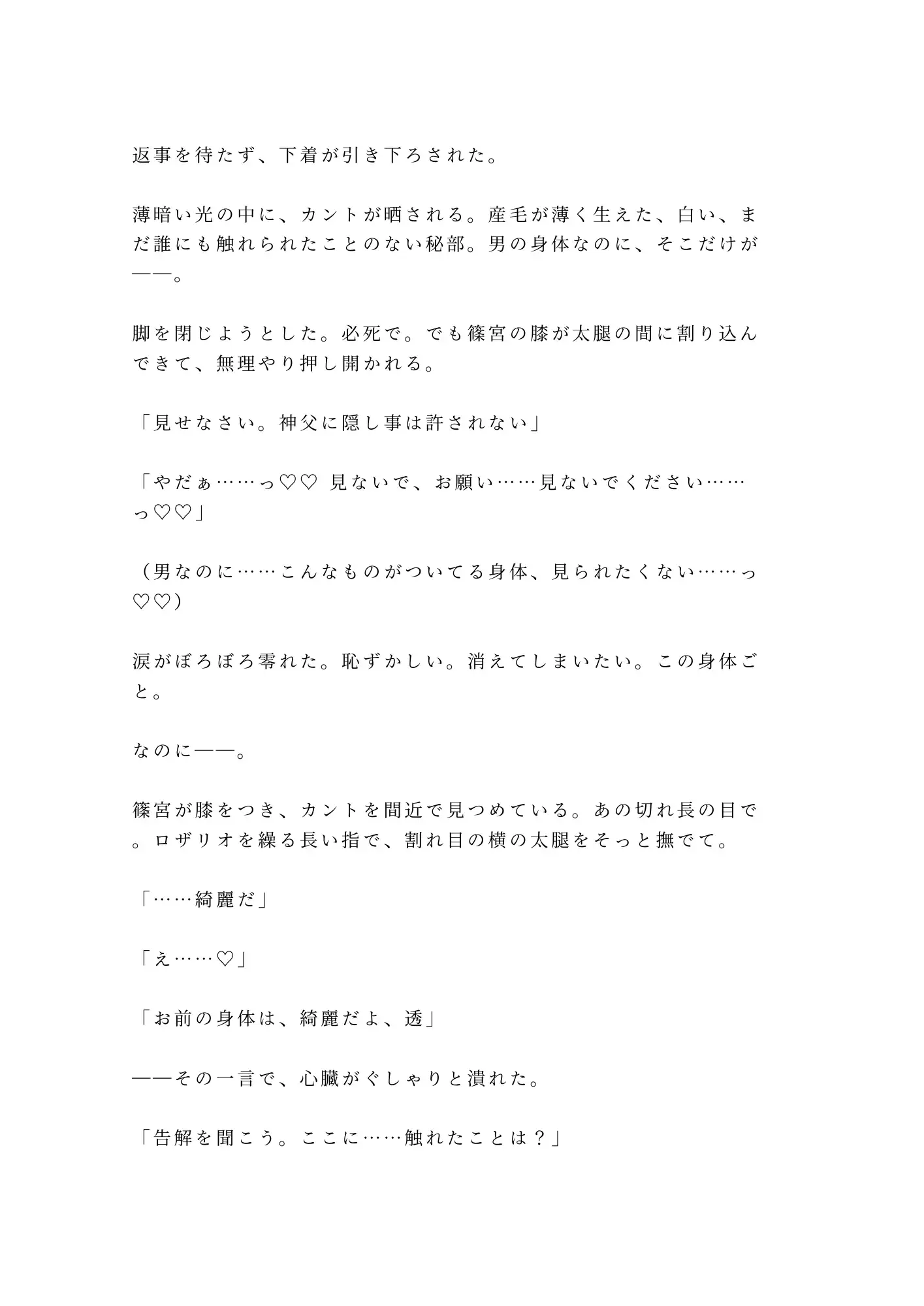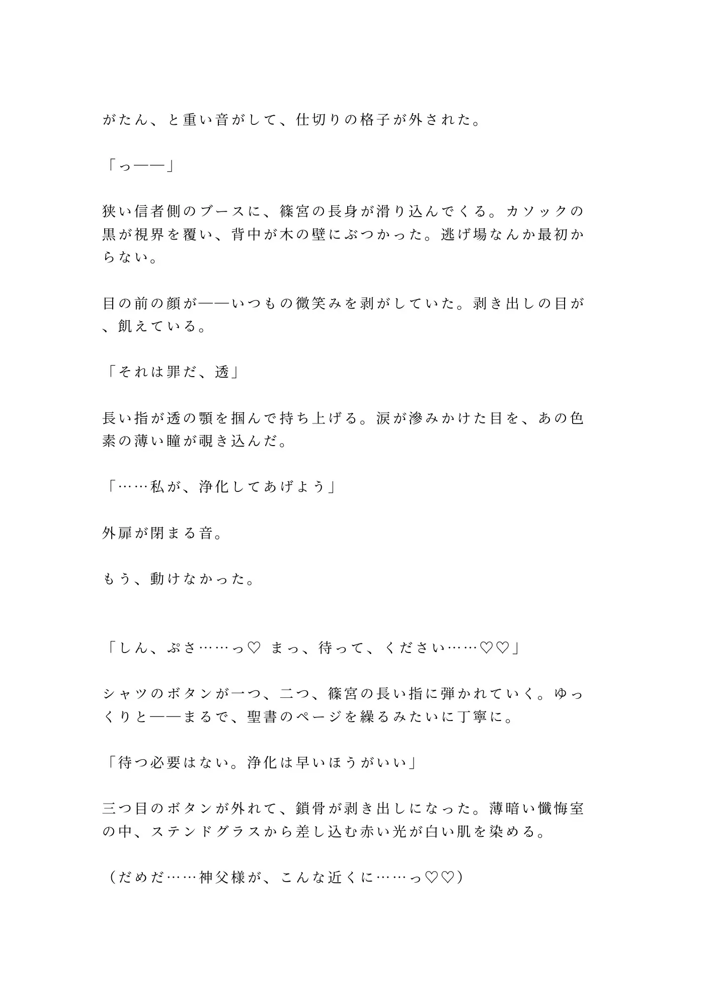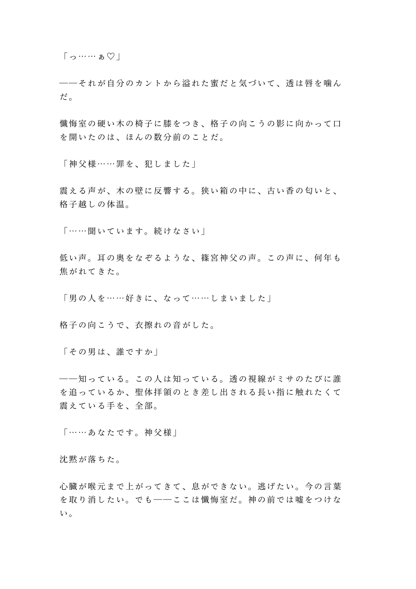 薄暗い懺悔室。格子の向こうに座る篠宮神父に、透はずっと焦がれていた。ミサのたびに目で追い、聖体拝領の指に触れたくて震え——その想いを「罪」として告白した瞬間、格子が外された。「それは罪だ。私が、浄化してあげよう」