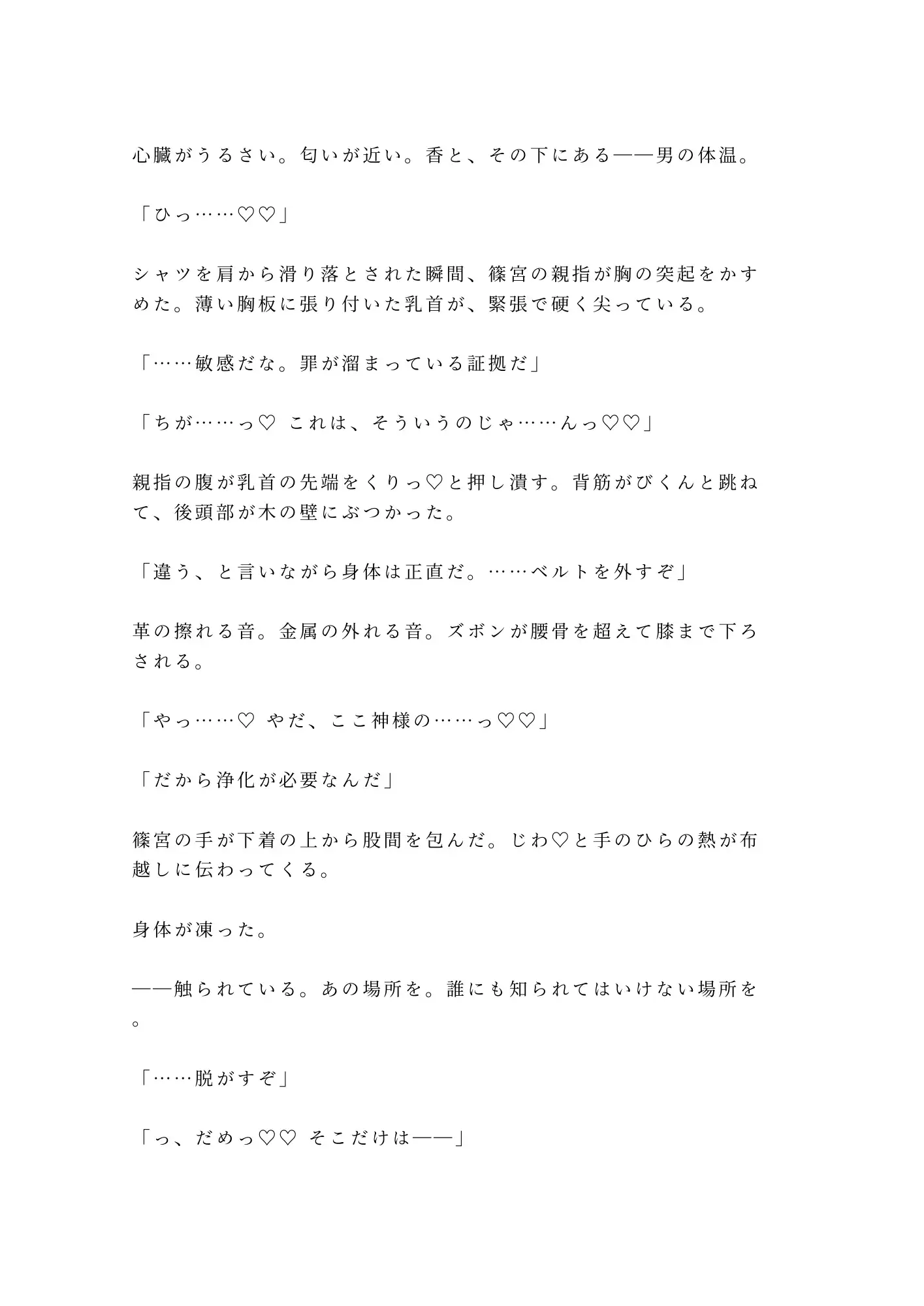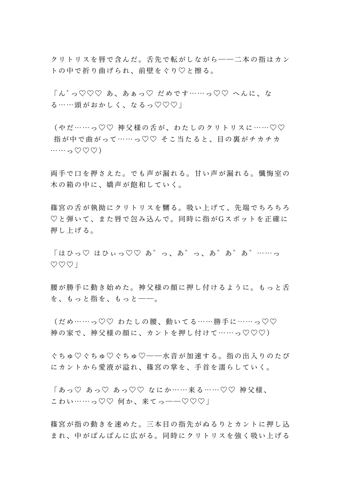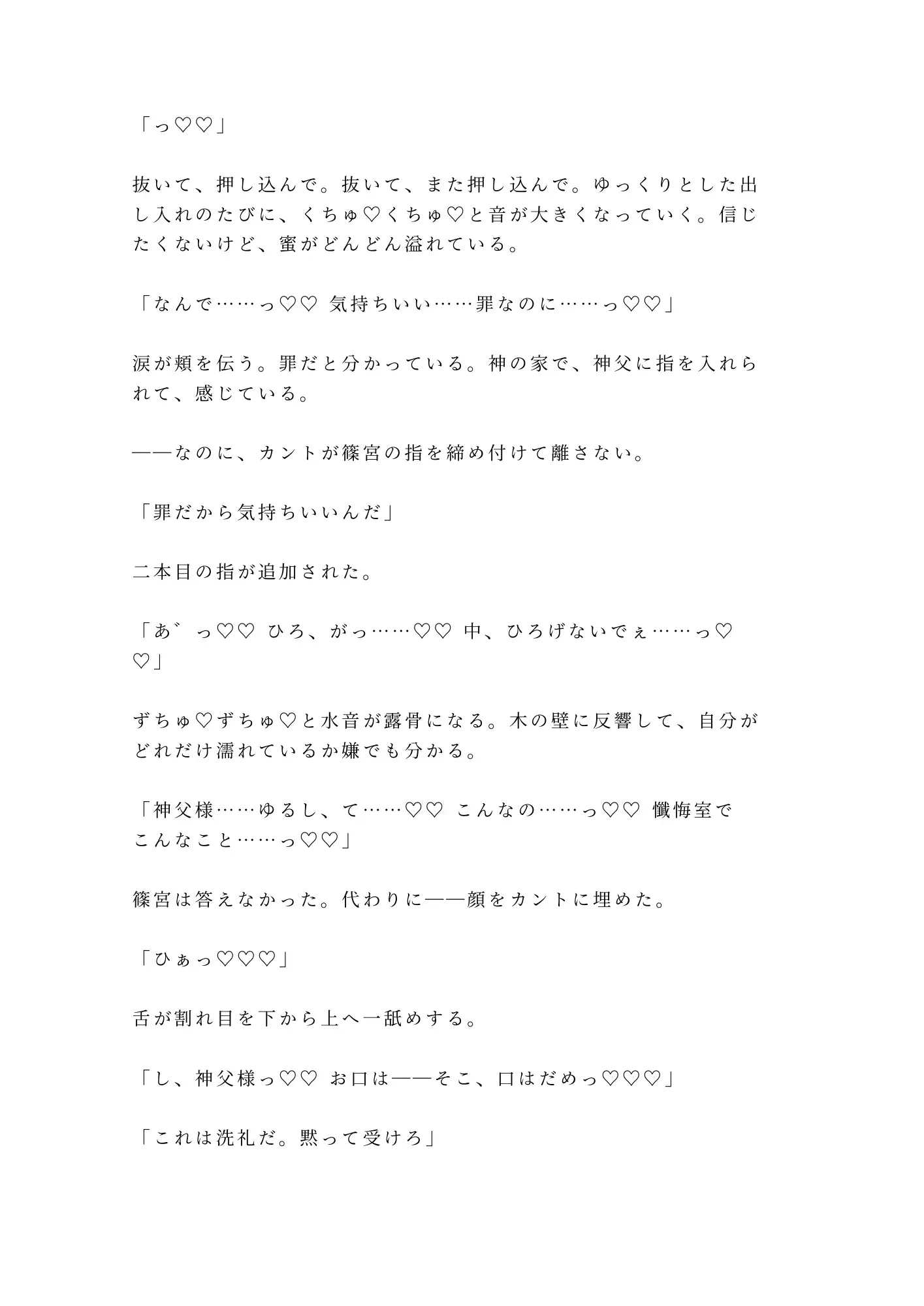 冷たい微笑の奥に飢えた目を隠した神父×自分の身体にコンプレックスを抱え、自慰すら罪悪感で止めてきた敬虔な信者。信仰を盾にした絶対的な上下関係の中で、「浄化」という名の蹂躙が始まる。