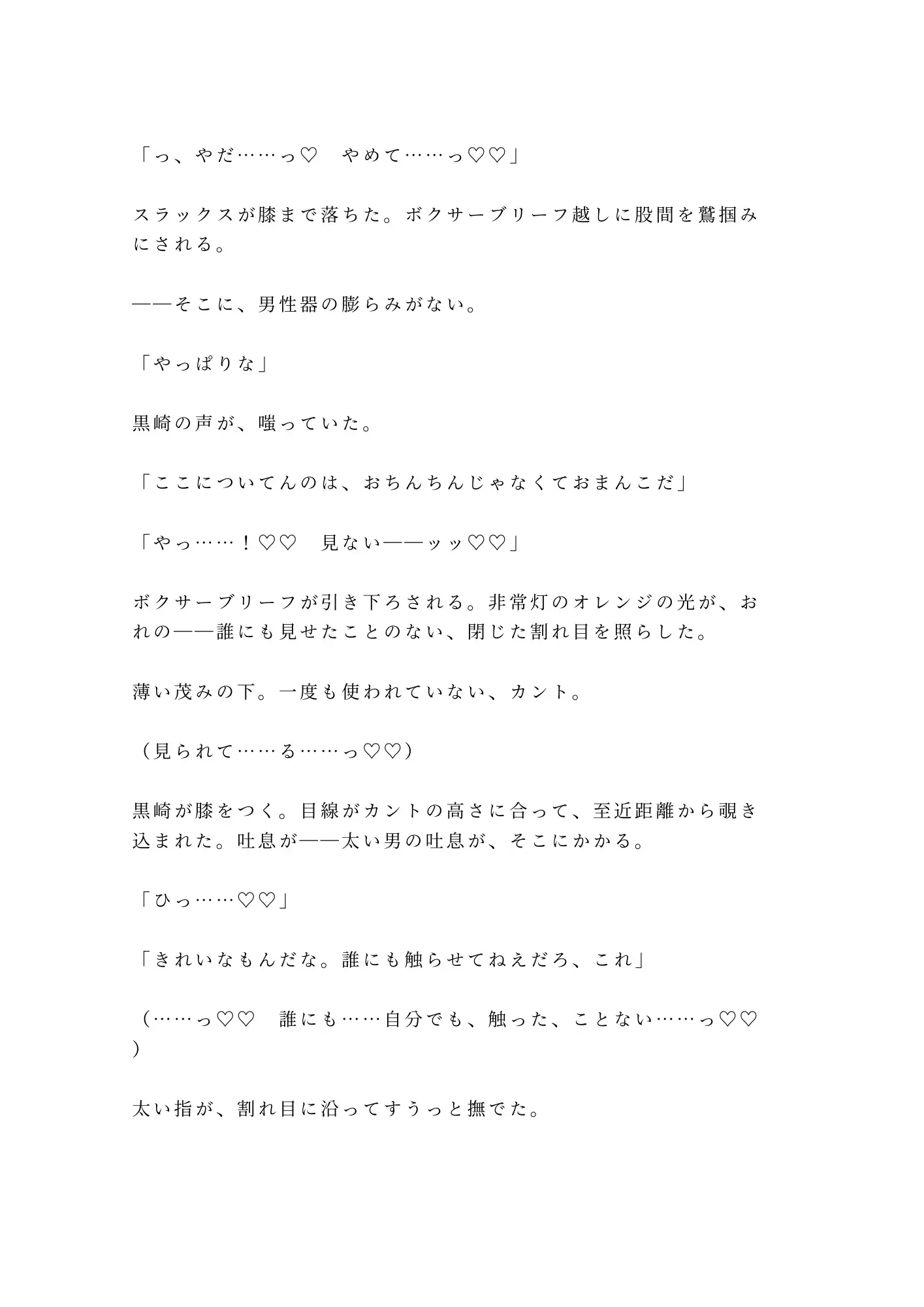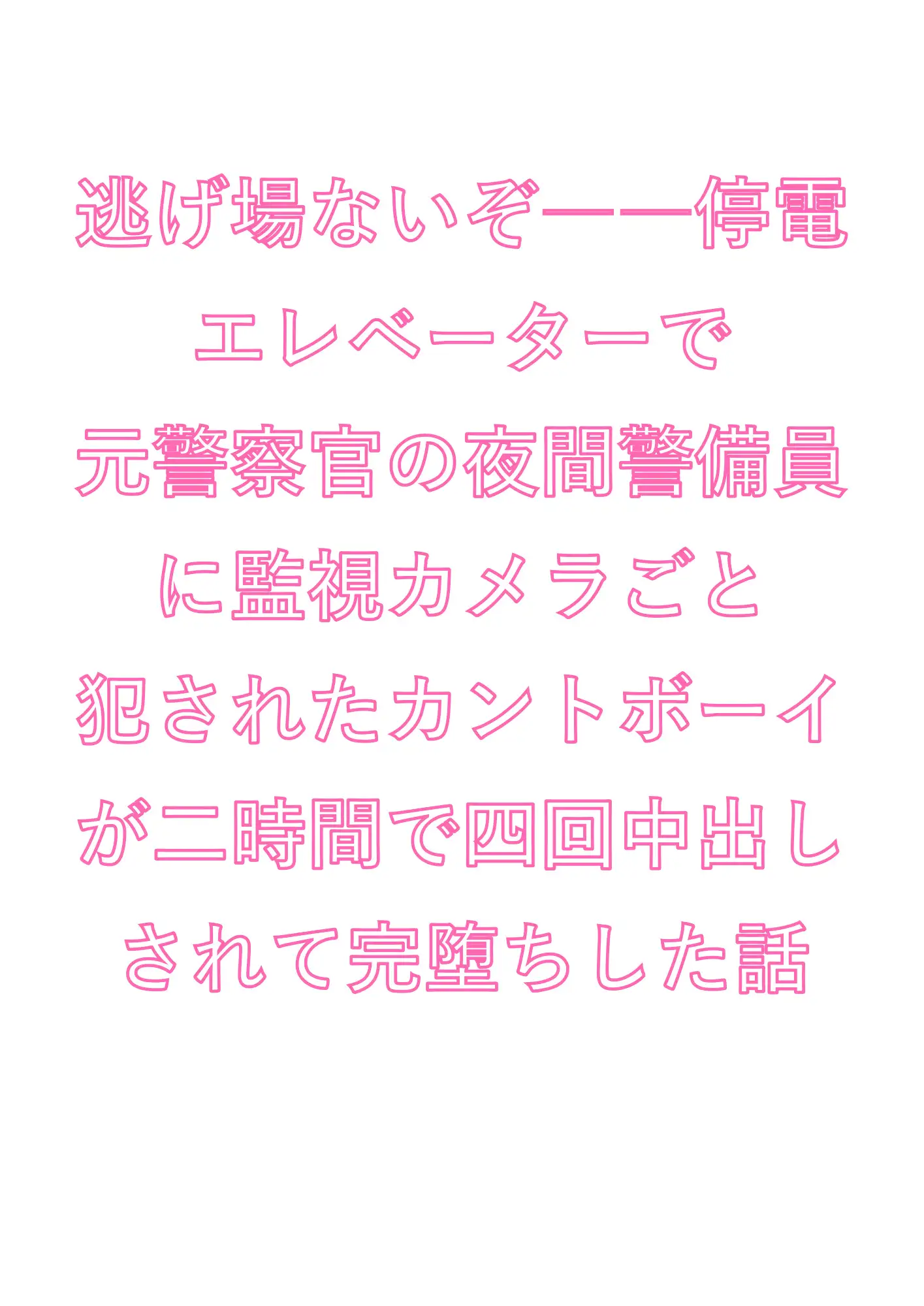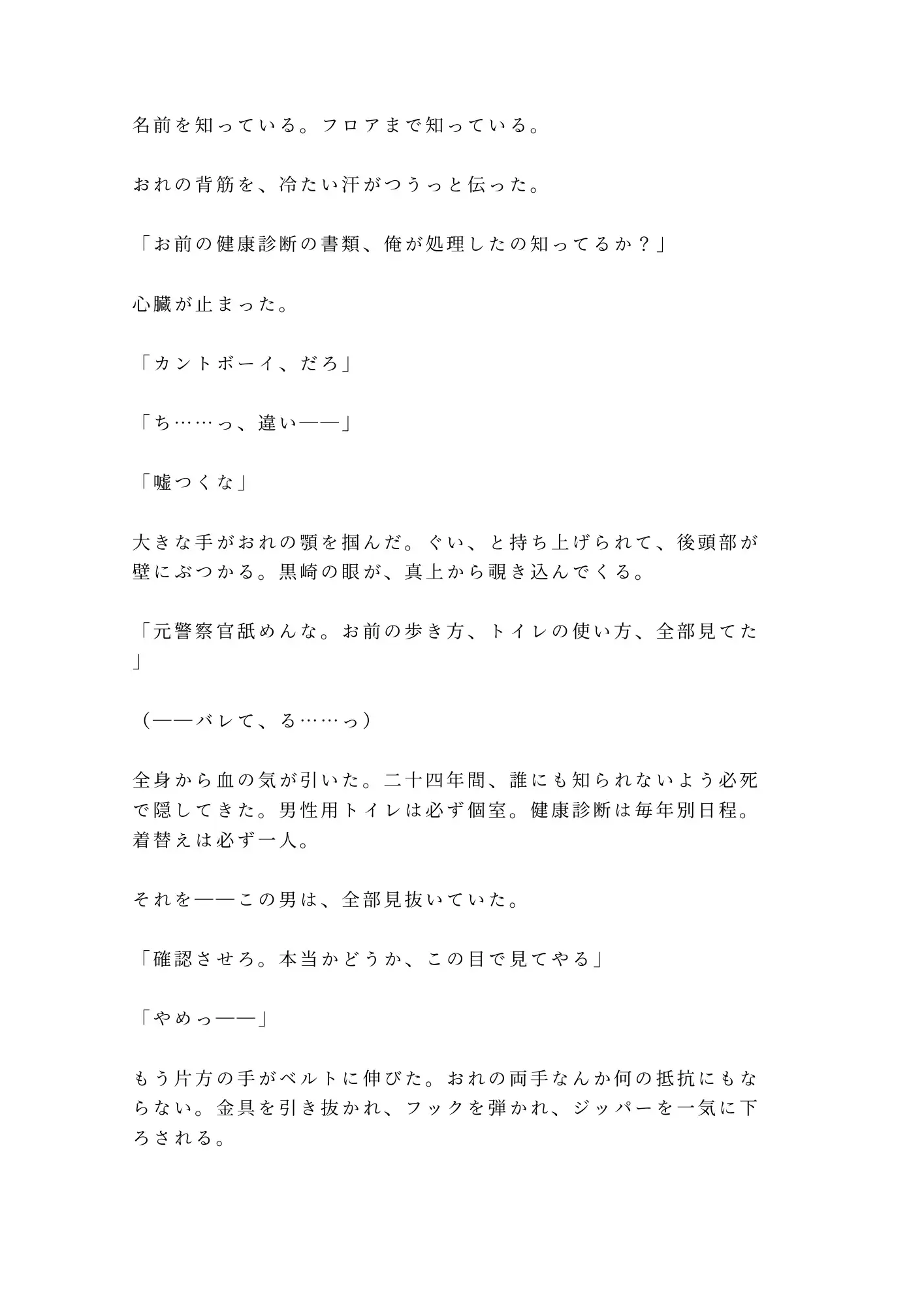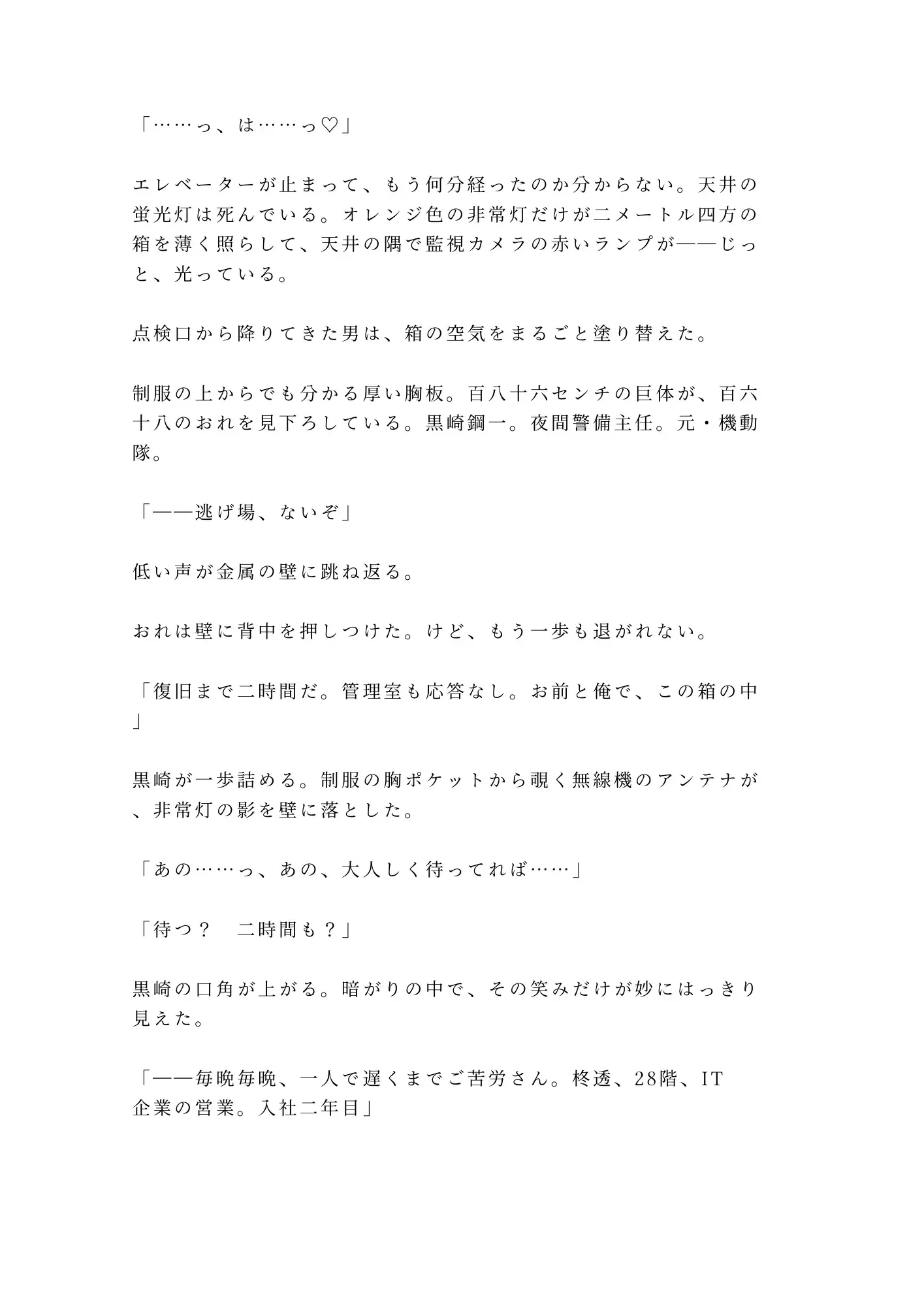 深夜のオフィスビル、突然の停電。エレベーターという逃げ場のない密室に閉じ込められたのは、誰にも秘密を明かせずに生きてきた二十四歳の営業マン・柊透と、元機動隊の夜間警備主任・黒崎鋼一。百八十六センチの巨躯が二メートル四方の箱を支配したとき、透の人生は一変する。「カントボーイ、だろ」——健康診断の書類、トイレの使い方、歩き方。元警察官の観察眼は、透が二十四年間必死に隠し続けてきた身体の秘密をとうに見抜いていた。非常灯のオレンジだけが照らす密室で、天井の監視カメラの赤いランプが静かに点灯し続ける中、透の最後の砦が剥がされていく。