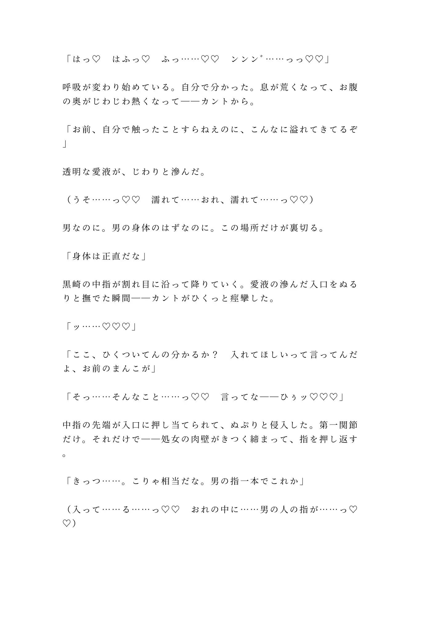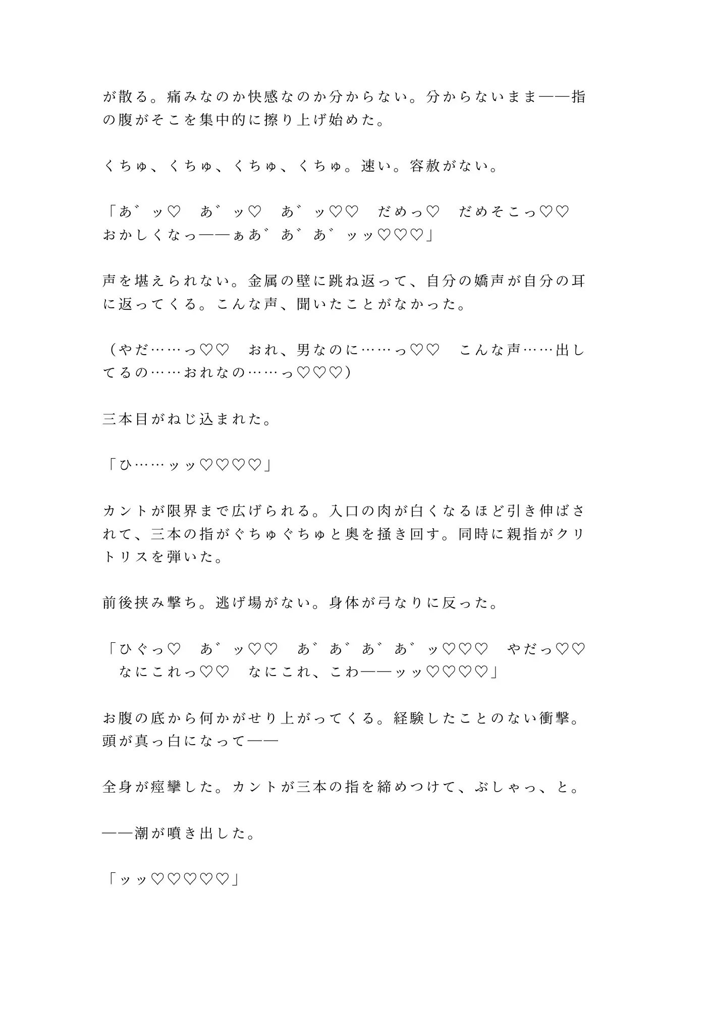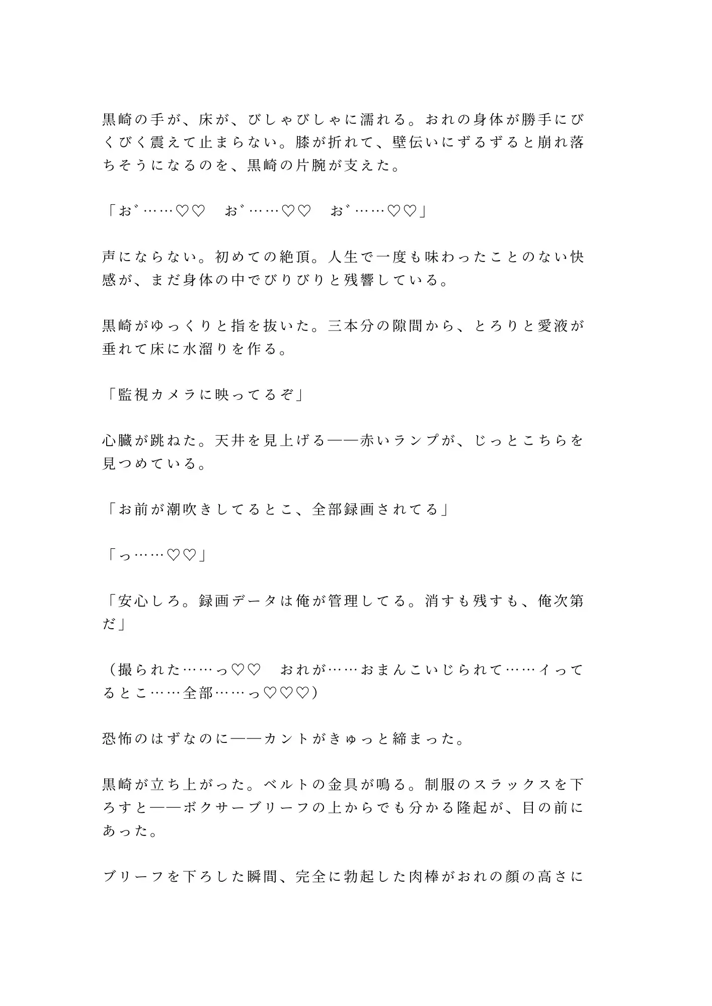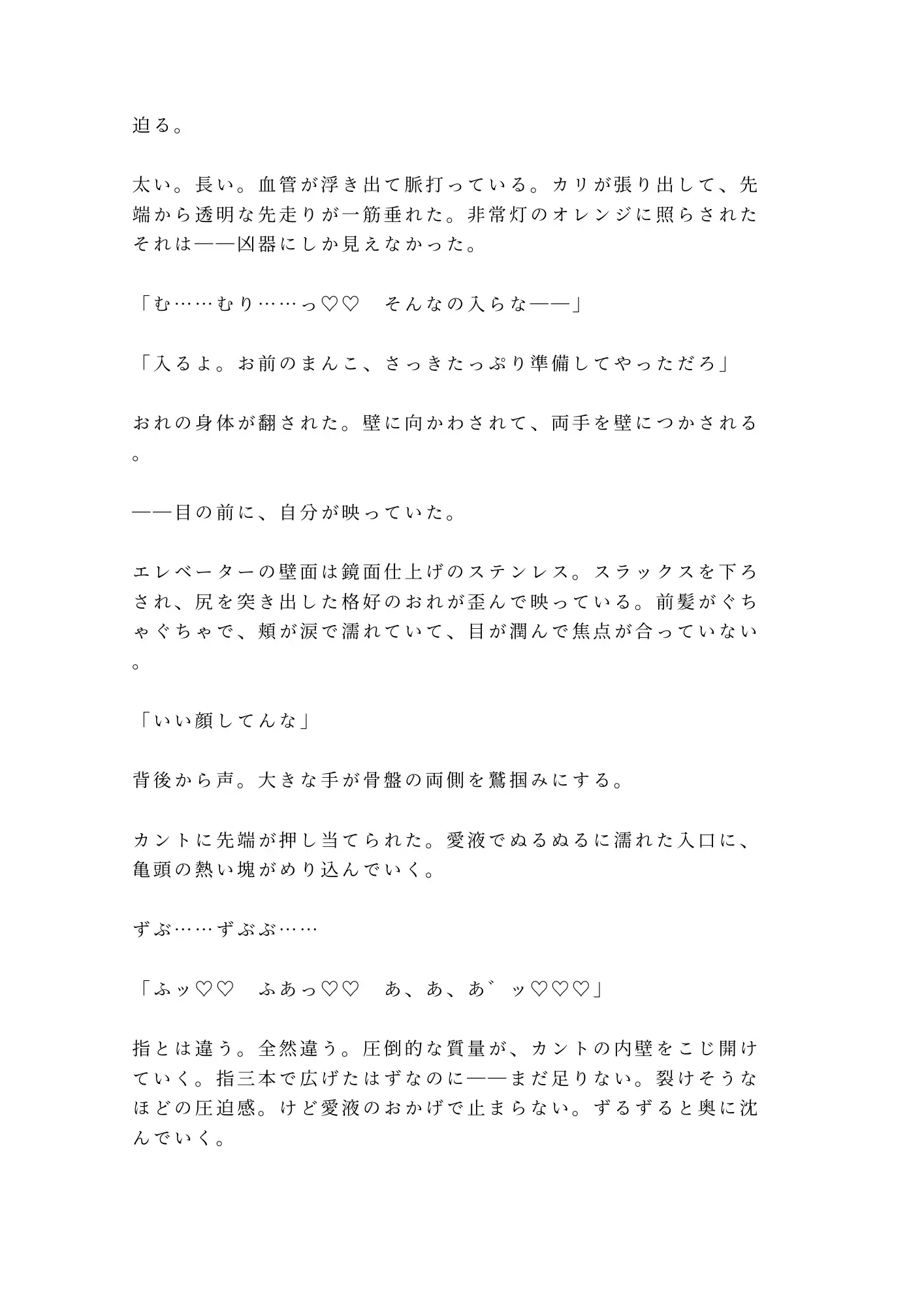 深夜のオフィスビル、突然の停電。エレベーターという逃げ場のない密室に閉じ込められたのは、誰にも秘密を明かせずに生きてきた二十四歳の営業マン・柊透と、元機動隊の夜間警備主任・黒崎鋼一。百八十六センチの巨躯が二メートル四方の箱を支配したとき、透の人生は一変する。「カントボーイ、だろ」——健康診断の書類、トイレの使い方、歩き方。元警察官の観察眼は、透が二十四年間必死に隠し続けてきた身体の秘密をとうに見抜いていた。非常灯のオレンジだけが照らす密室で、天井の監視カメラの赤いランプが静かに点灯し続ける中、透の最後の砦が剥がされていく。