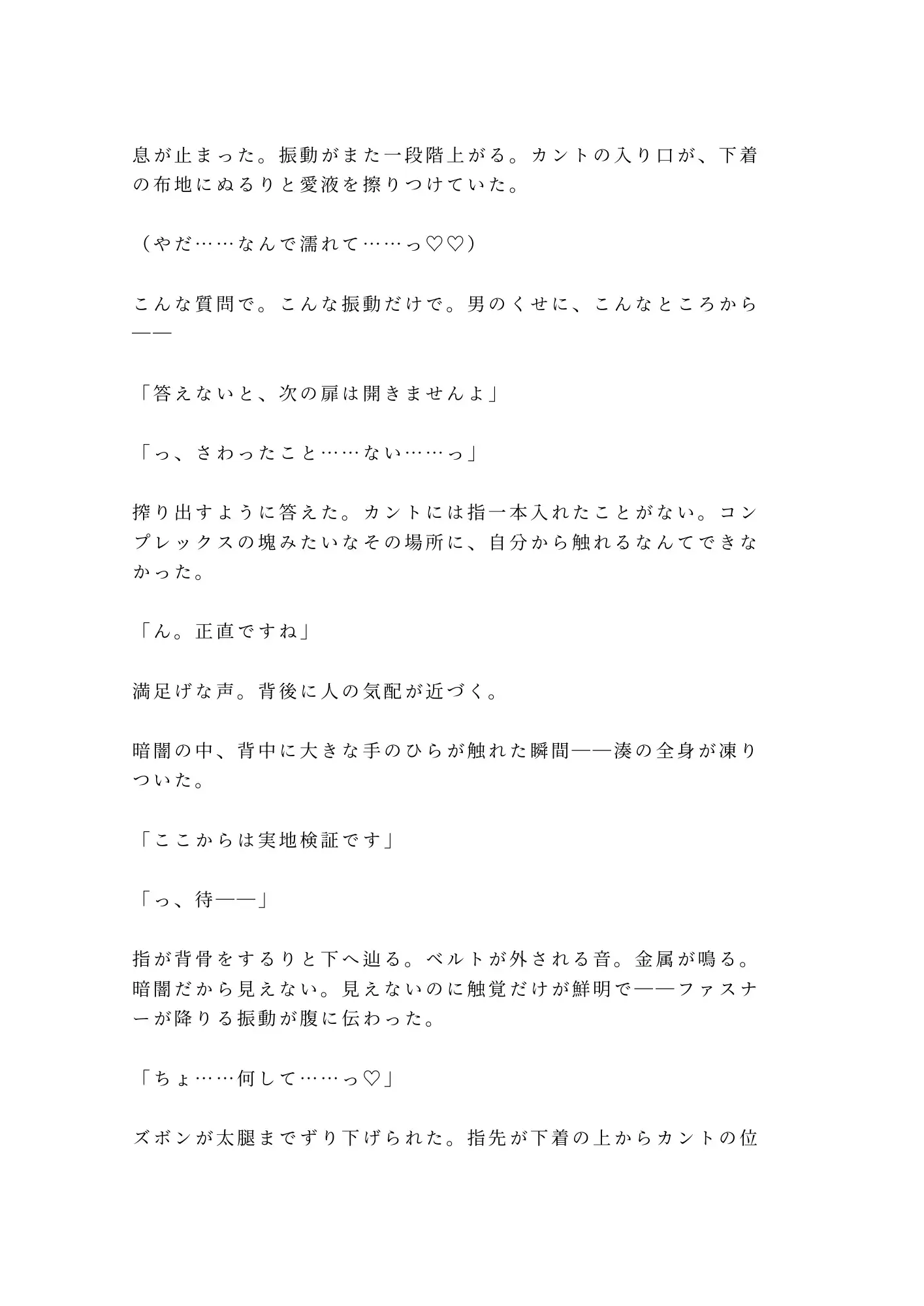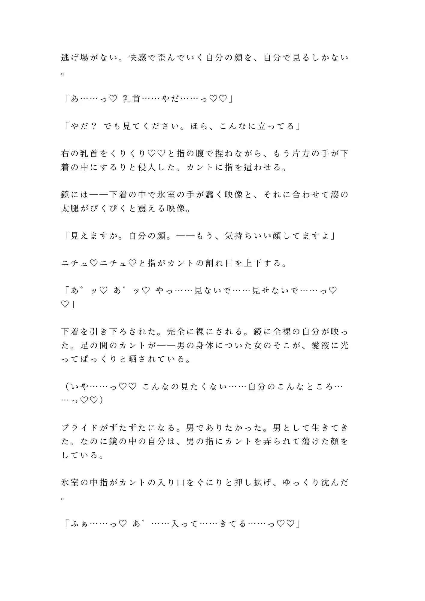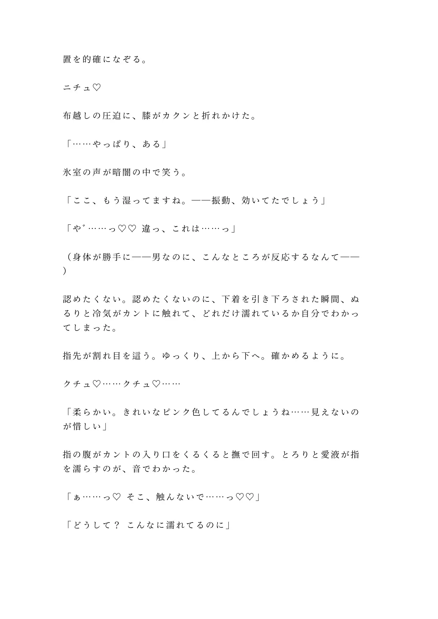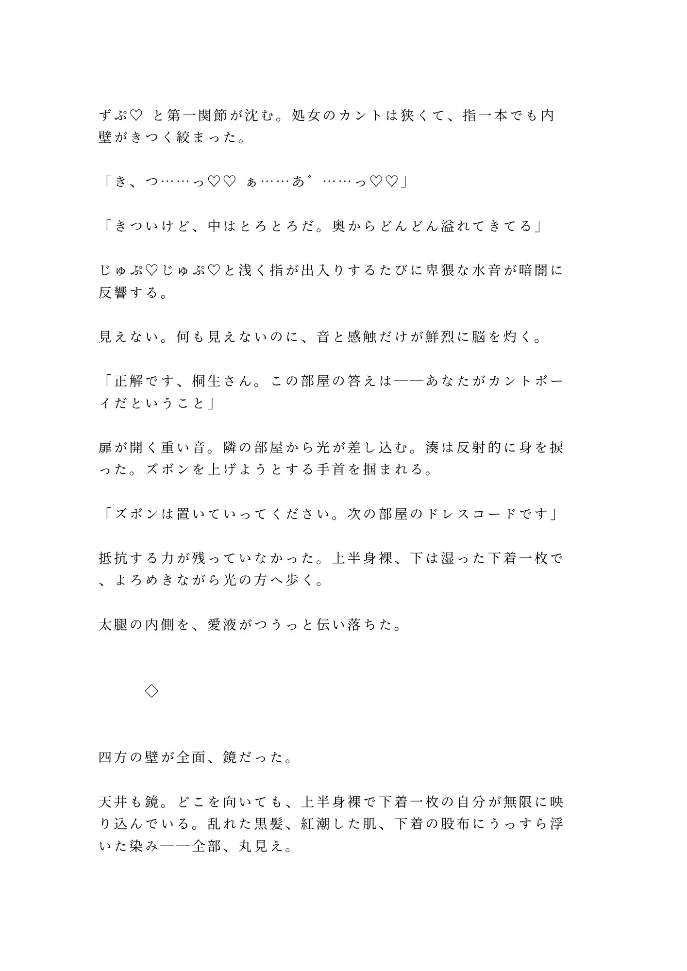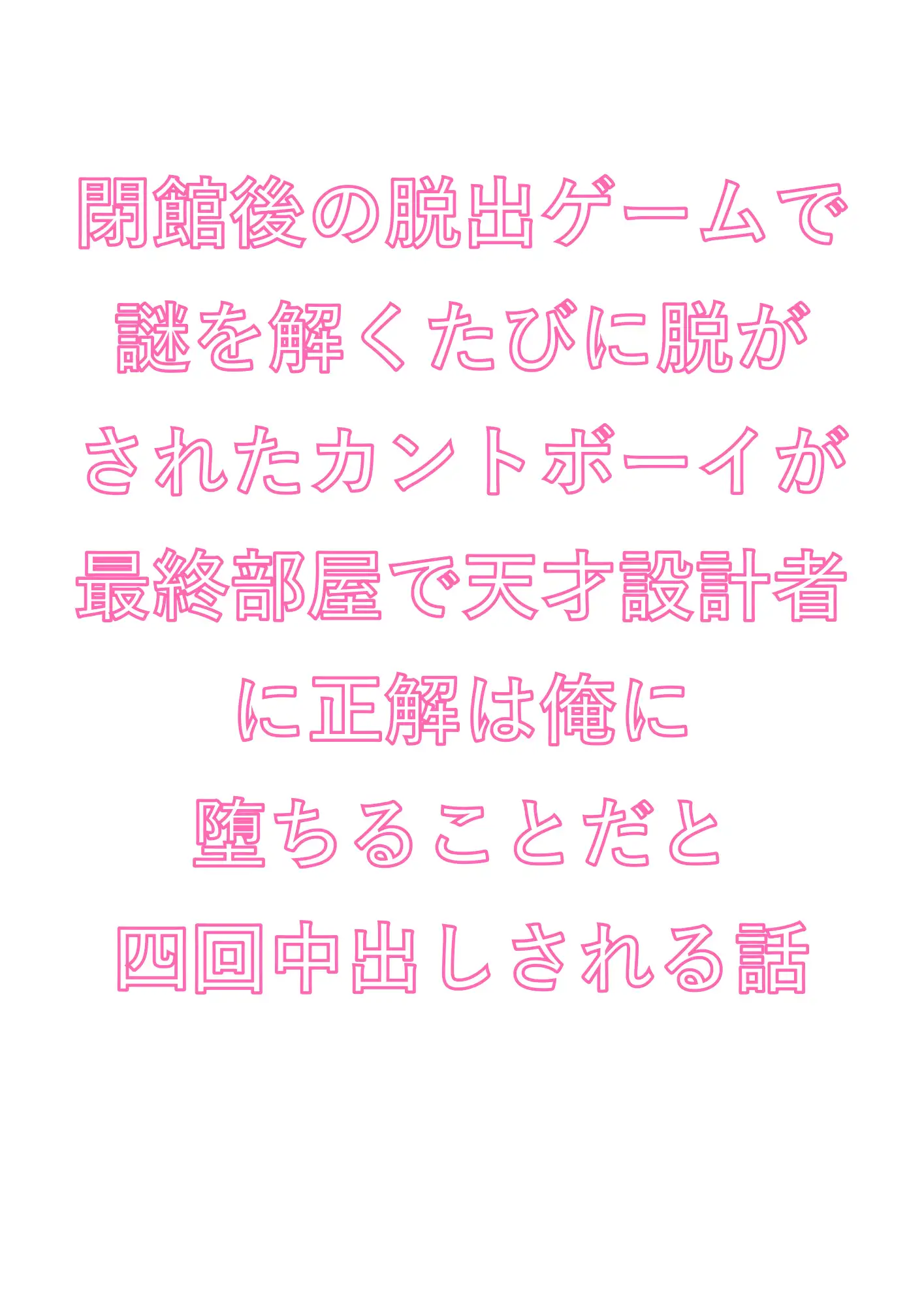 「閉館後、たった一人で挑んだ脱出ゲーム。謎を解くたびに一枚ずつ剥がされていく衣服と理性——その先に待っていたのは、半年間あなたを観察し続けた天才設計者による、逃げ場のない”最終問題”でした。主人公・桐生湊は、パズルと論理を武器に脱出ゲームを攻略してきた常連客。誰にも明かしていない秘密がひとつ——男の身体にカントを持つ”カントボーイ”であること。その秘密を、ゲーム設計者・氷室はとうに見抜いていた。座り方、歩き方、無意識の仕草。半年分の観察眼が、湊だけのために設計された特別な脱出ゲームを生み出す。