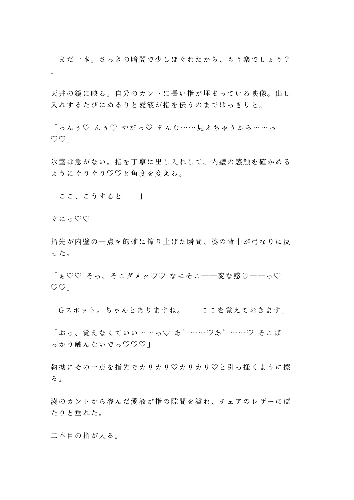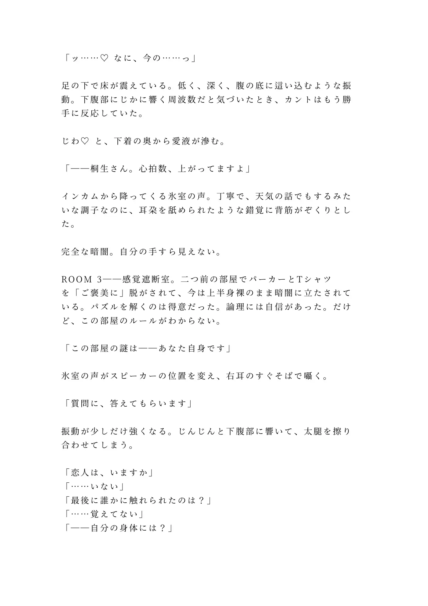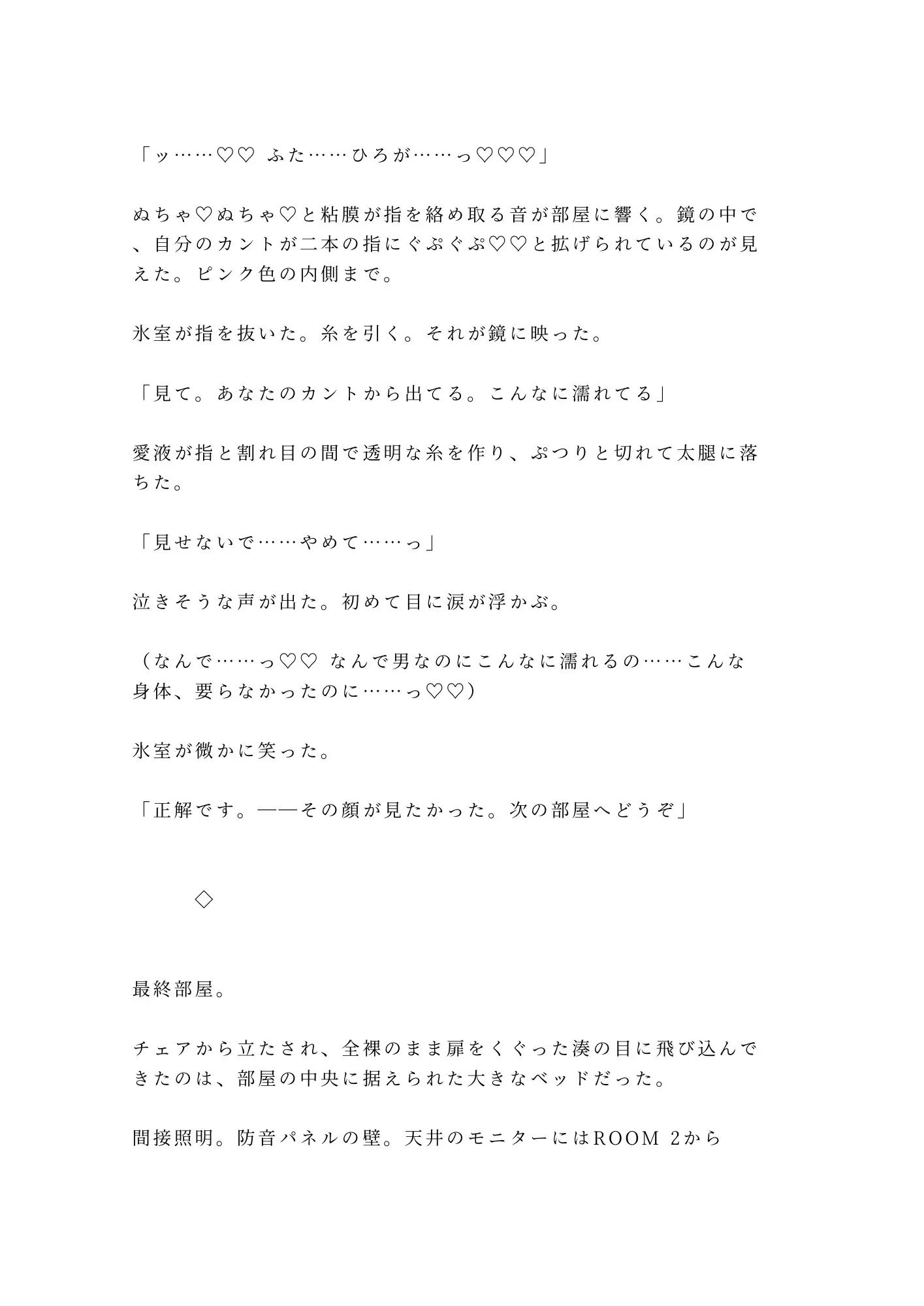 暗闇の感覚遮断室で暴かれる身体の反応。全面鏡の部屋で強○的に見せつけられる、快楽に蕩ける自分の顔。プライドも羞恥心もすべて丸裸にされた先の最終部屋で、氷室が告げる唯一の”正解”——それは、俺に堕ちること。