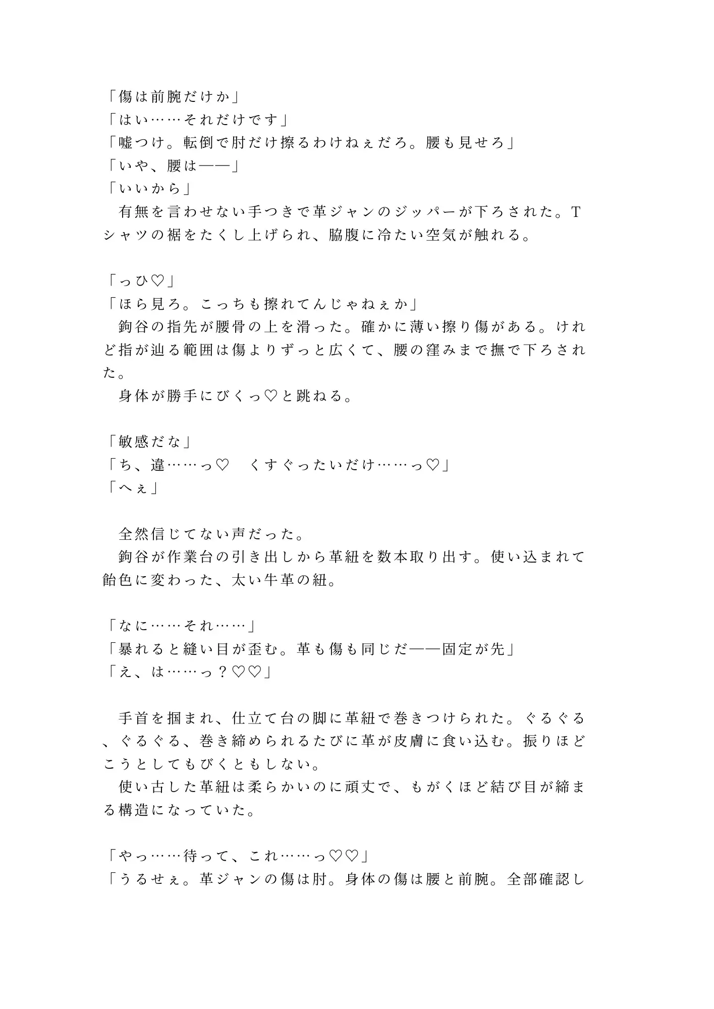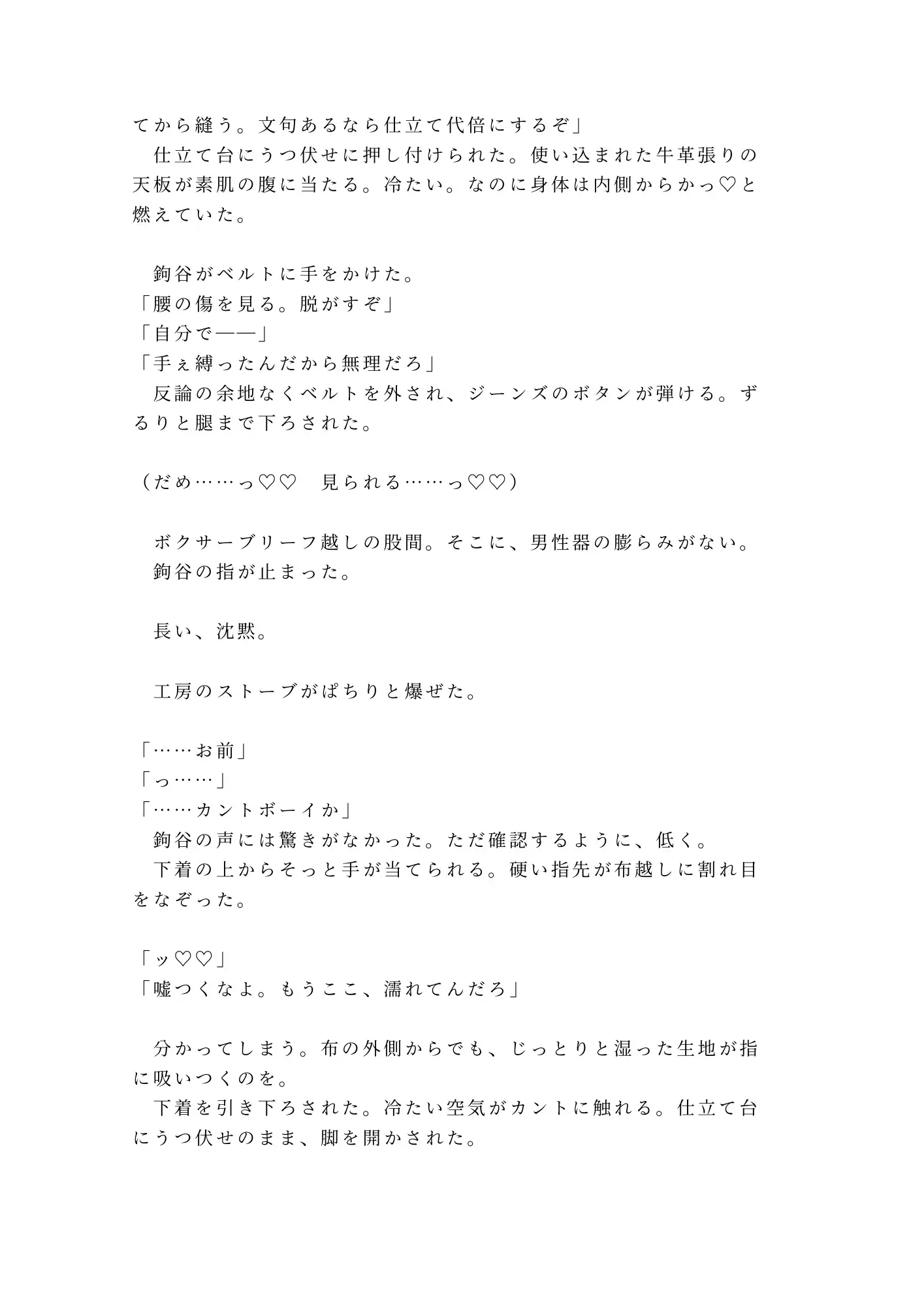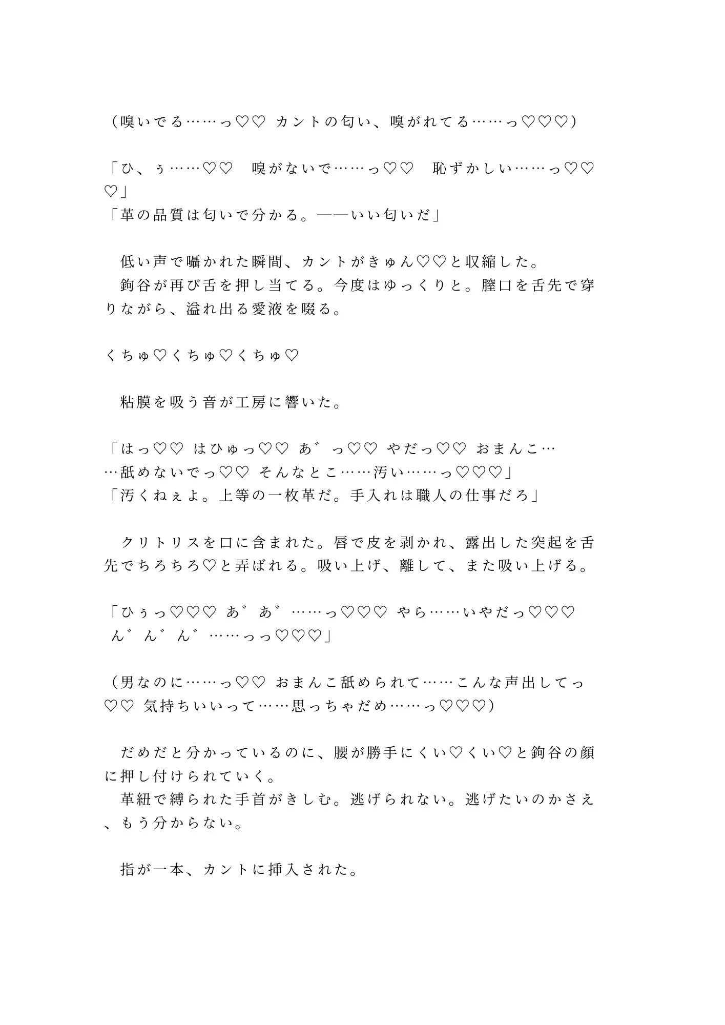 けれど鉤谷は傷を見るなり、消毒液ではなく舌で傷口を舐め、革紐で手首を仕立て台に縛りつけた。「暴れると縫い目が歪む。革も傷も同じだ——固定が先」。有無を言わせない職人の手つきに、抵抗する暇もない。そして暴かれる、誰にも知られたくなかった身体の秘密。ボクサーブリーフの下に男性器はなく——そこにあったのは、すでにとろとろに濡れたカントだった。