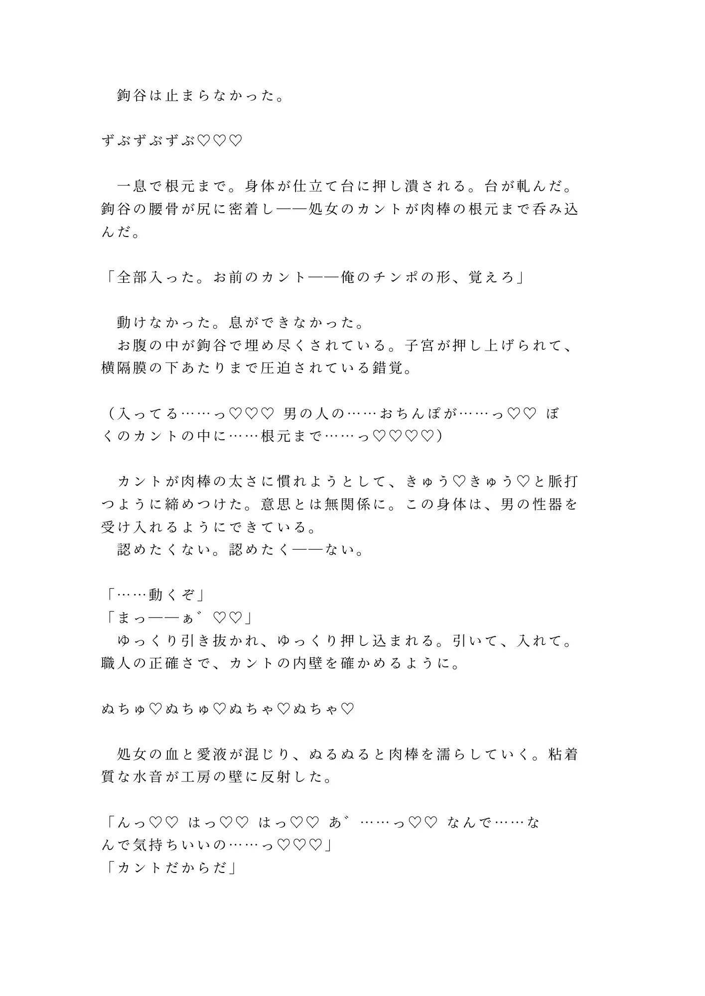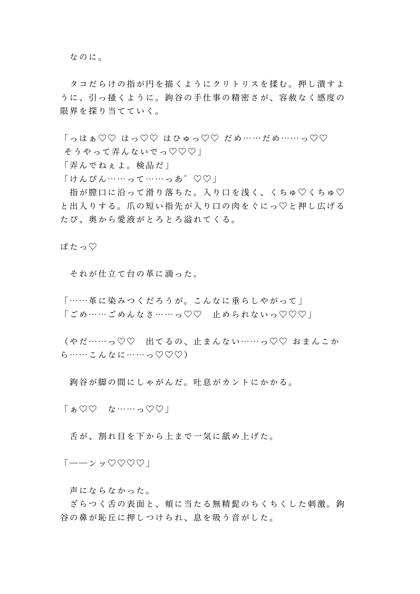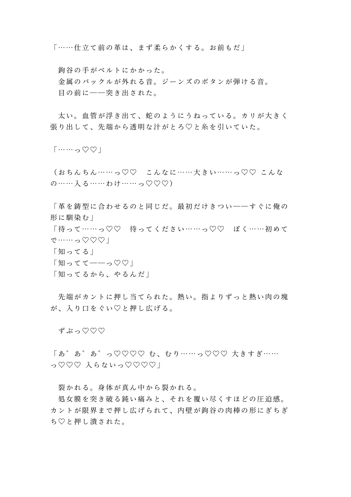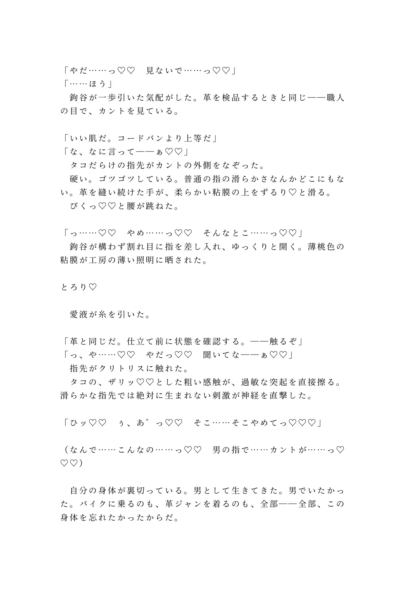 けれど鉤谷は傷を見るなり、消毒液ではなく舌で傷口を舐め、革紐で手首を仕立て台に縛りつけた。「暴れると縫い目が歪む。革も傷も同じだ——固定が先」。有無を言わせない職人の手つきに、抵抗する暇もない。そして暴かれる、誰にも知られたくなかった身体の秘密。ボクサーブリーフの下に男性器はなく——そこにあったのは、すでにとろとろに濡れたカントだった。