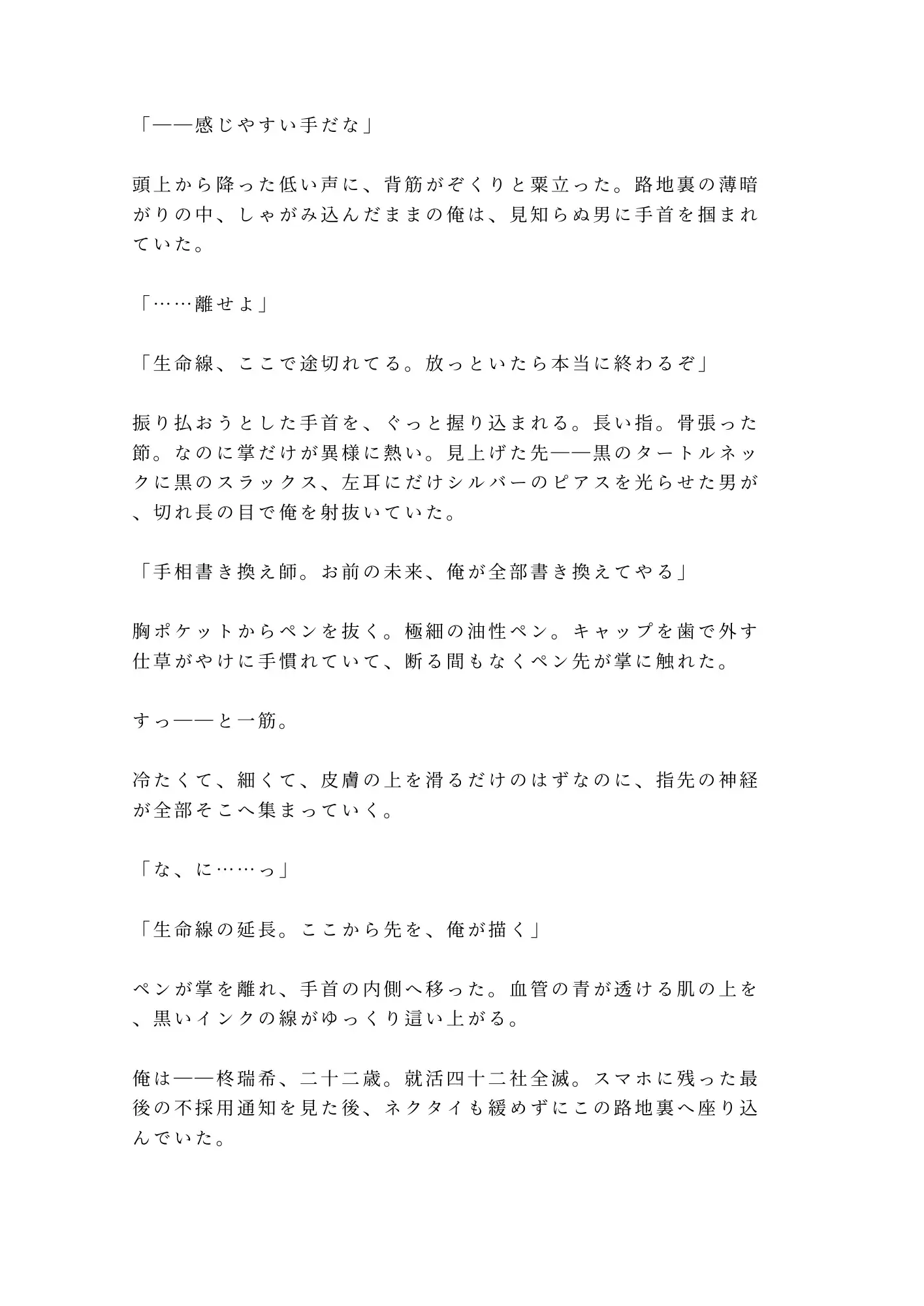 就活四十二社全滅。内定ゼロ。奨学金の返済は目前——。すべてに絶望して路地裏に座り込んでいた大学生・柊瑞希の手首を掴んだのは、「手相書き換え師」を名乗る謎の男・鶴見蓮だった。「生命線、ここで終わってるな」