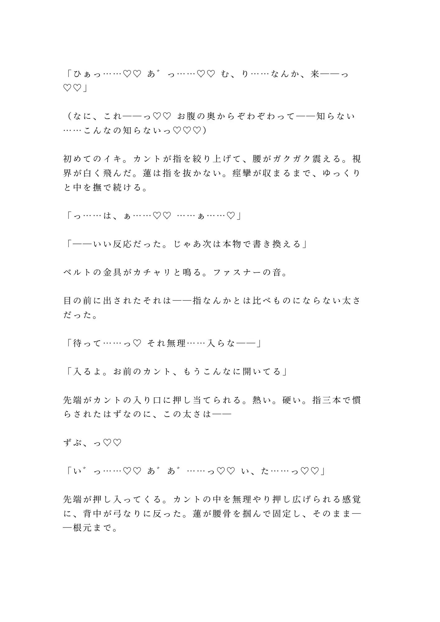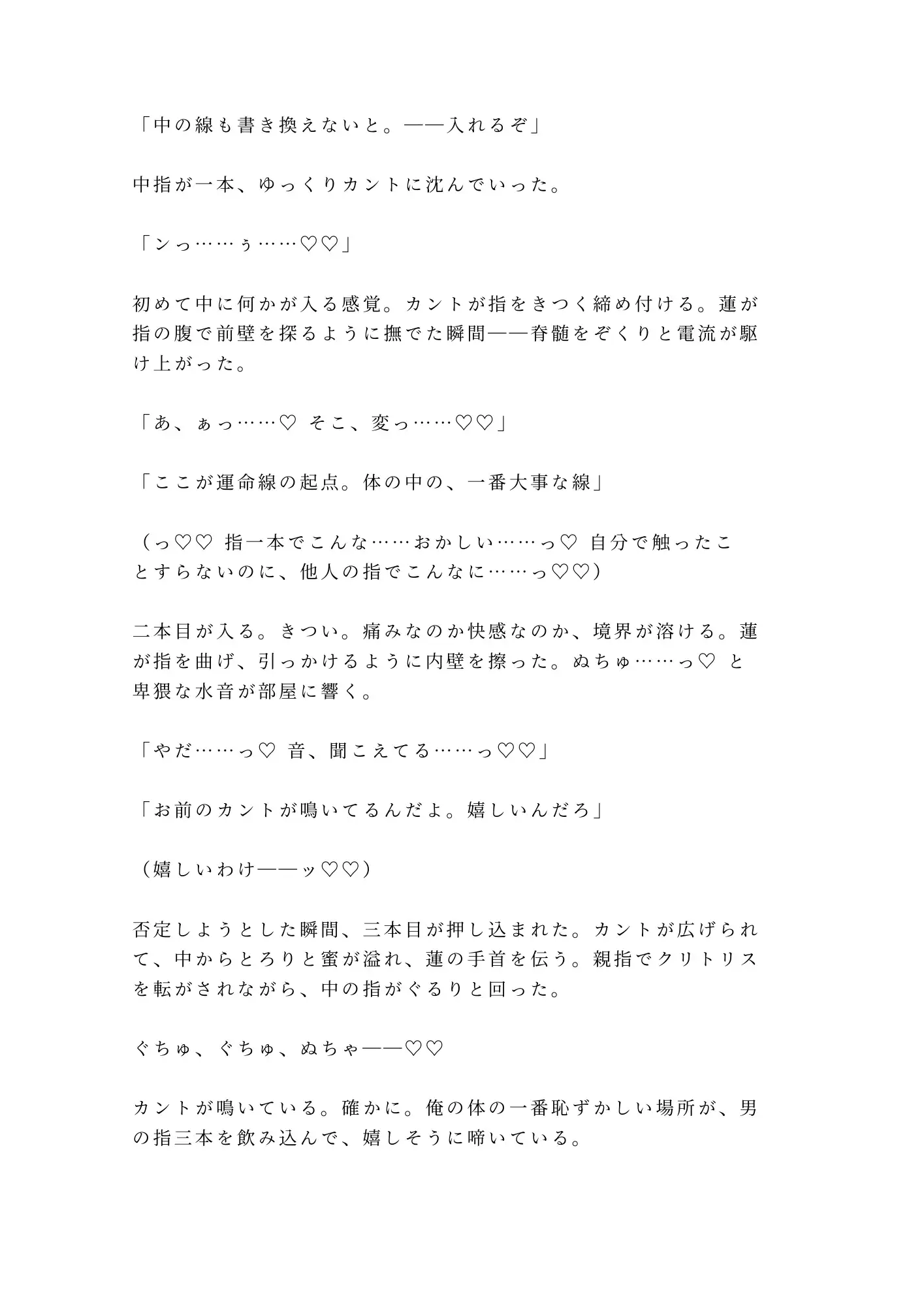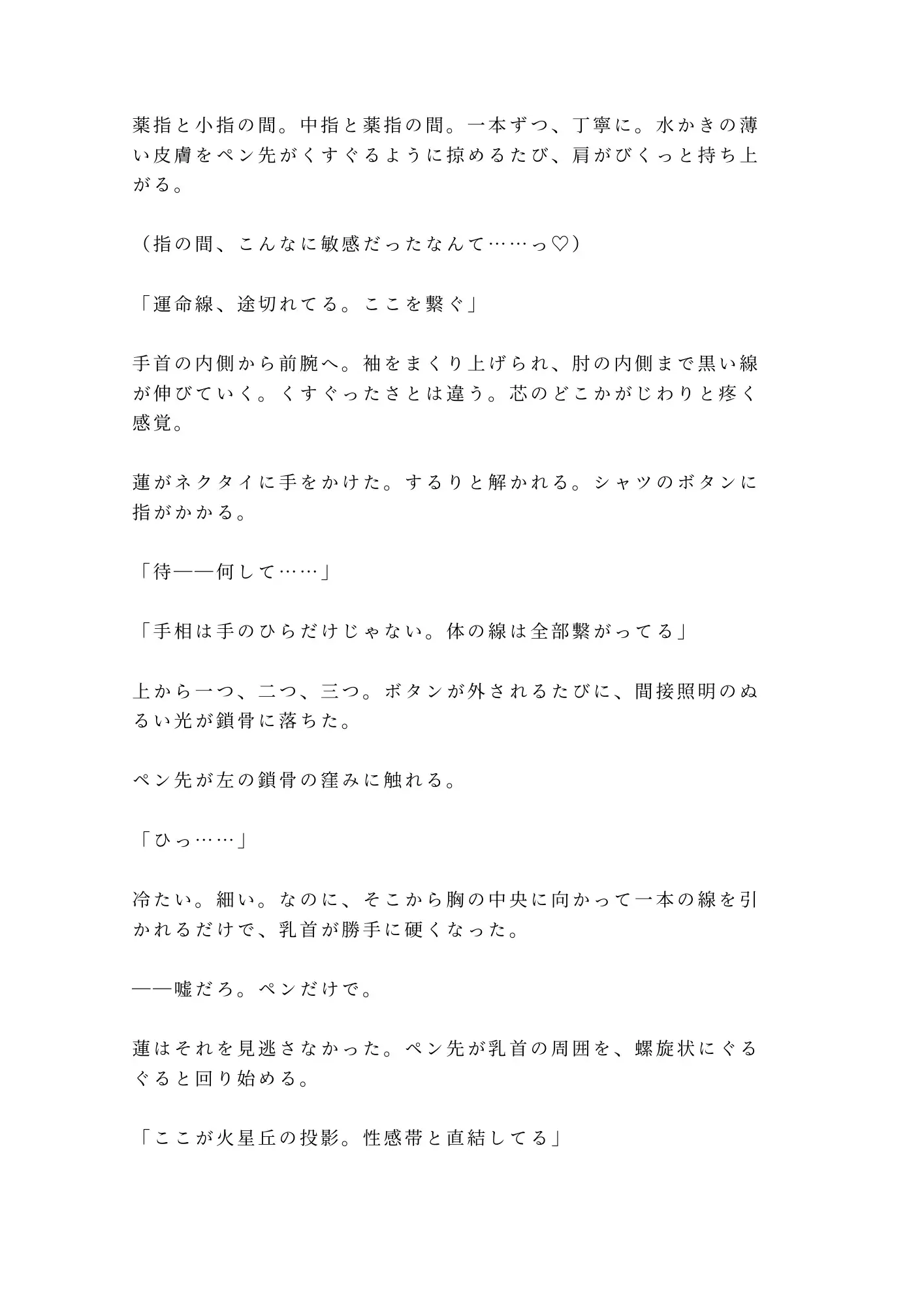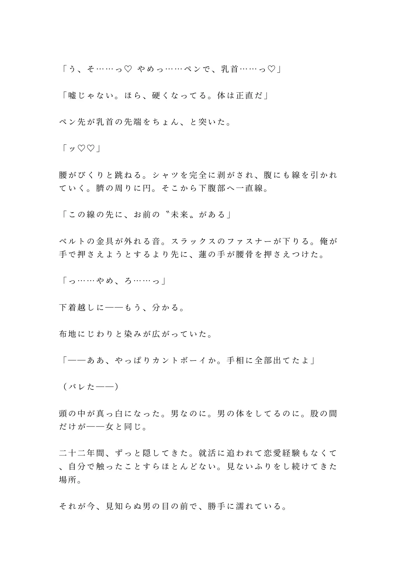 極細の油性ペンで掌に線を引かれた瞬間から、瑞希の体は知らない反応を返し始める。掌から手首へ、鎖骨へ、乳首へ——ペン先が肌を這うだけで全身の神経が一点に集まっていく異常な感覚。そして蓮の手は、瑞希が二十二年間ずっと隠し続けてきた秘密にまで辿り着く。