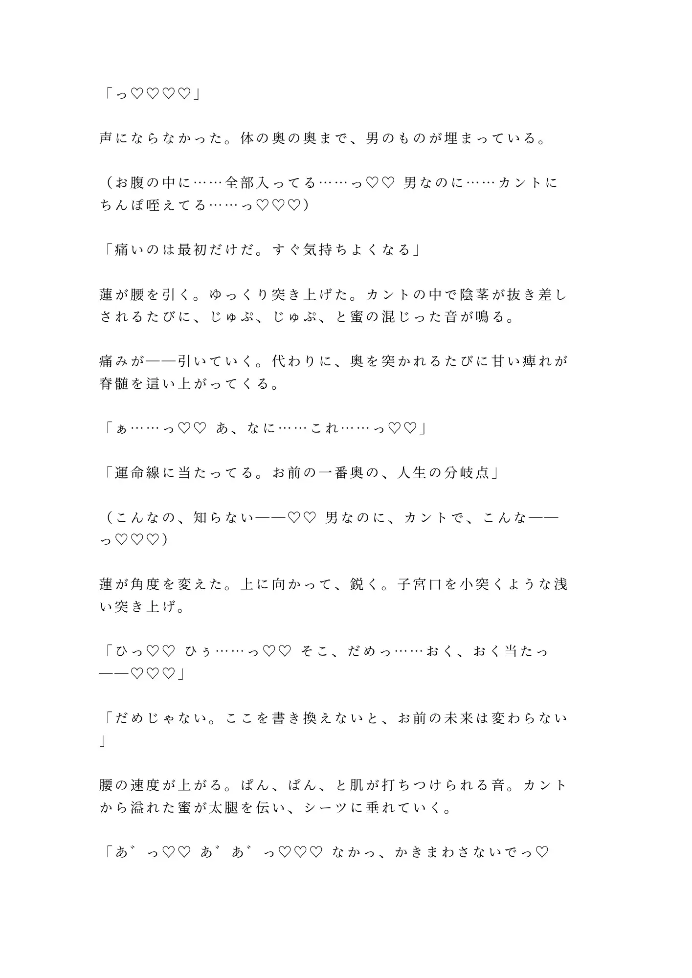 誰にも知られたくなかった体の秘密を暴かれ、触れたことすらなかった場所を「書き換え」と称して開発されていく屈辱と快楽。生命線、感情線、運命線——体中に引かれた黒いインクの線を、三度の中出しで白く塗り潰されるまで、瑞希の理性は一本ずつ断ち切られていく。