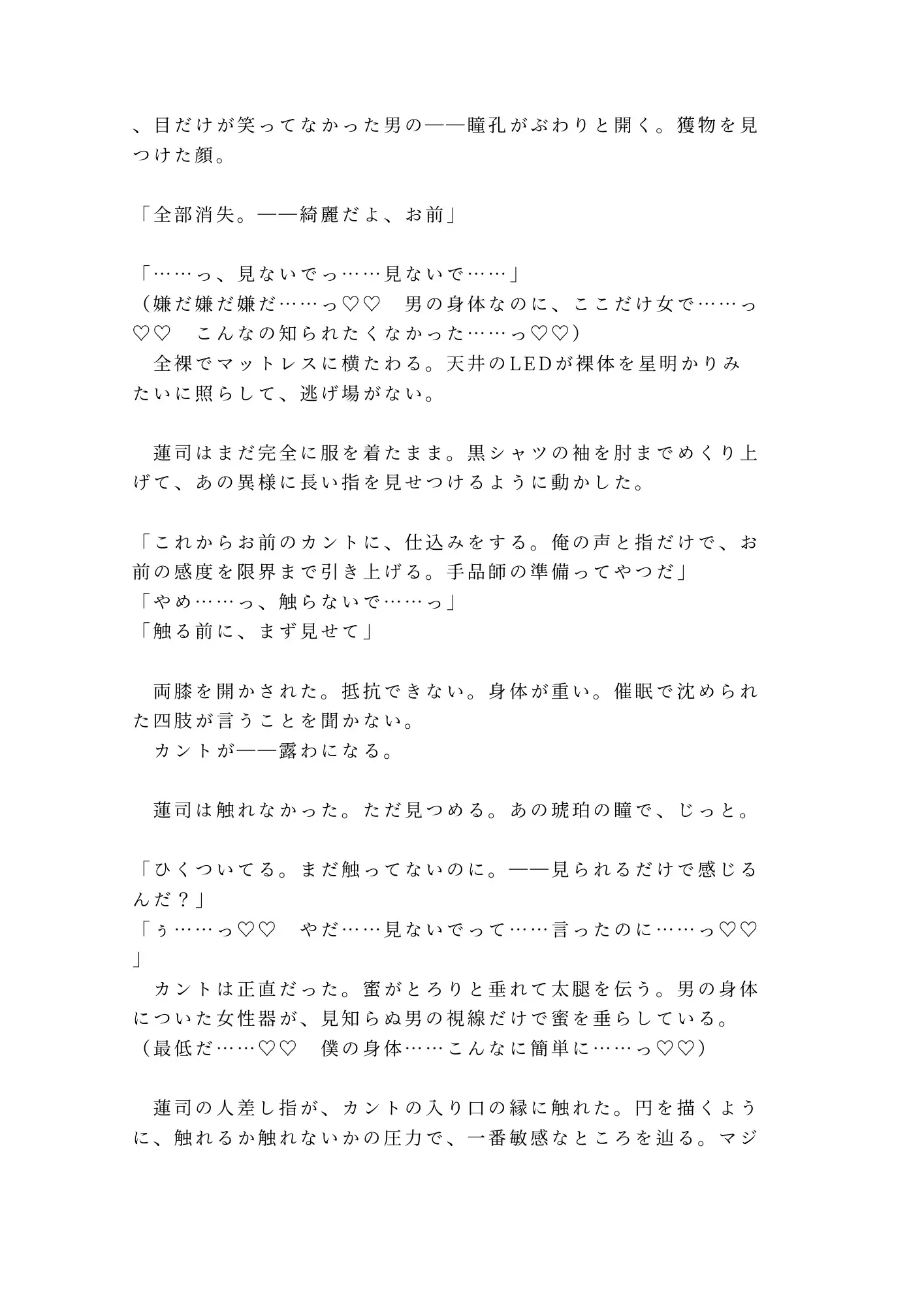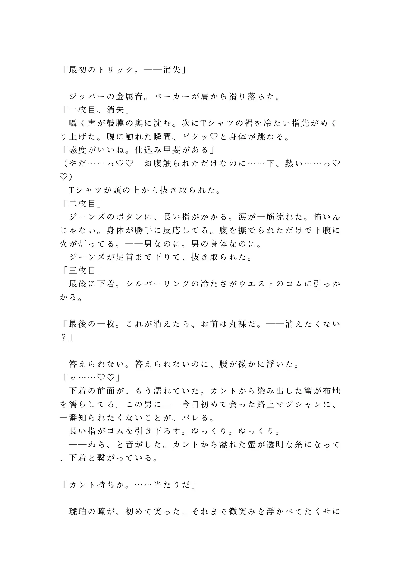 催○で身体の自由を奪われ、服を一枚ずつ”消失”させられていく。マジシャンの異様に長い指が暴いたのは、男の身体に隠された秘密——誰にも知られたくなかったカント。「当たりだ」と瞳孔を開いた蓮司の目は、もう笑っていなかった。獲物を見つけた獣の目だった。