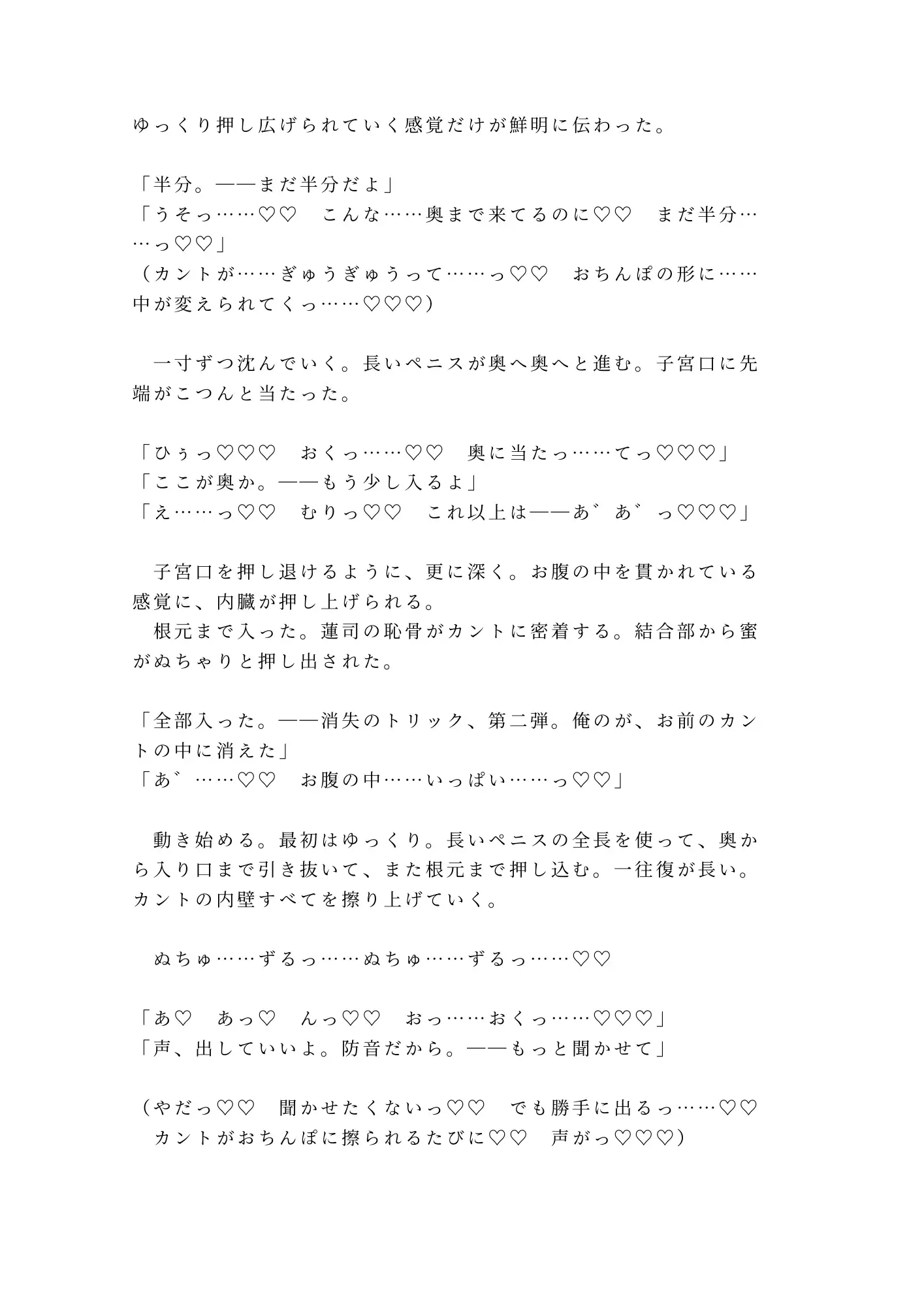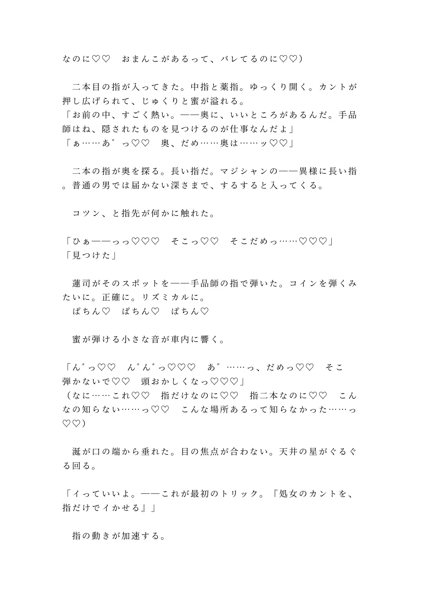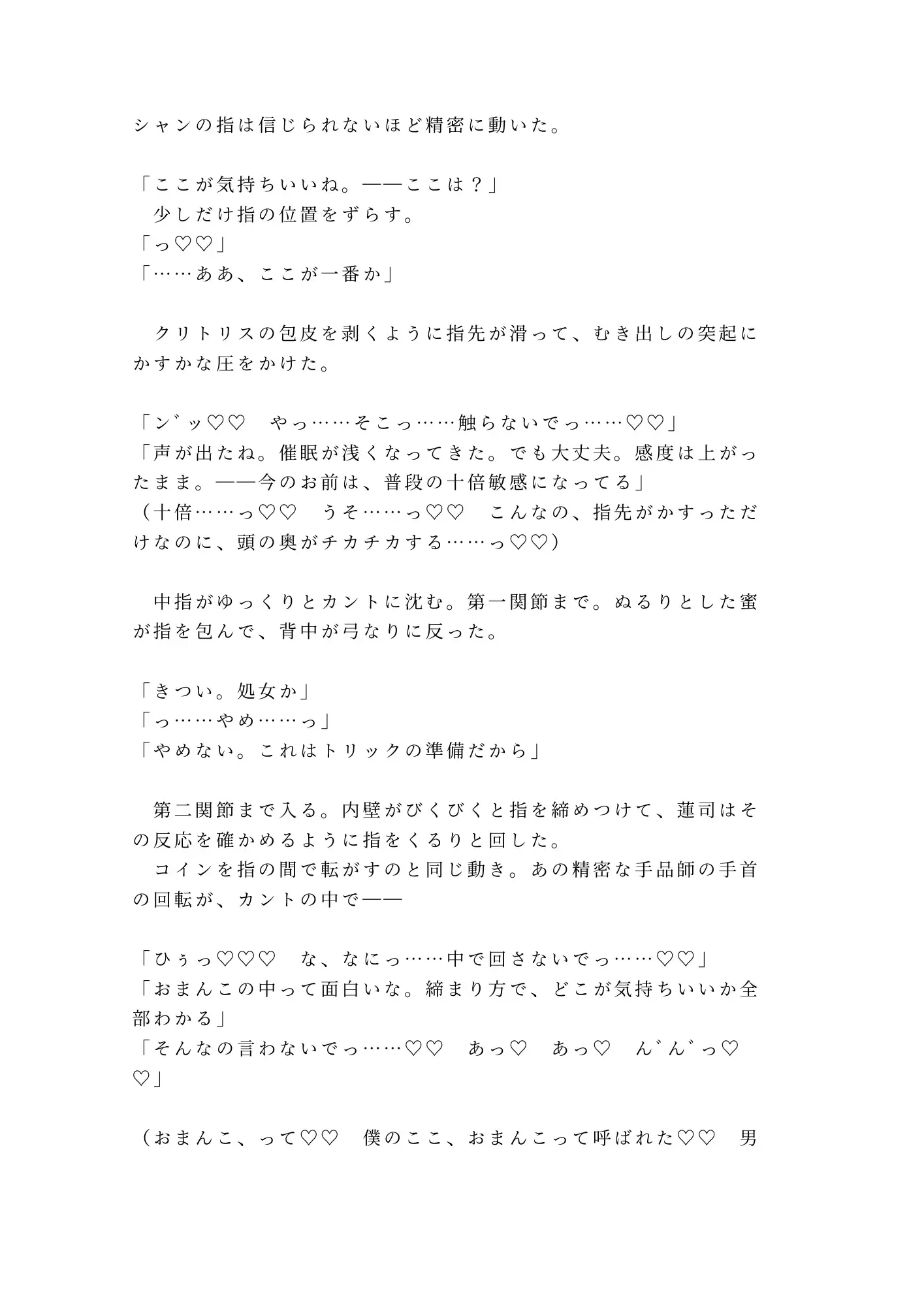 本作の見どころは、手品師という職業設定を性技に直結させた独自のシチュエーション。コインロールと同じ精密さでカントの奥を弾く指、観客にリクエストを言わせるショーマンシップで卑猥な台詞を強要する話術——蓮司のすべてが「舞台装置」として機能し、読む側の脳まで催○にかけてくる。
