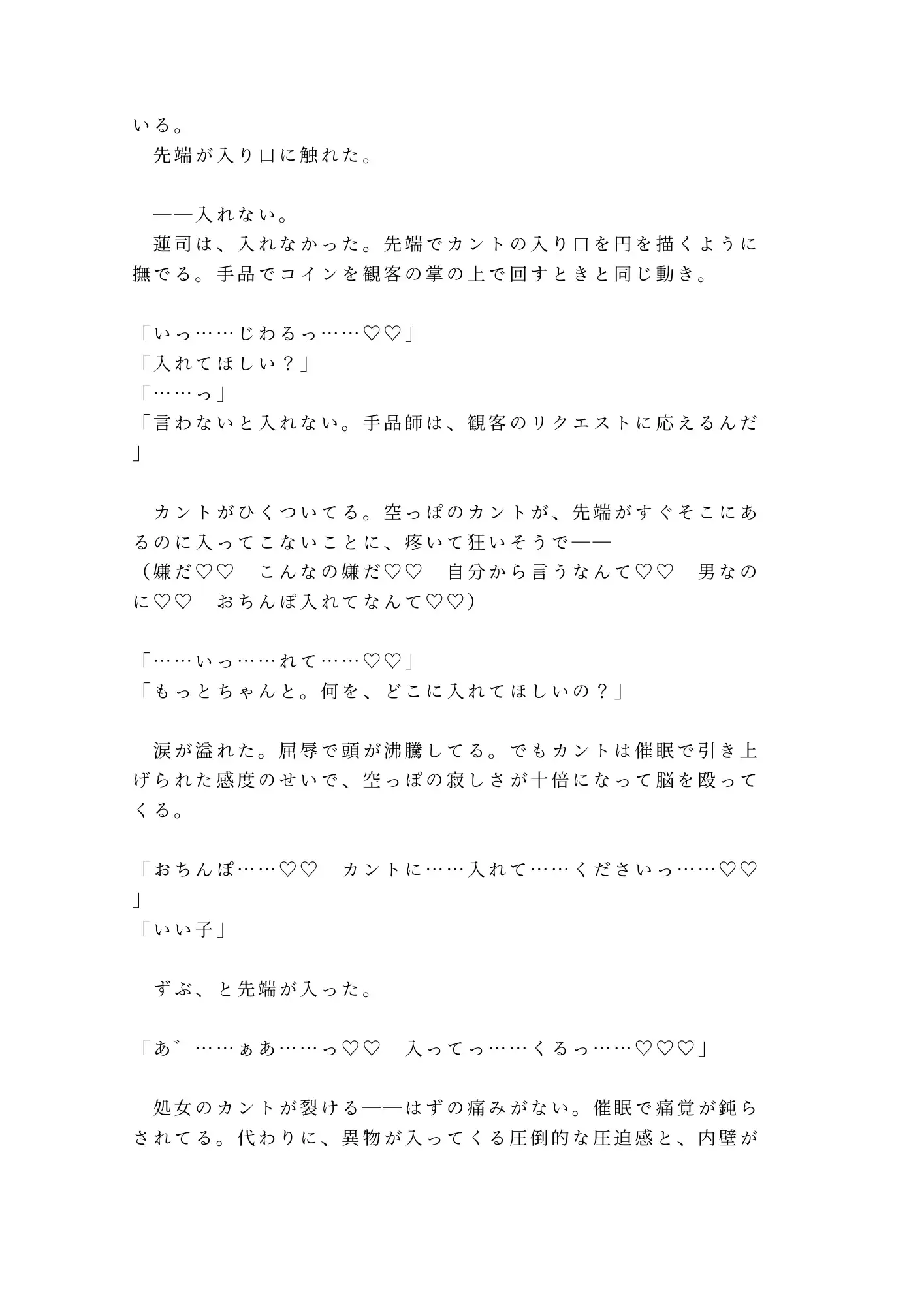 コインを弾くように正確な指技で処女のカントを開発され、「入れてください」と自分から懇願させられ、四回の中出しで完全に堕とされる。催○で感度を十倍に引き上げられた身体は、抵抗する理性ごと蕩けていく。