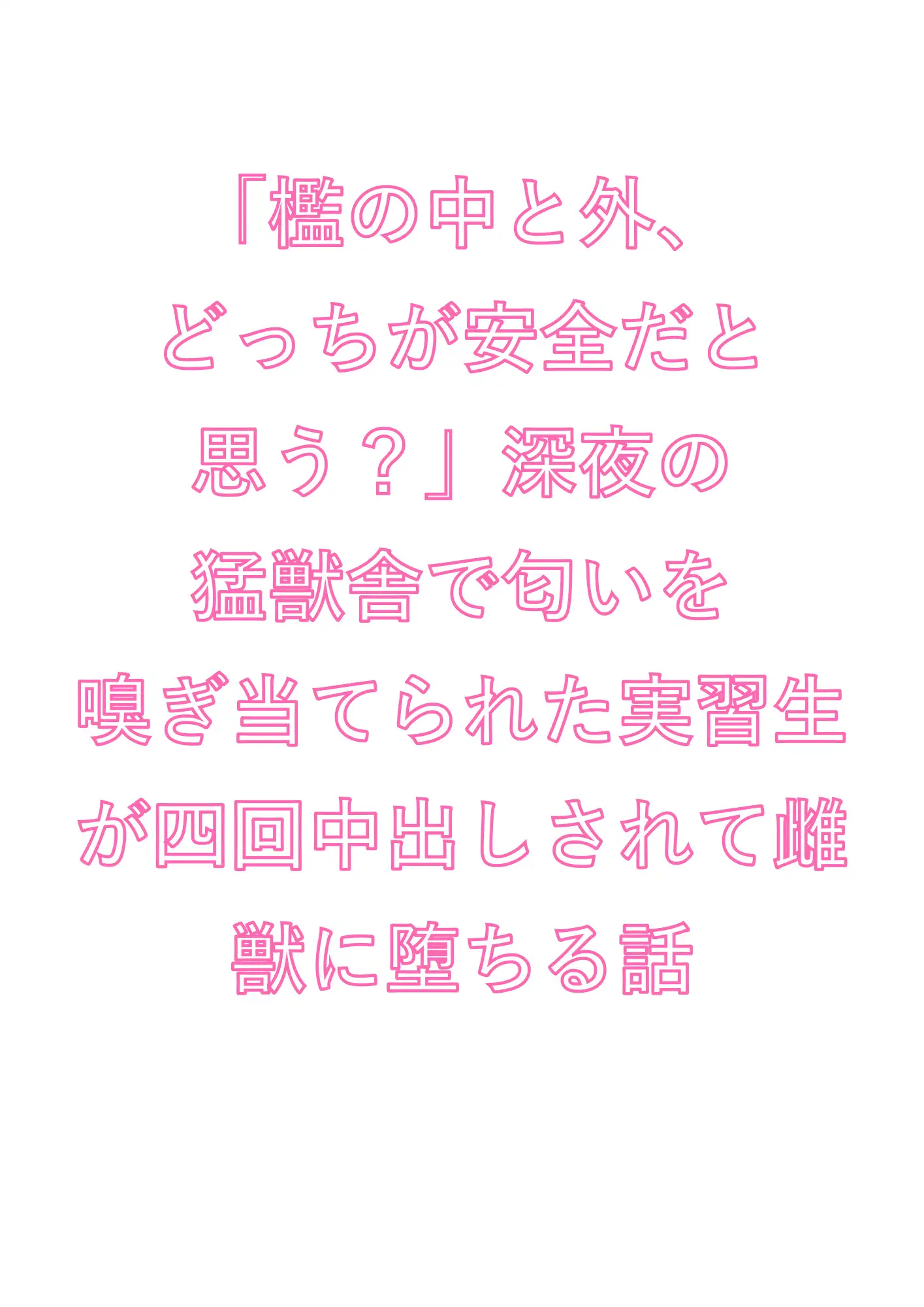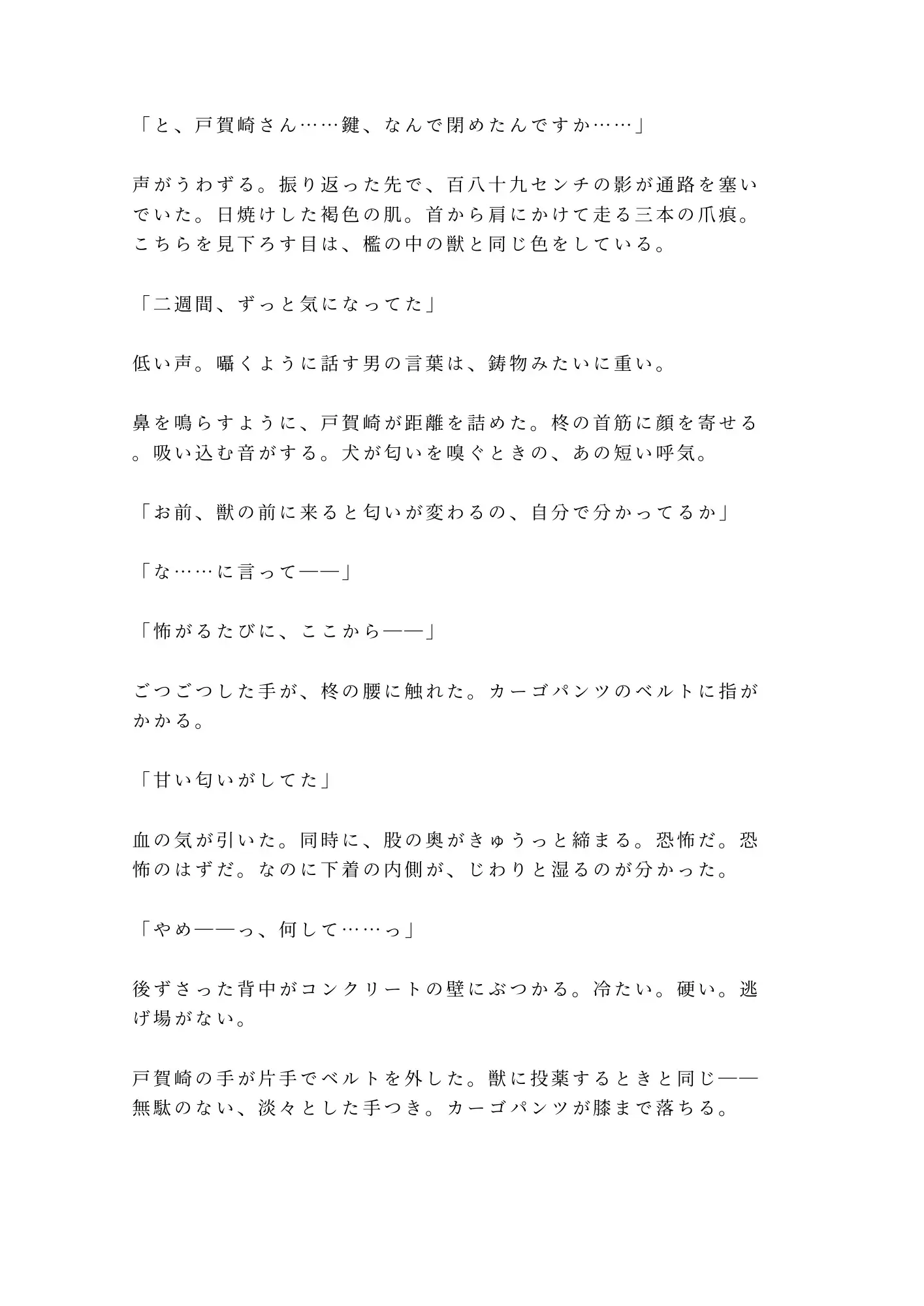 深夜の動物園。猛獣舎の通路に鍵がかかった瞬間、実習生・柊の日常は終わりを告げた。背後に立つのは飼育員・戸賀崎。百八十九センチの褐色の肌に、猛獣につけられた三本の爪痕。この男は二週間前から気づいていた——柊が獣の前で怯えるたびに、身体の奥から漏れ出す「甘い匂い」に。