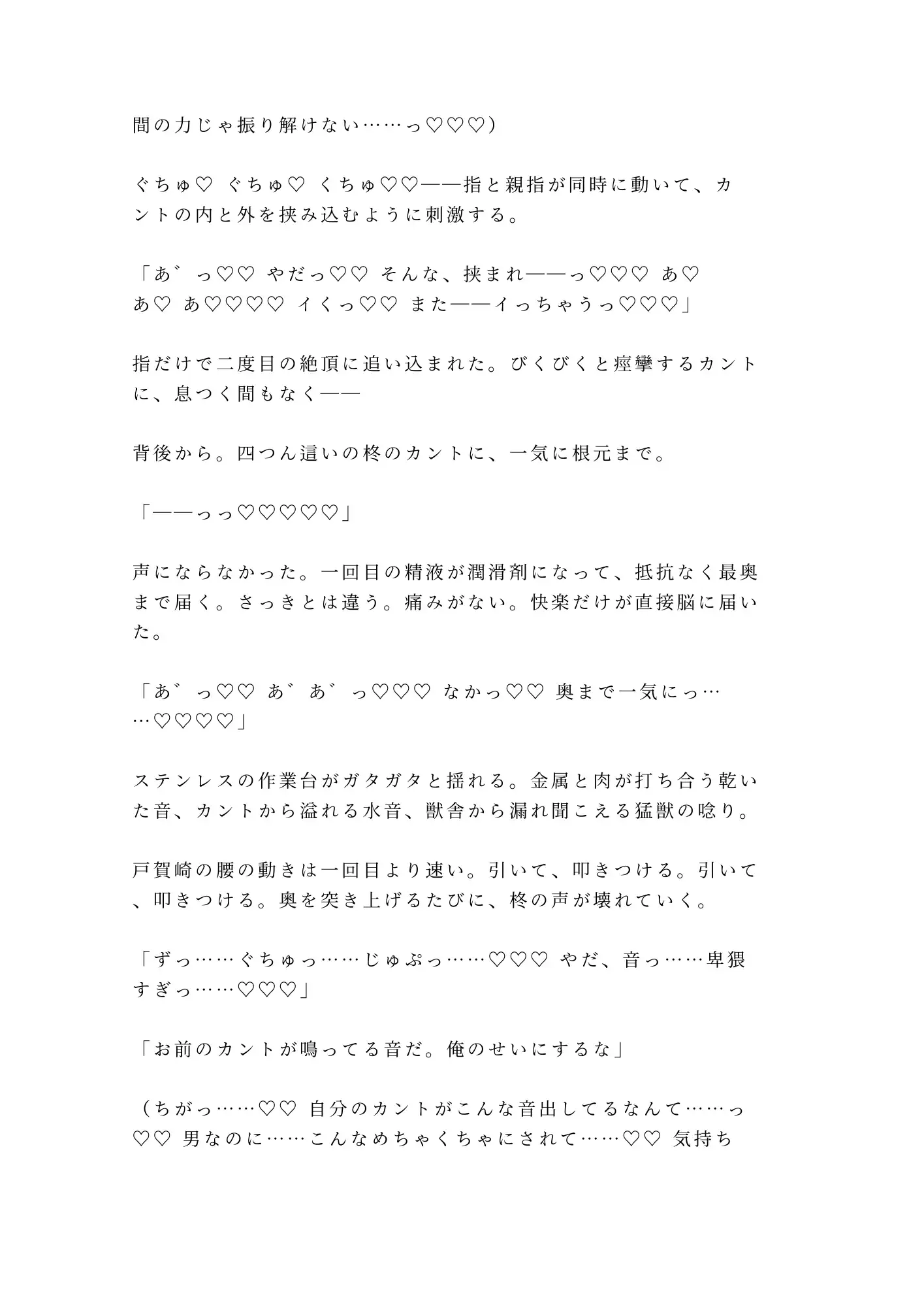 誰にも見せたことのない秘密の場所を、獣を扱う無骨な手で暴かれる。コンクリートの壁に磔にされた一回目。蛍光灯に照らされたステンレスの作業台での二回目。回を重ねるごとに壊されていく理性と、それに反比例して高まっていく身体の渇き。「検査だ」「経過観察が必要だ」——飼育日誌に書き込むような淡々とした声で、柊の身体の反応をひとつひとつ記録していく戸賀崎の冷静さが、かえって背筋を震わせる。