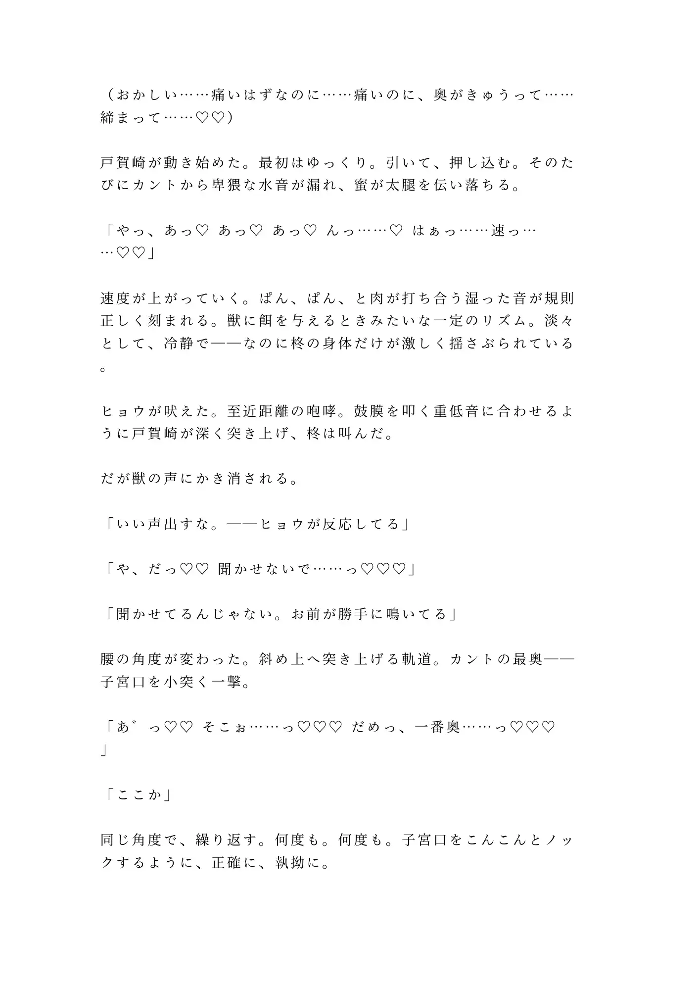 隣の檻ではヒョウが唸り、ハイエナが興奮に身を揺らす。獣たちが反応するほどの嬌声を上げている自分に気づいたとき、柊はもう「人間」には戻れなくなっていた。
