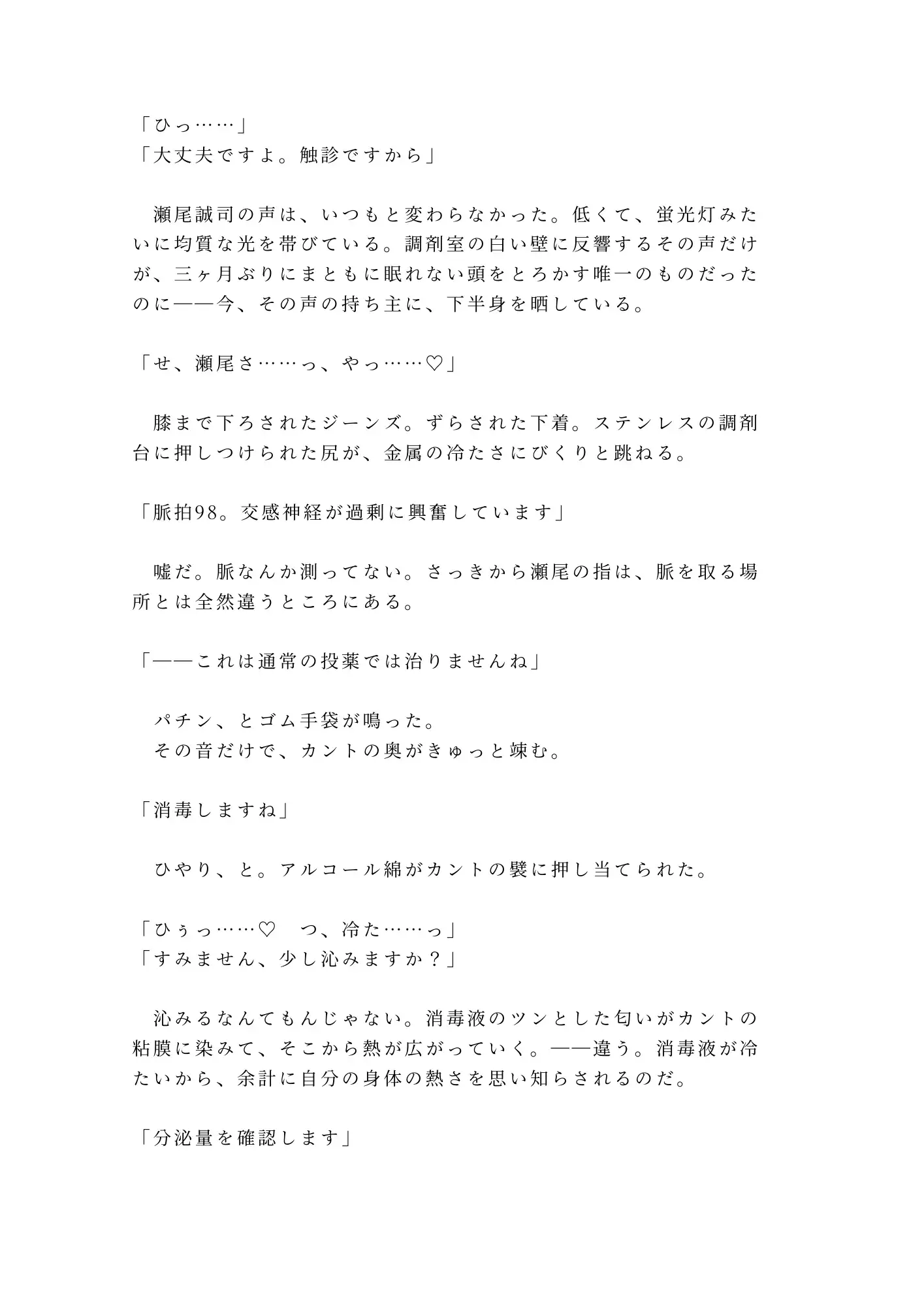 知的で冷静な攻め×自分の身体を受け入れられない受け。医療プレイ×カントボーイ。「嘘だと分かっているのに気持ちいい」、その背徳ごと呑み込まれたい方に。