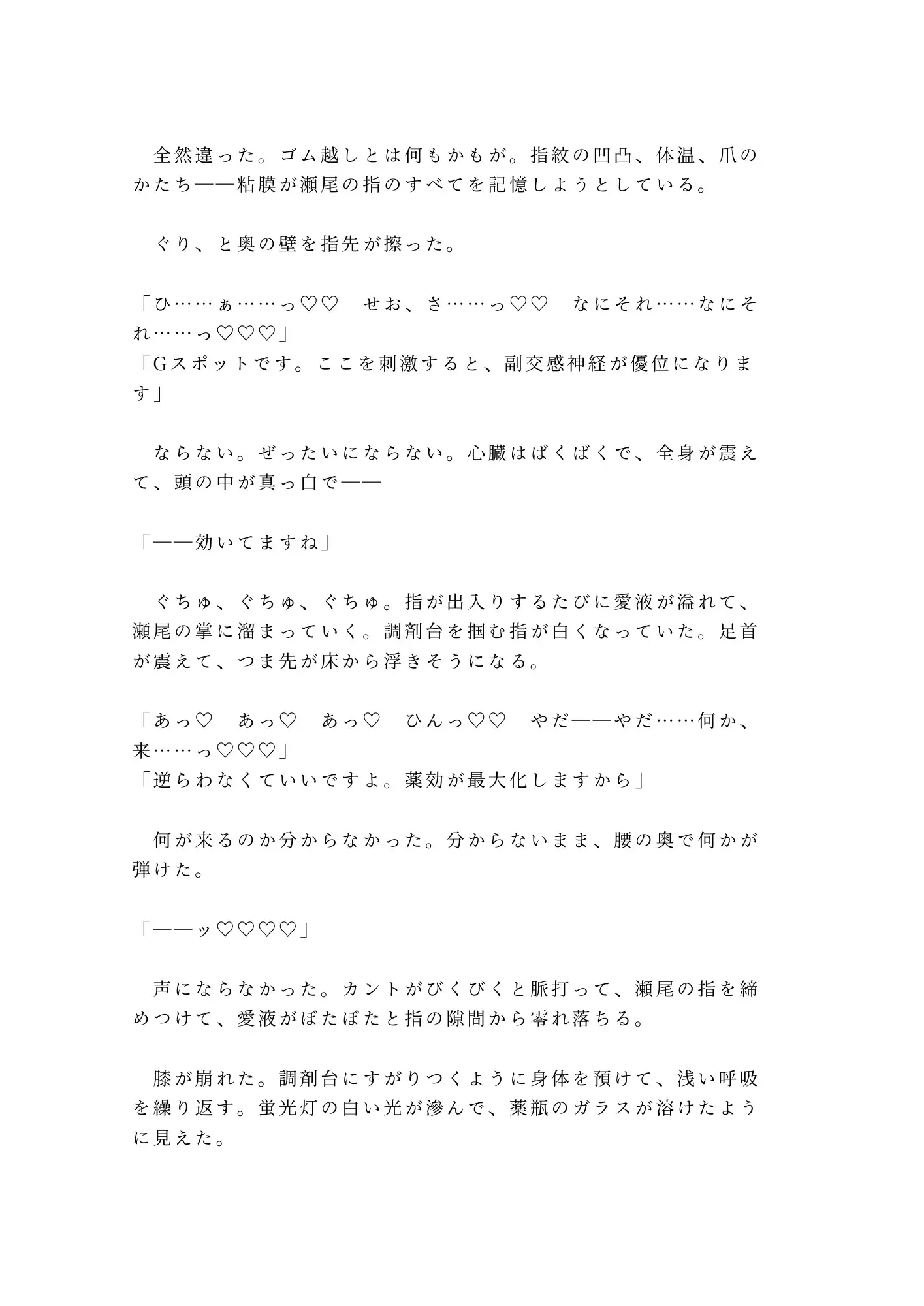 本作の核は、「でたらめだと分かっているのに逆らえない」という快楽の構造にある。ゴム手袋、アルコール綿、ステンレスの調剤台。冷たく無機質な医療器具と空間が、桐生の身体から溢れる熱と水音を際立たせる。瀬尾は終始「処方」と称して桐生を犯し、その声は乱れない。壊れていくのは桐生だけ。その非対称がたまらない。