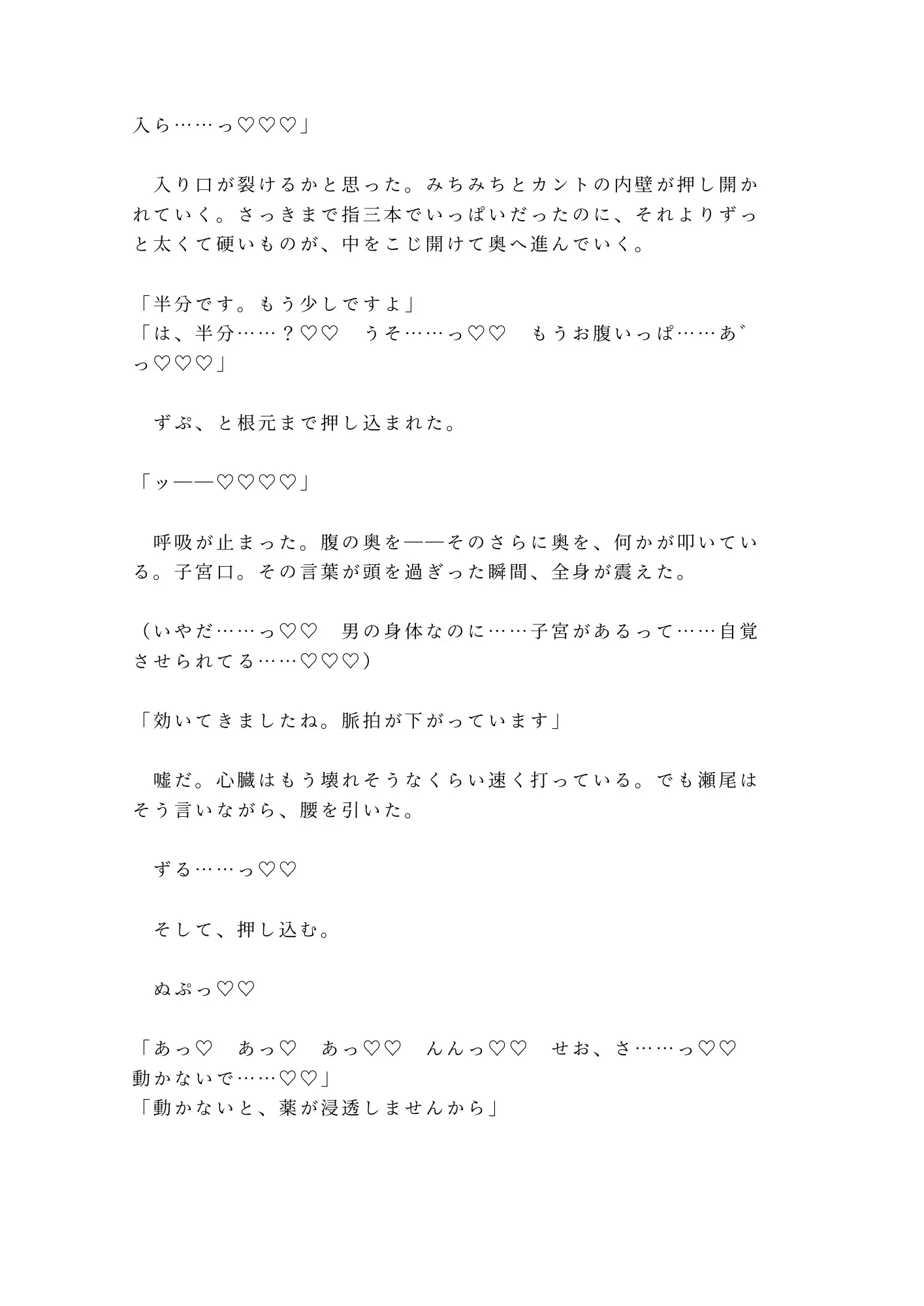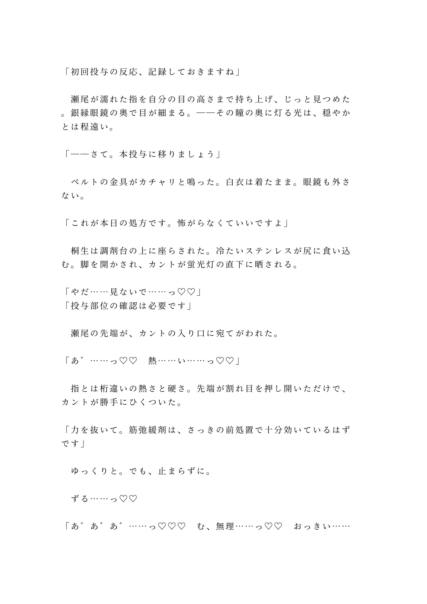 二十二年間「存在しないこと」にしてきたカントを暴かれ、指で、そして直接で何度も奥を突かれるたび、桐生の抵抗は甘い嬌声に塗り替えられていく。四回の「臨床試験」を経て、桐生の身体は完全に瀬尾の「処方」なしでは眠れなくなる——毎晩通院する身体の完成である。