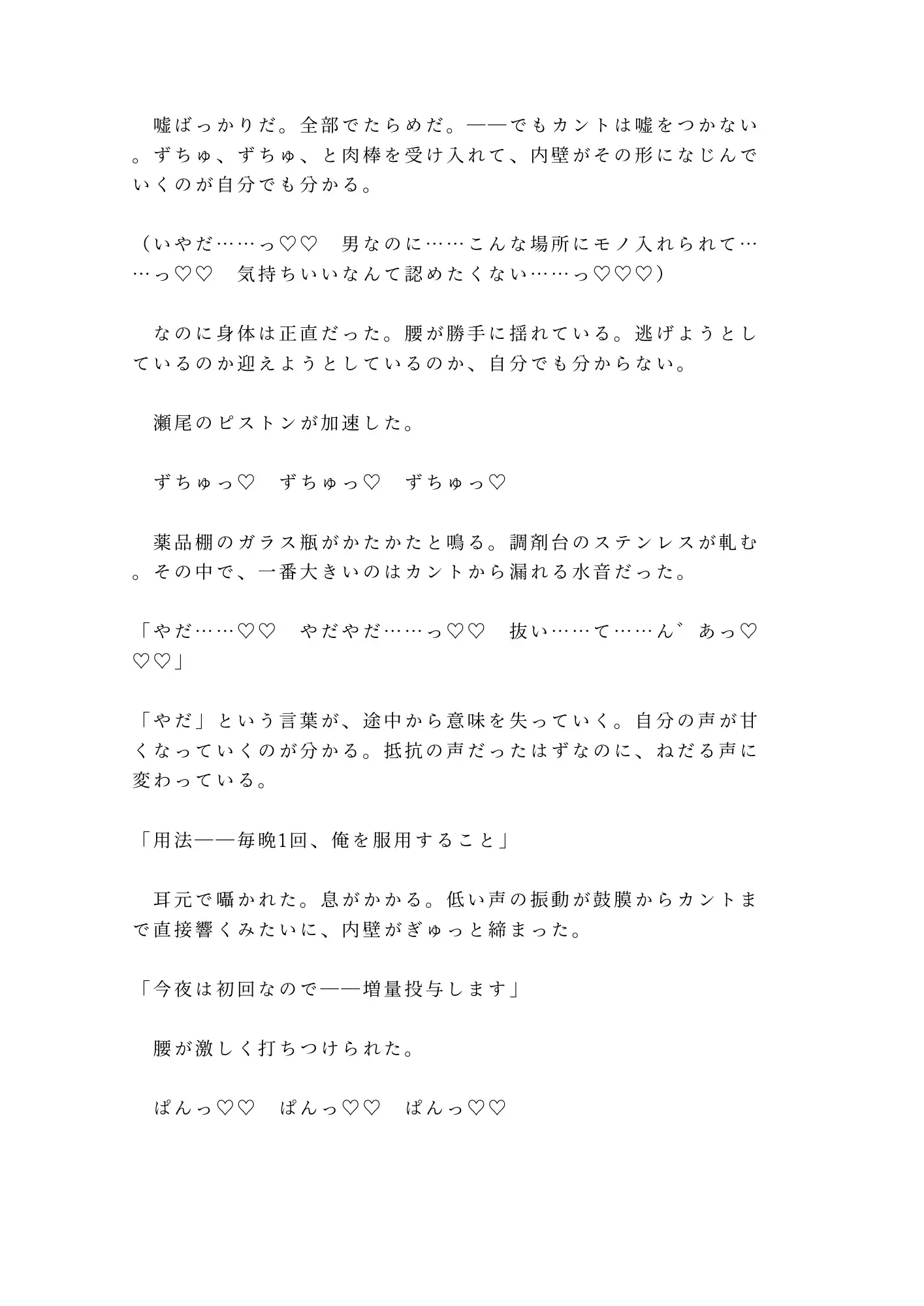 BL / カントボーイ / 薬剤師×フリーター / 調剤薬局 / 中出し / 処女喪失 / 言葉責め / 白衣敬語攻め / 種付けプレス / 不眠症処方プレイ