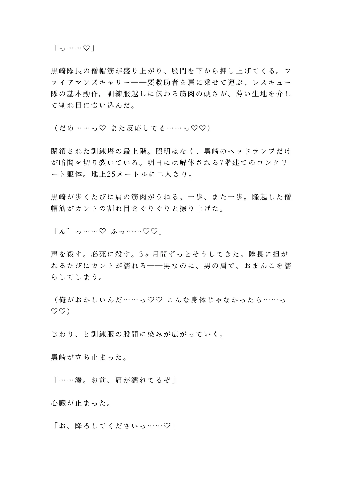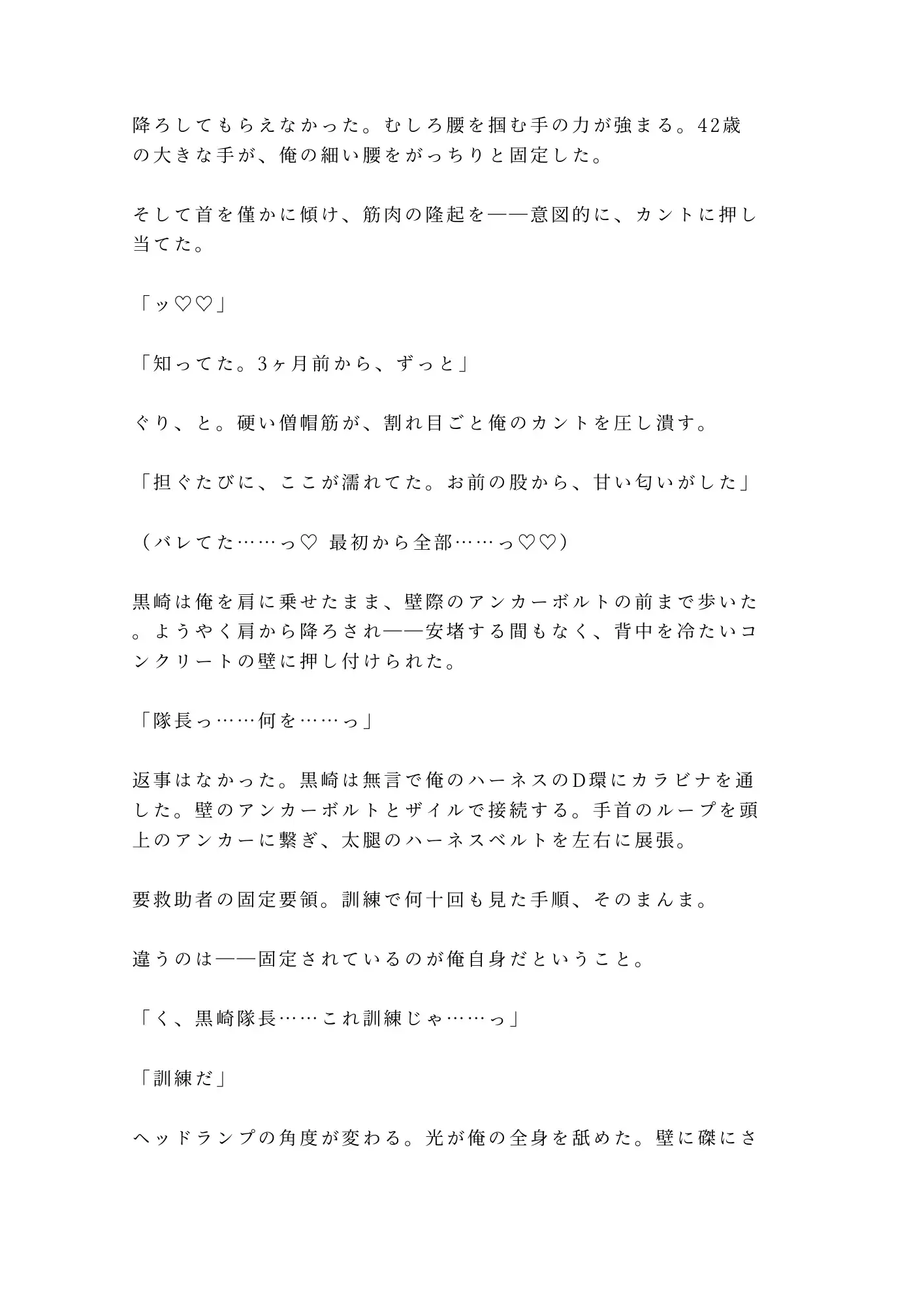 閉鎖訓練塔——明日には解体される、地上25メートルのコンクリート躯体。照明もない暗闇の中、ヘッドランプひとつだけを頼りに、二人きりの”最終訓練”が始まる。新人レスキュー隊員・湊には、誰にも言えない秘密があった。隊長のファイアマンズキャリーで担がれるたびに、身体が勝手に反応してしまう。盛り上がった僧帽筋が股間を擦り上げるだけで、訓練服の内側はぐしょぐしょに濡れていた。3ヶ月間、必死に隠し通してきたその秘密を——42歳のベテラン隊長・黒崎は、最初から全部知っていた。