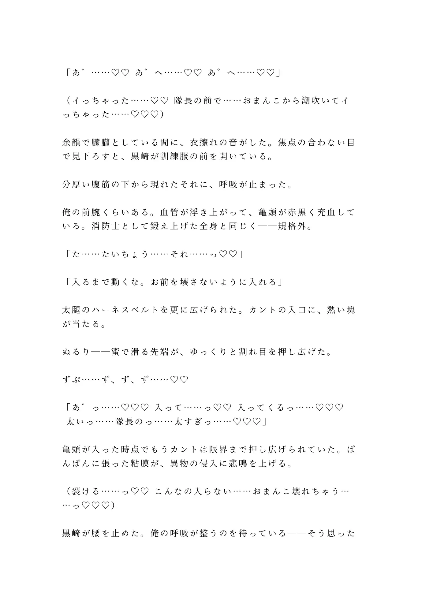 BL / カントボーイ / 年の差 / 消防士×新人 / 拘束・ハーネス / 中出し・種付け / 複数回戦 / 筋肉 / 高所プレイ / 雌堕ち