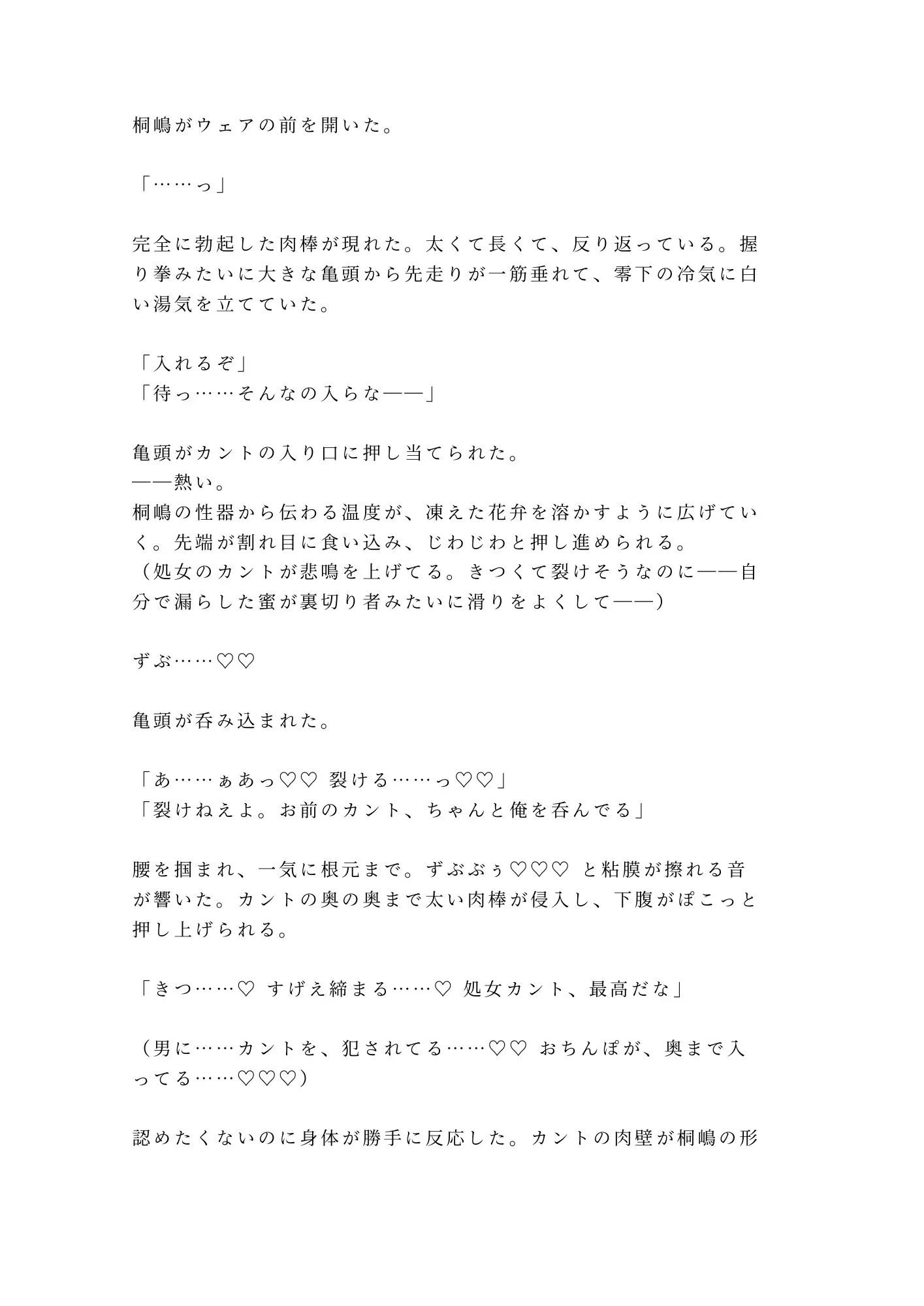 雪山育ちの鬼畜インストラクター×秘密を抱えたカントボーイ。復旧までの一時間で、処女喪失から雌堕ち完了まで一気に駆け抜ける、極限密室カント堕ち小説。氷点下の外気と火傷しそうな体温の温度差が、すべてのページで肌を粟立たせます。