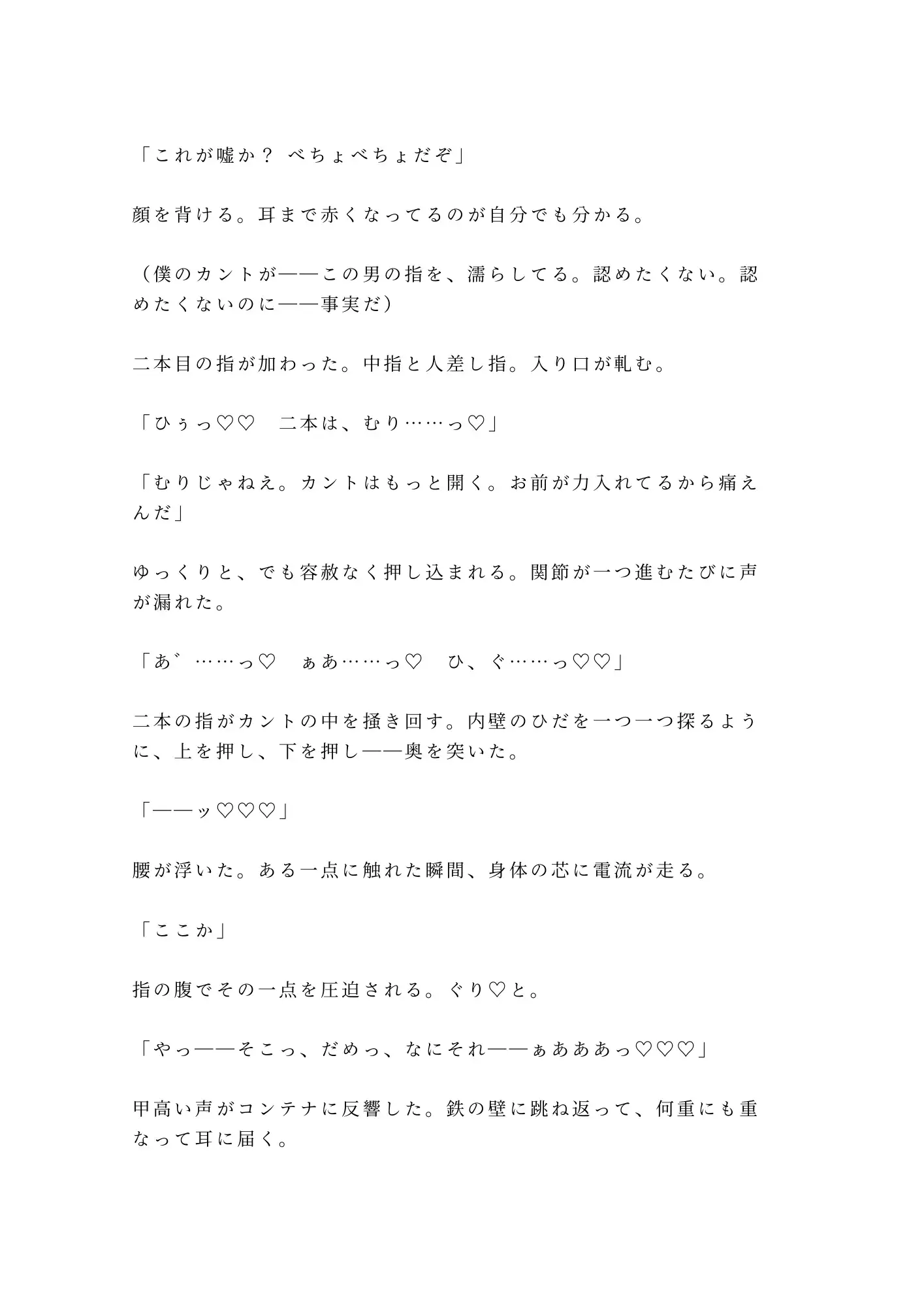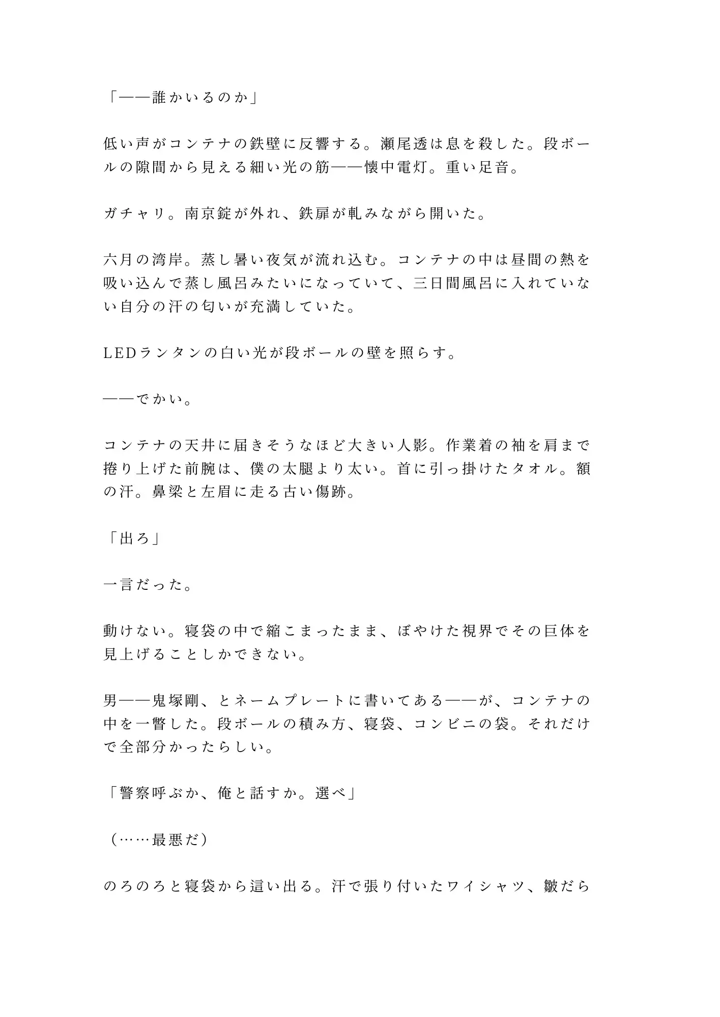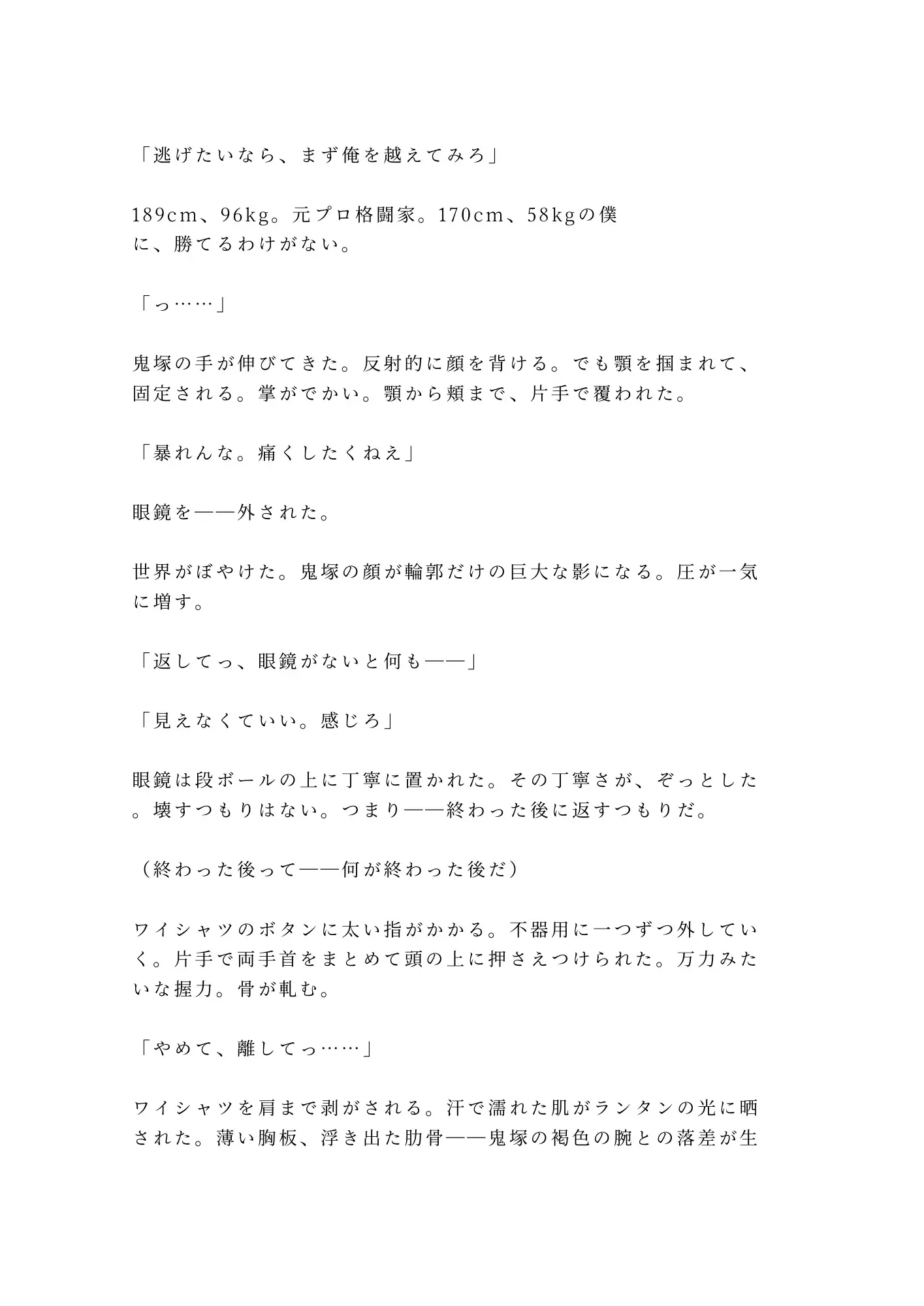 夜逃げした先は、湾岸のレンタル倉庫――。350万の借金を背負い、すべてを捨てて逃げ出した元会社員の瀬尾透(28)。三日間潜伏していたコンテナを開けたのは、倉庫の管理人・鬼塚剛(35)。189cm96kgの元プロ格闘家。逃げ場のない鉄の箱の中で、鬼塚は透の秘密を一瞬で見抜いた。
