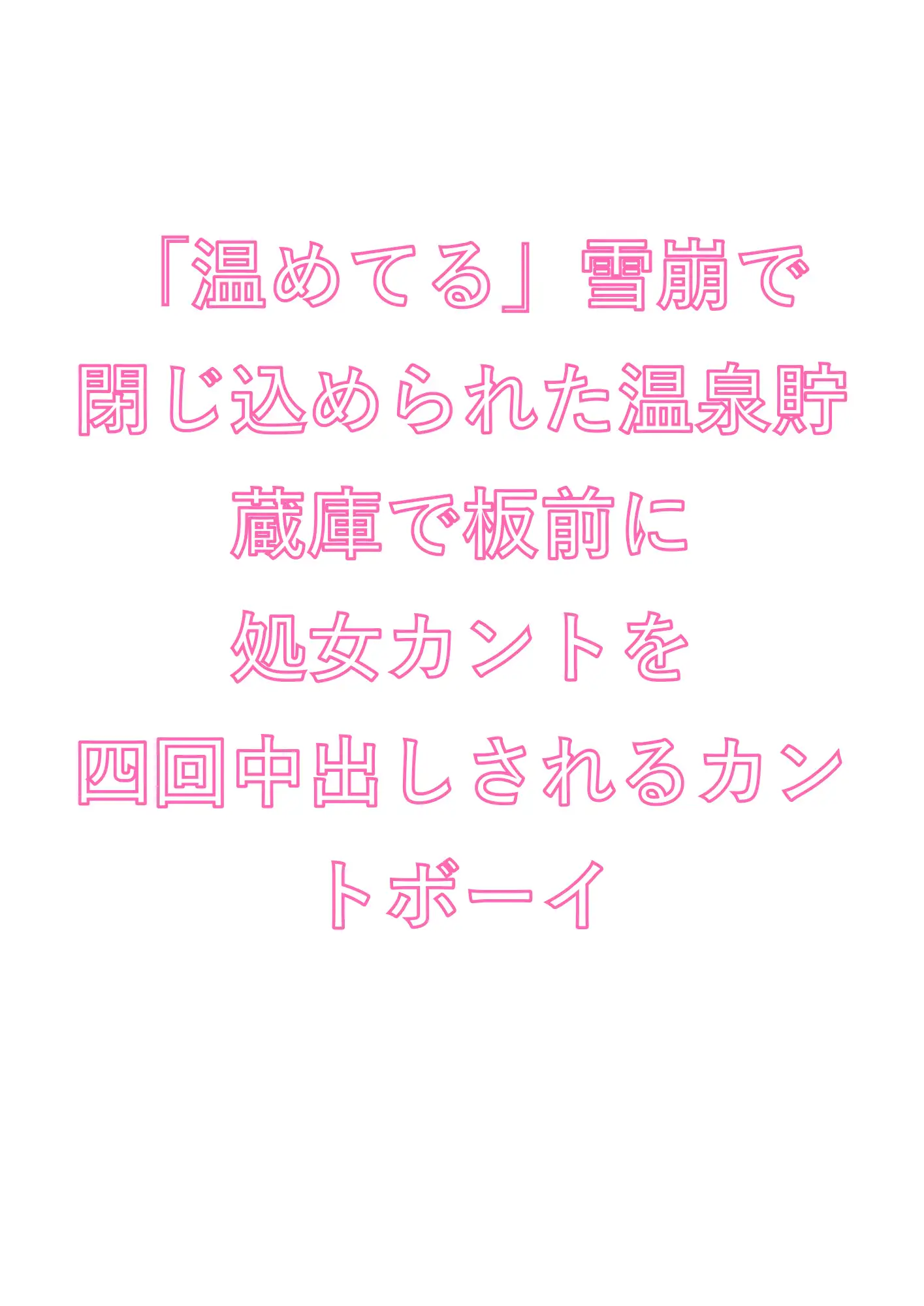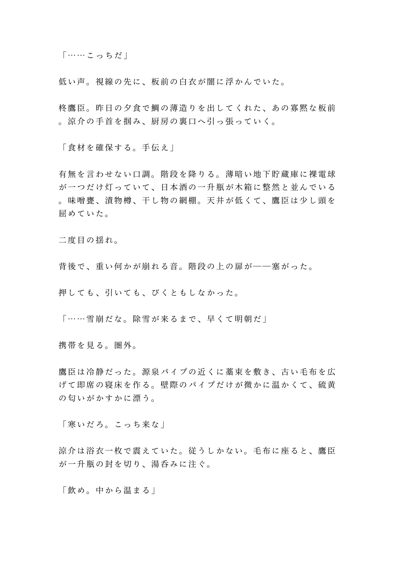 山奥の温泉旅館を襲った雪崩。逃げ場を失った地下貯蔵庫で、三十歳のカントボーイ・涼介は寡黙な板前・柊鷹臣と二人きりになる。源泉パイプだけが微かに温もりを伝える極寒の閉鎖空間。「温めてる」——その一言から、鷹臣の手が涼介の身体に伸びた。
