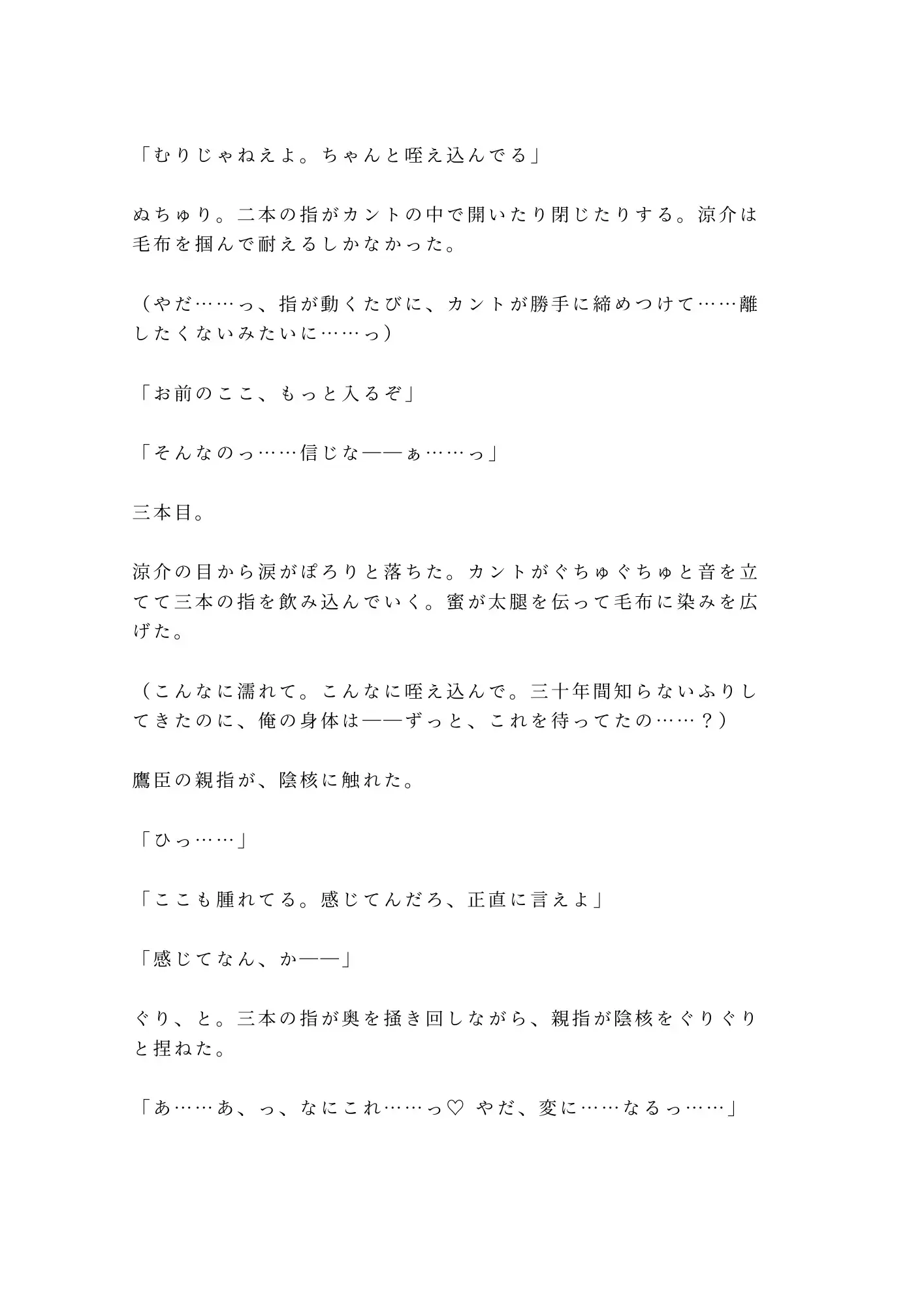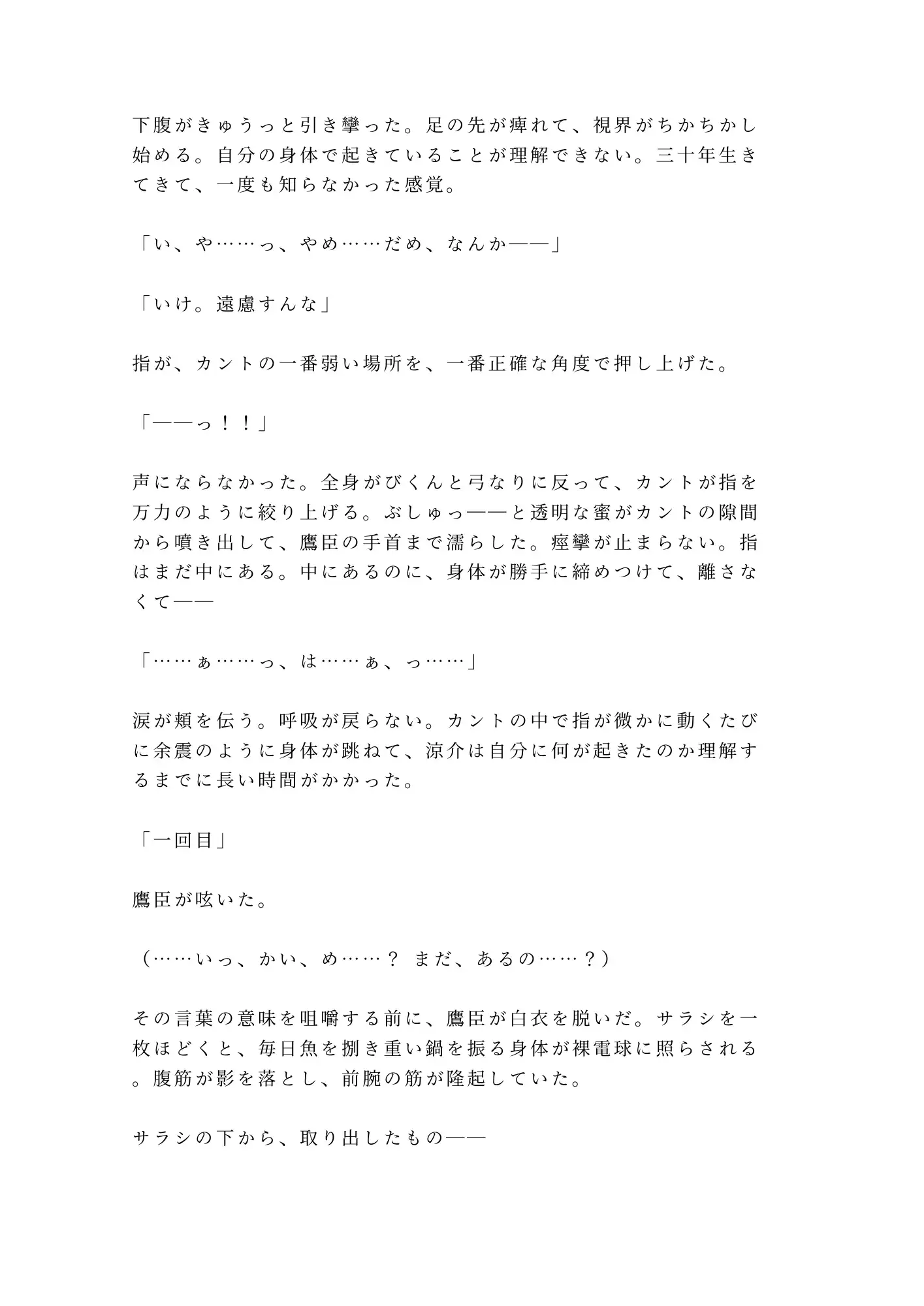 涼介の抵抗は長くは続かない。知らなかった自分の身体の反応に戸惑い、羞恥に涙を流しながらも、カントは正直に蜜を溢れさせ、与えられる快楽を貪り始める。
