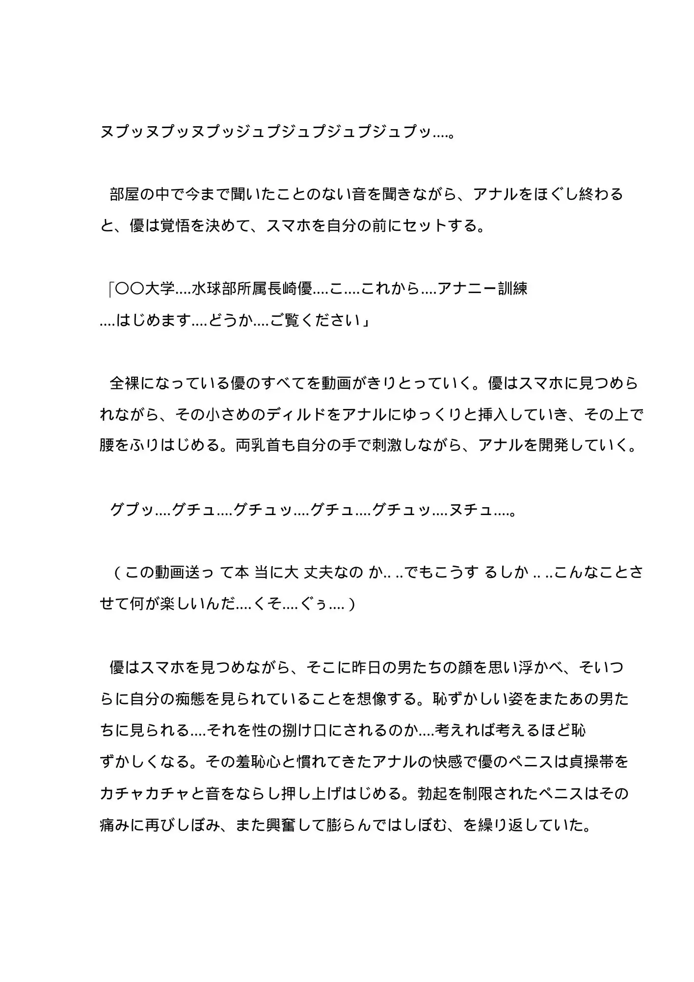 毎朝決まった時間、決まった車両で痴態が行われているとある電車。そこに乗り合わせてしまった大学生水球部の主人公が脅迫と快楽によりおとされていく展開です。痴○、開発、兜合わせ、アナニー、撮影、輪〇、貞操帯、公開オナニー等