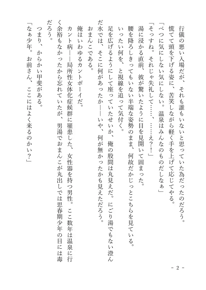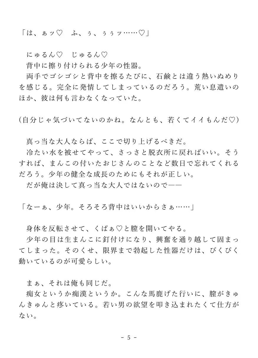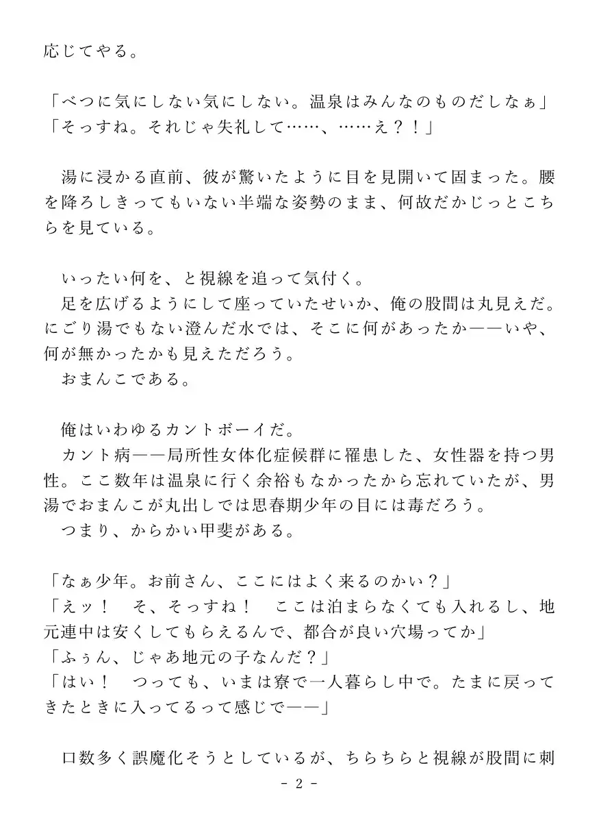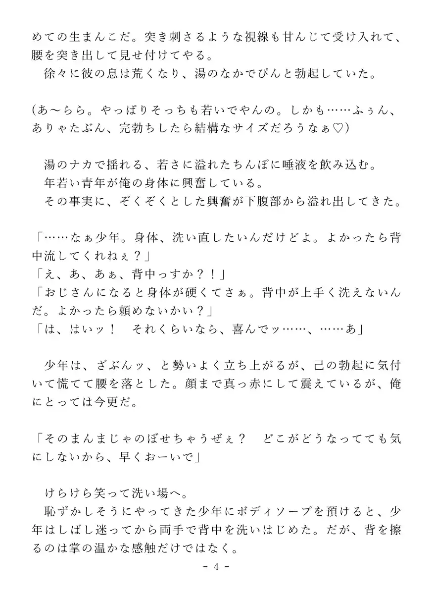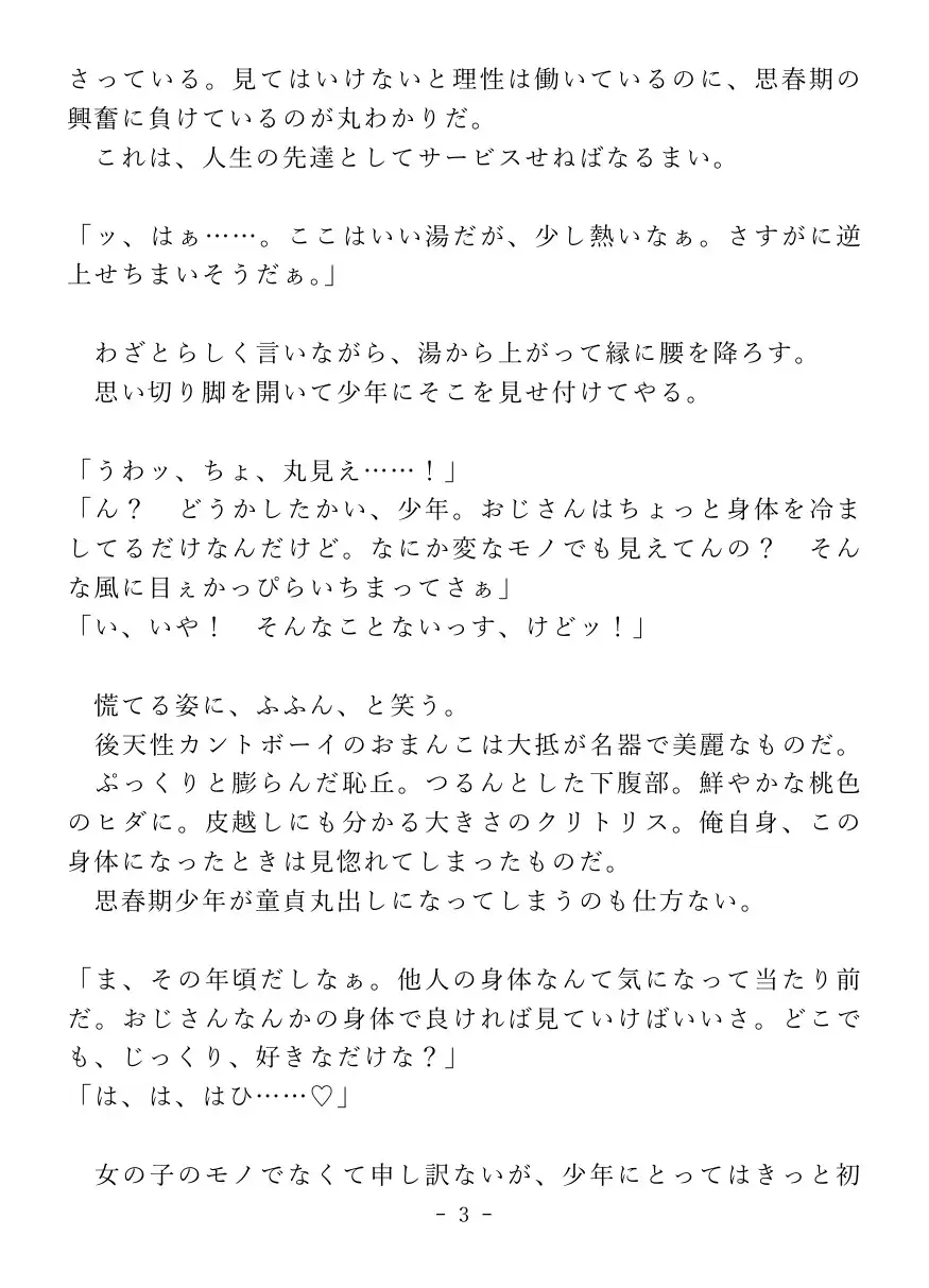 男湯で純情少年におまんこを見せ付け、逆レ○プで搾り取っちゃう淫乱カントボーイおじさんのお話です。【前編】