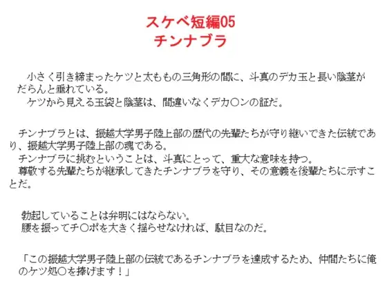 100メートル走の成績と、大きなもっこりで有名な与義斗真もまた、振越大学男子陸上部の一員として、チンナブラに挑もうとしていた。