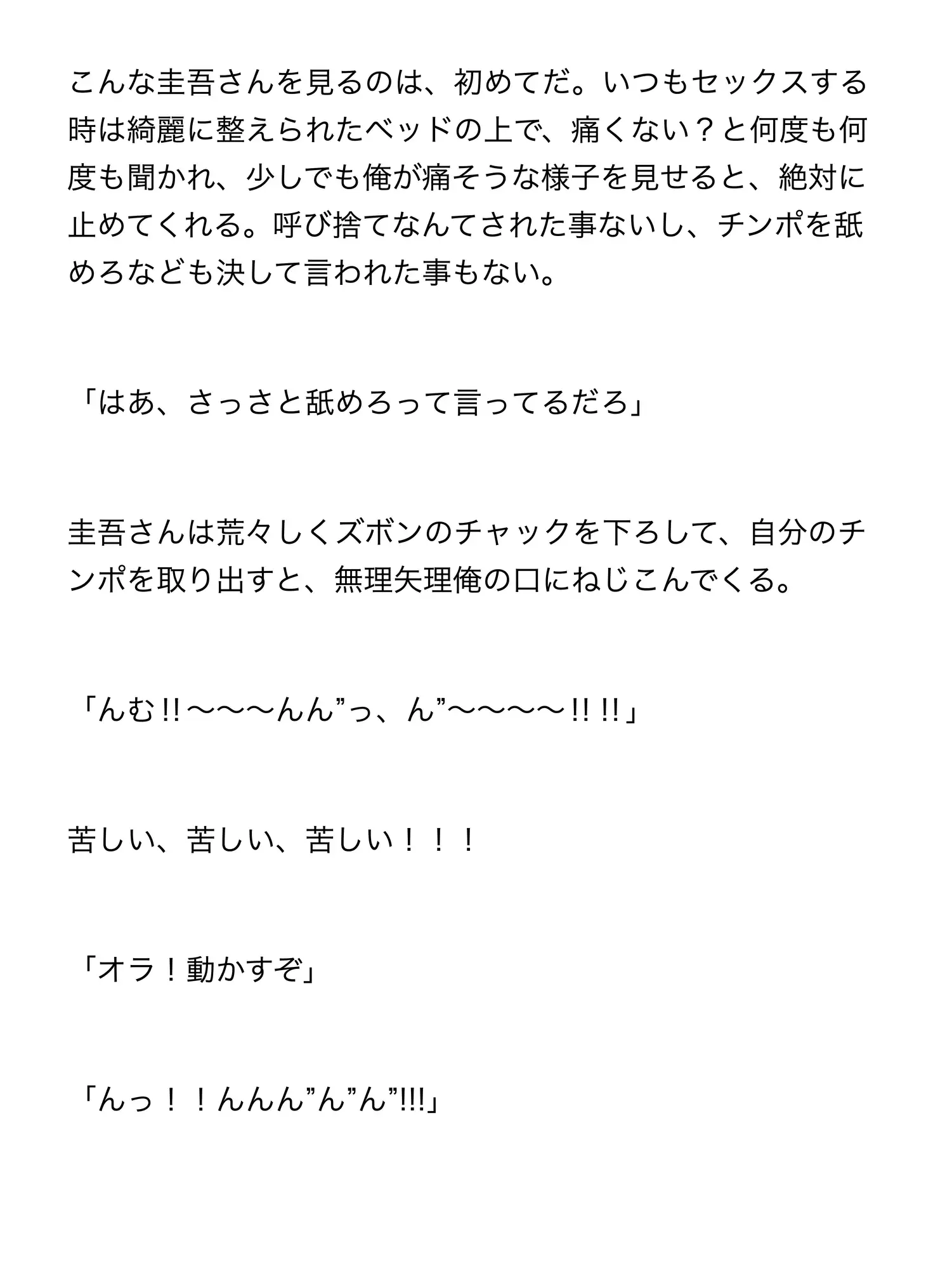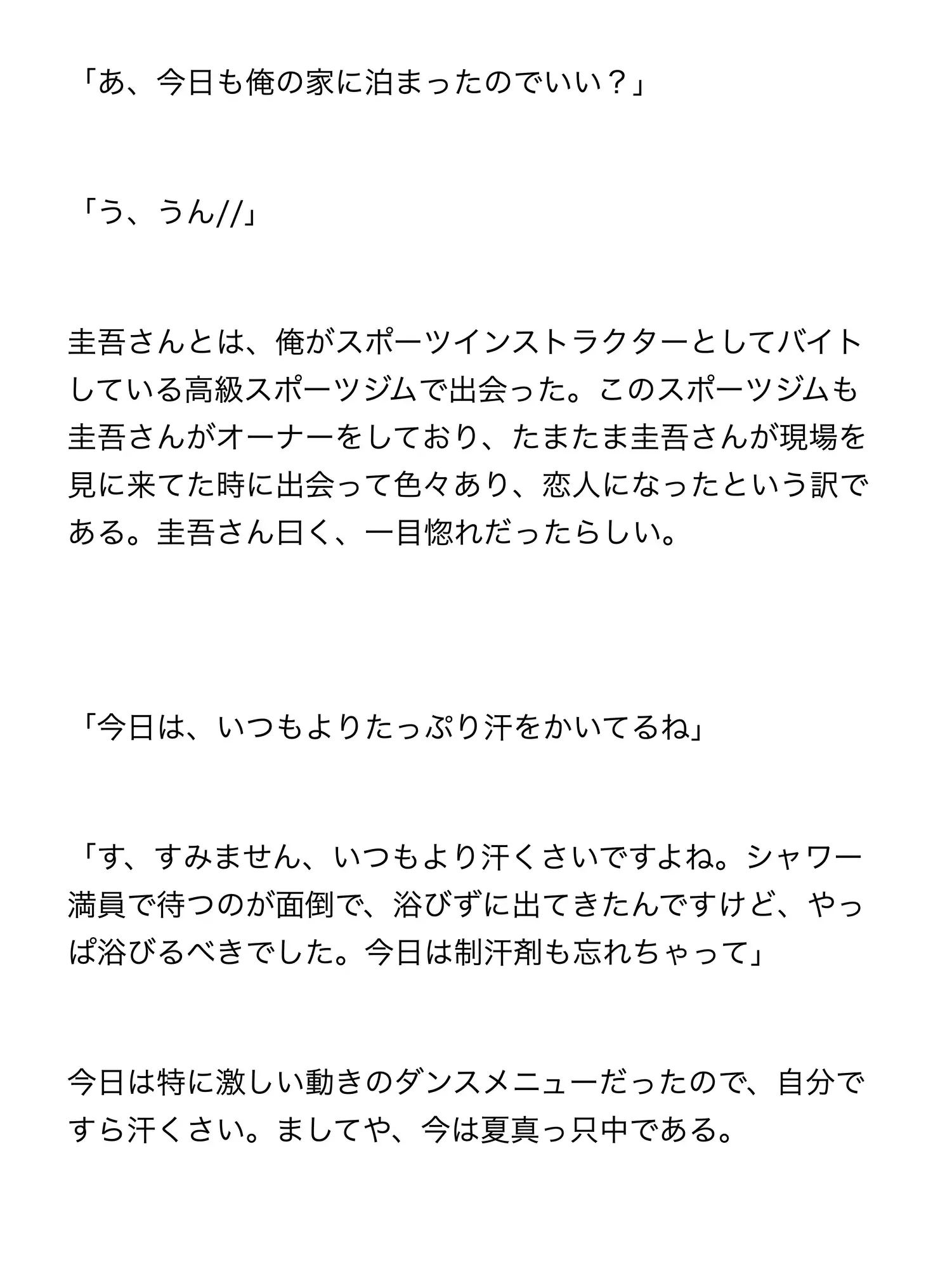 攻めが汗フェチの変態で、少しヤンデレっぽい感じです。首絞め表現などがあり、SMっぽい描写もございます。文字数は約10000字ほどです。