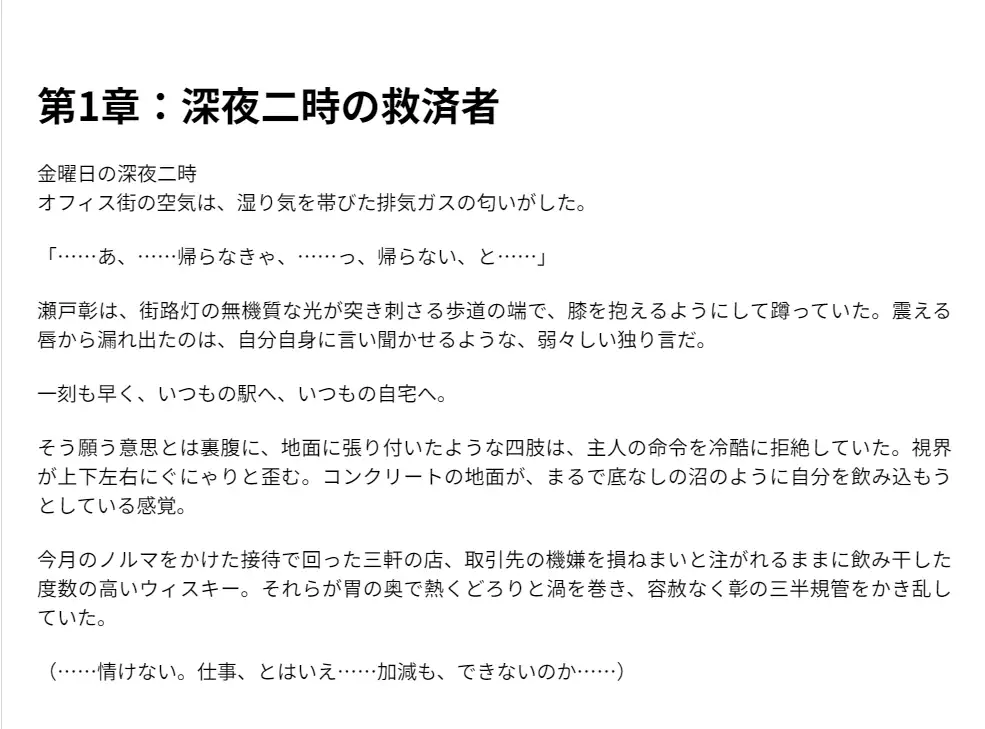 金曜日の深夜二時。排気ガスの匂いが漂うオフィス街の片隅で、瀬戸彰は蹲っていた。