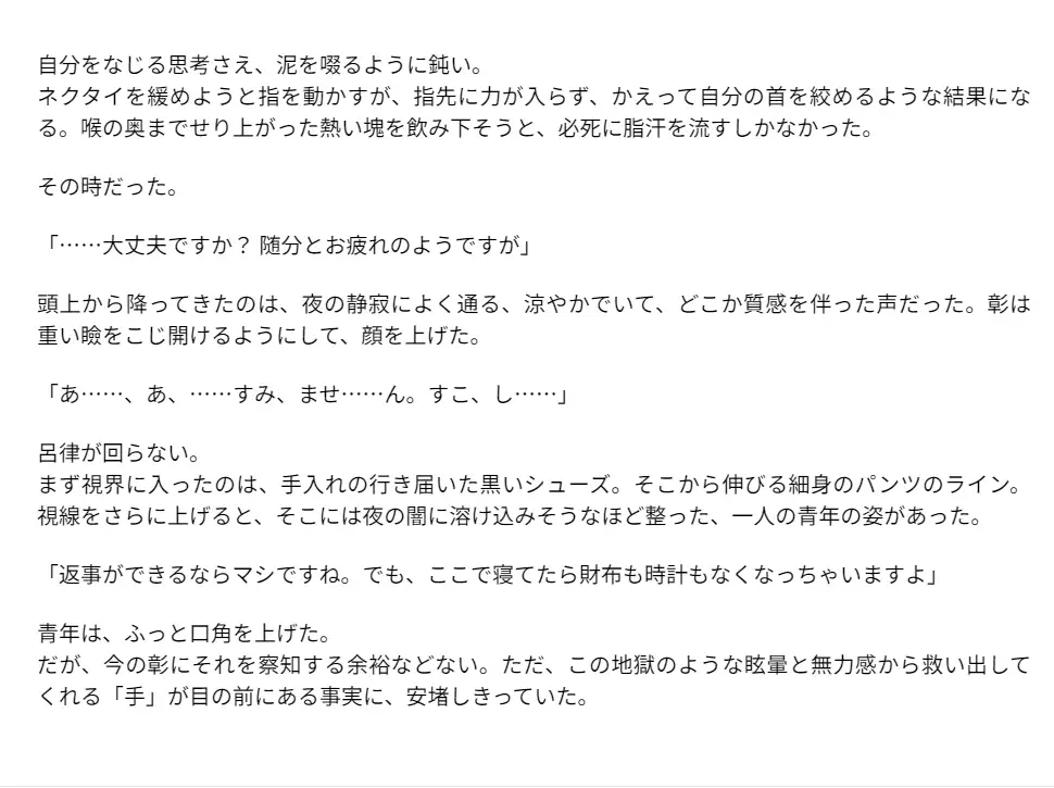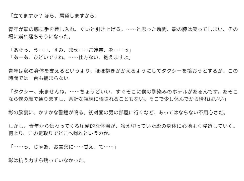 「ちょうどいい、すぐそこに僕の馴染みのホテルがあるんです。そこで少し休めばいい」抗う力もなく、その圧倒的な体温に安堵した彰は、誘われるままにホテルの一室へと吸い込まれていく。