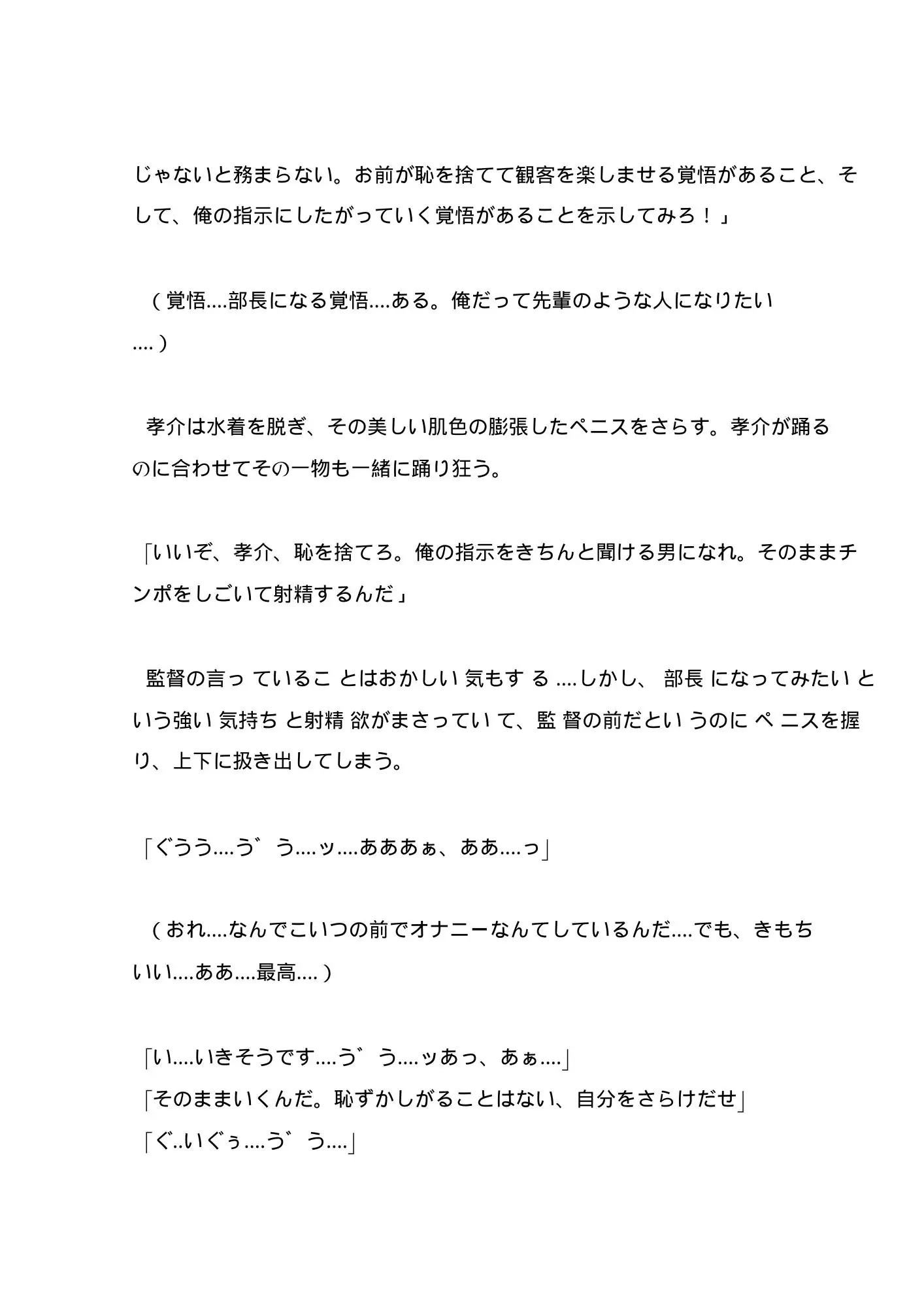 現監督になってから始まった水泳部による男のシンクロ公演。観客の中には監督指定のもっこり強調水着で踊る部員達を見定める猛獣のような男たちの姿。