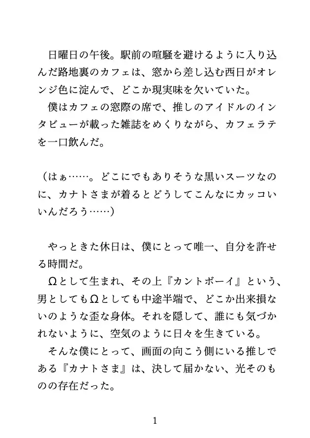 文字数 : 19,478文字(♡、記号含む)創作BL / オメガバース / カントボーイ / アイドル×ファン / 強○発情 / 連続絶頂 / ♡喘ぎ / 乳首責め / おもちゃ責め / 中出し / クリ責め / 番契約