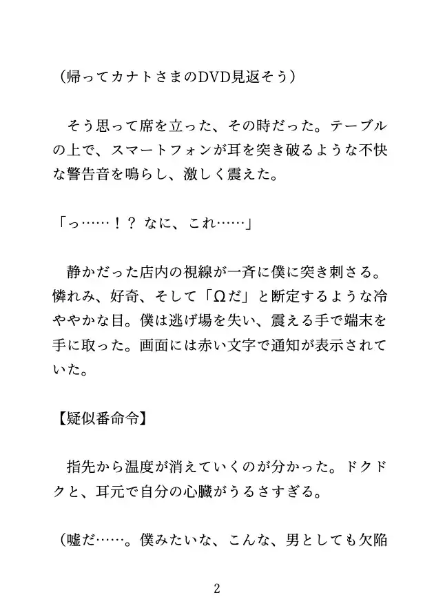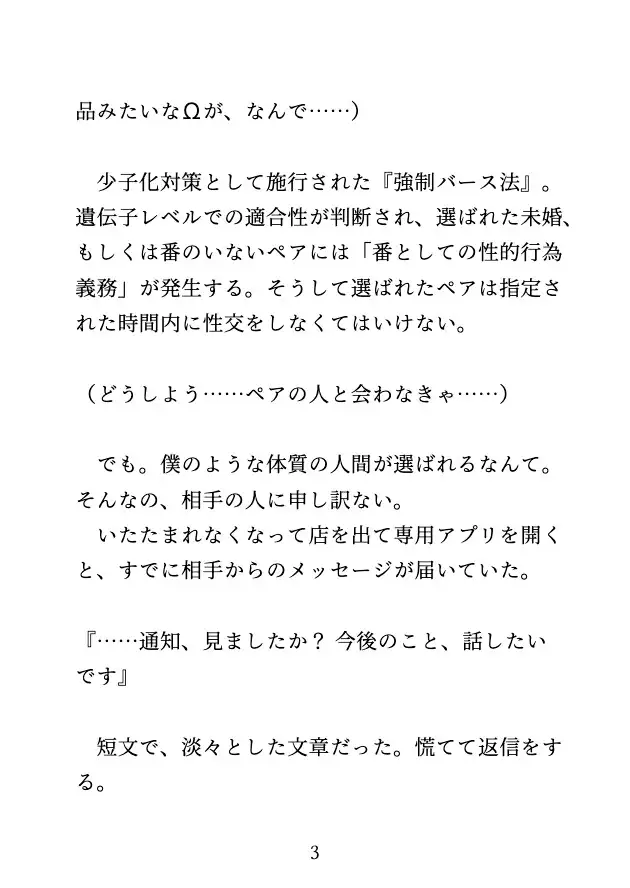 真広の癒やしは、推しのアイドルである『カナト』を見ることだった。ある日、真広のもとに『強○バース法』による疑似番命令の通知が届く。