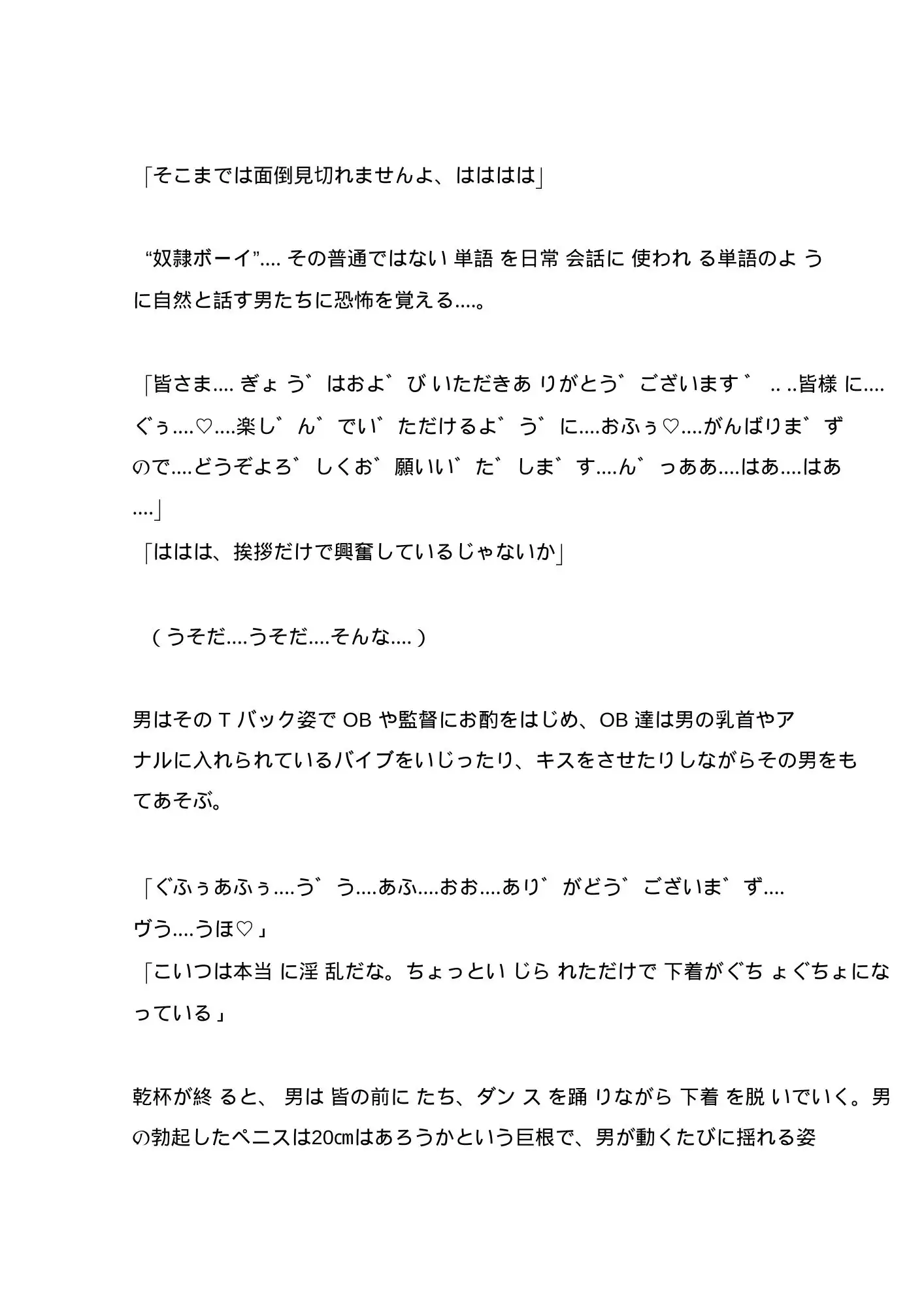人気の部員を監督が媚薬を使いながら時間をかけて調教し、精液風呂につけて精子に慣れさせ、客に差し出していく‥‥。