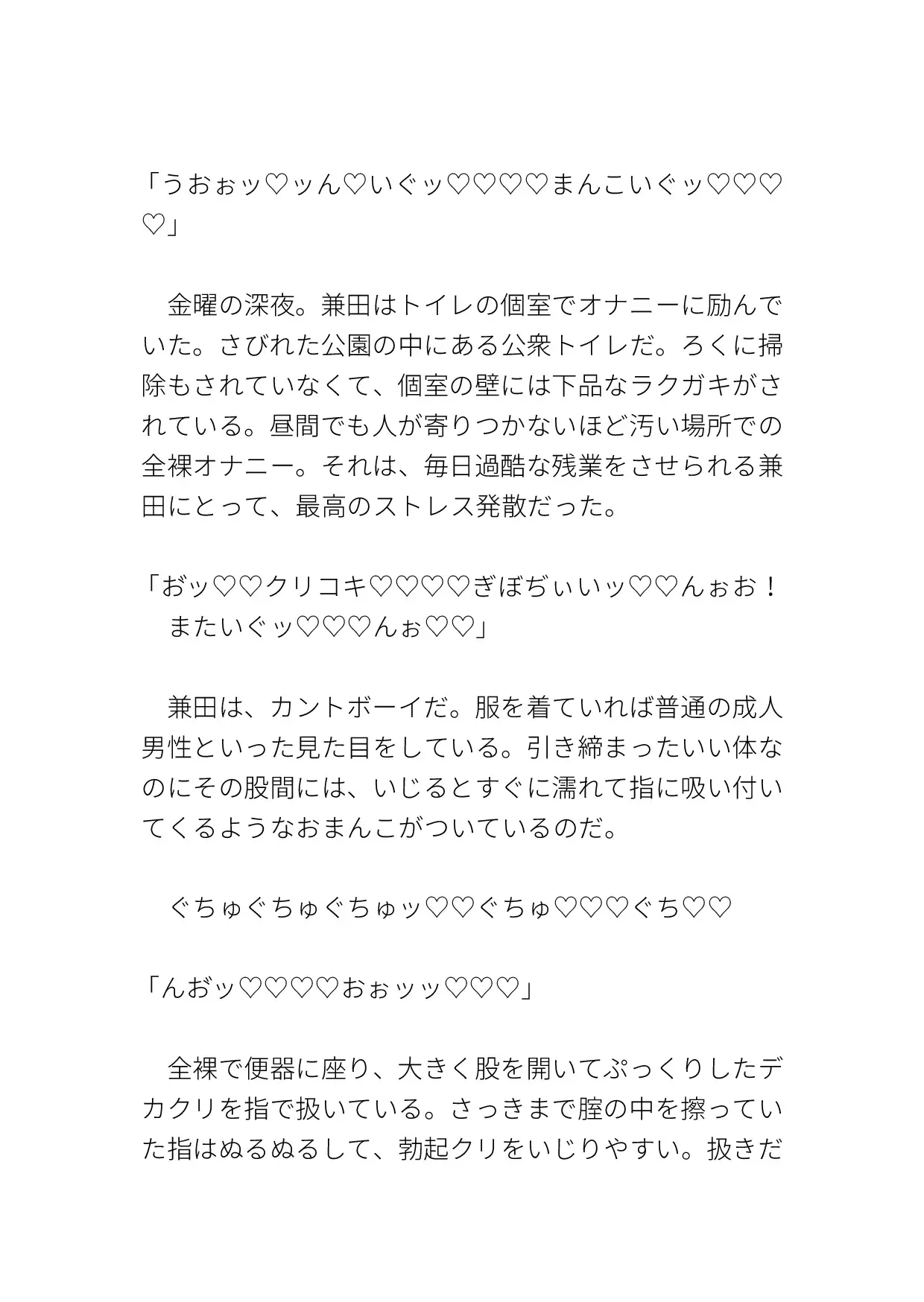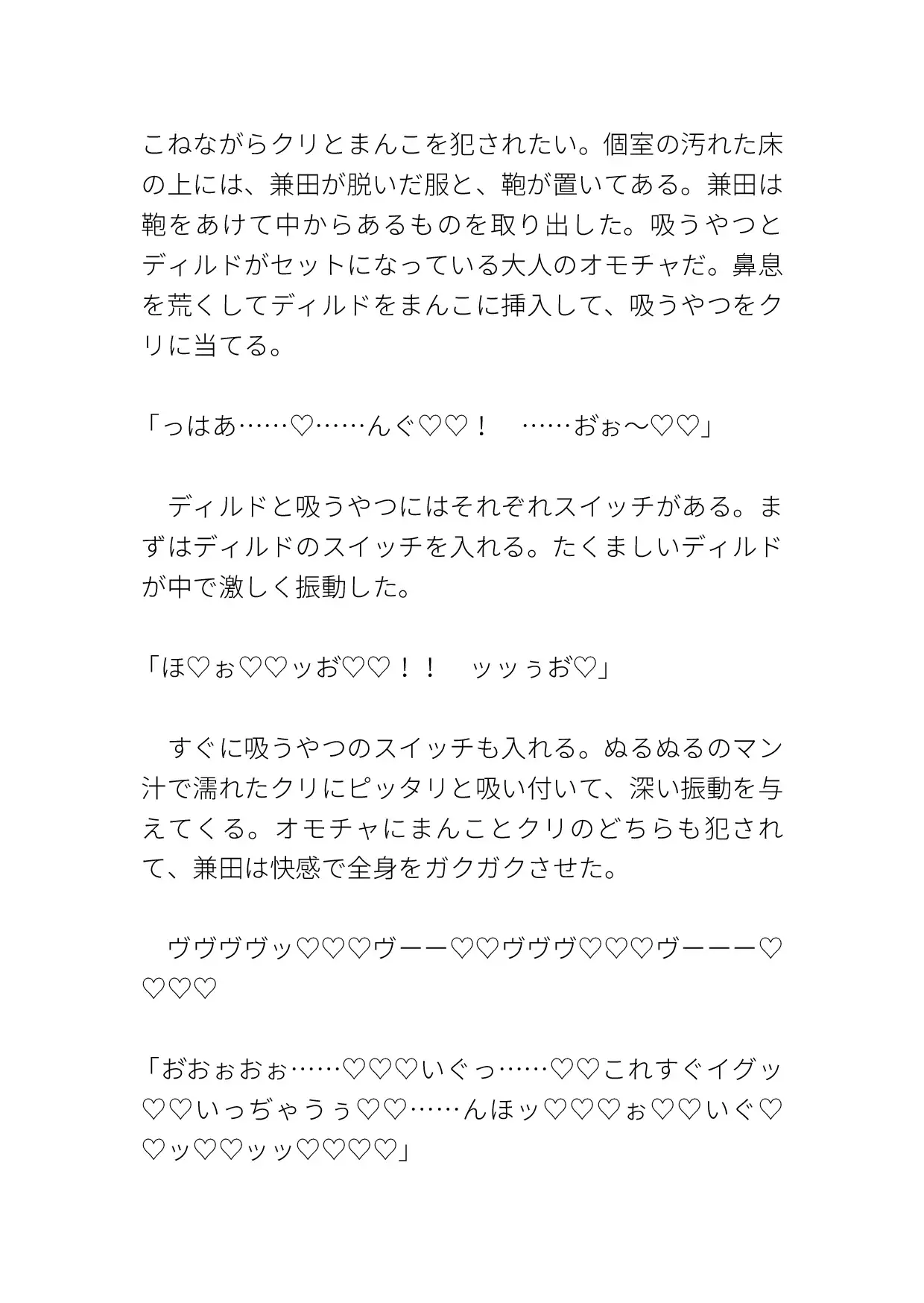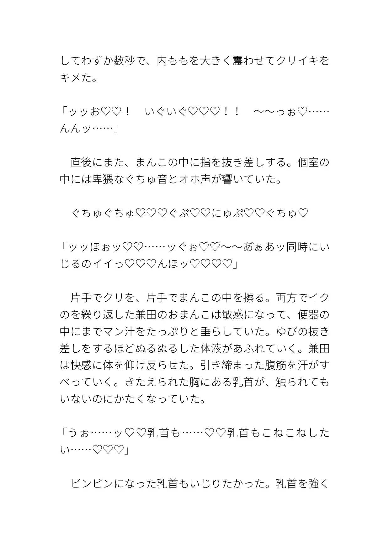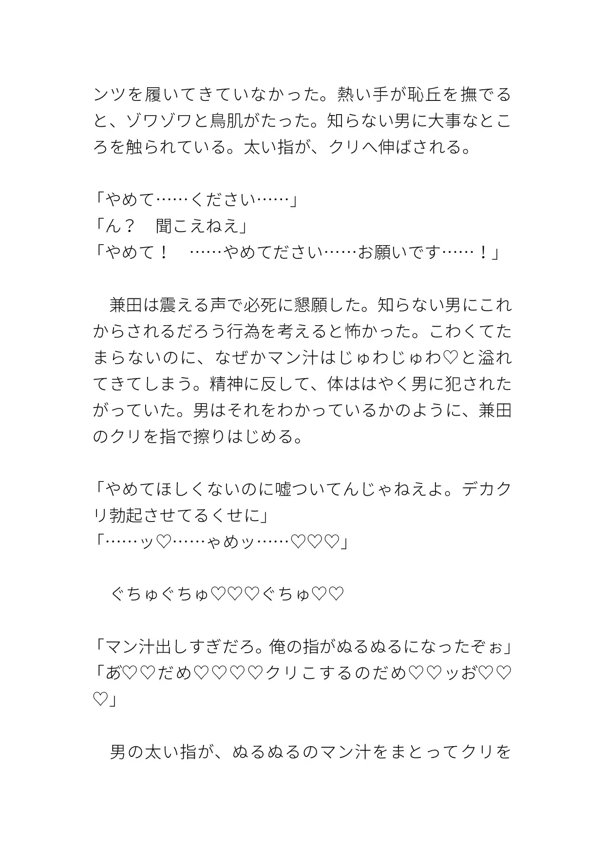いつものようにオナりに来ると、知らない男がいて犯されてしまう。クリも乳首も責められ、激しく突かれて中出しまでされる。ハート、濁点、擬音表現など込みで約10000字。
