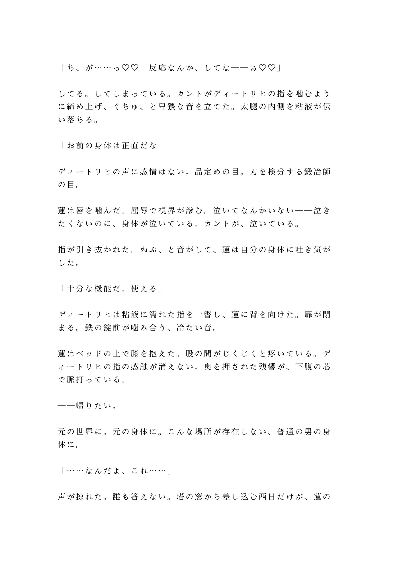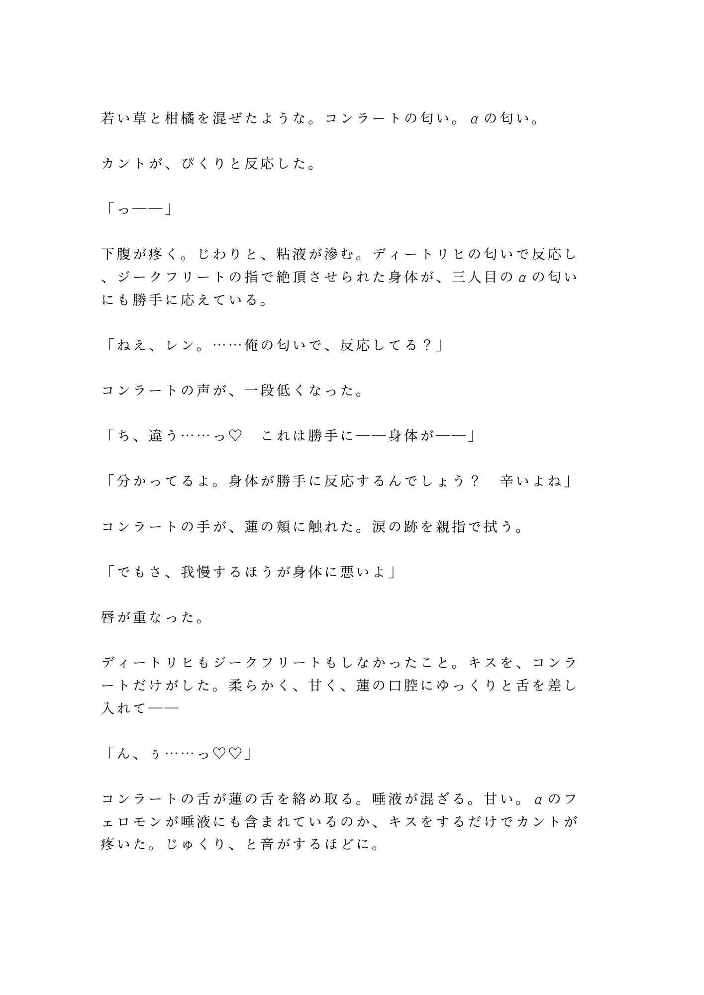 三人のαに代わる代わる暴かれるたび、蓮のカントは主の意思を裏切って濡れ、締まり、絶頂を重ねる。屈辱で泣きながら、身体だけが快楽に堕ちていく。「お前の子宮は国家の財産だ」——その言葉が、蓮の自尊心を抉るたびに、カントはさらに深く疼く。