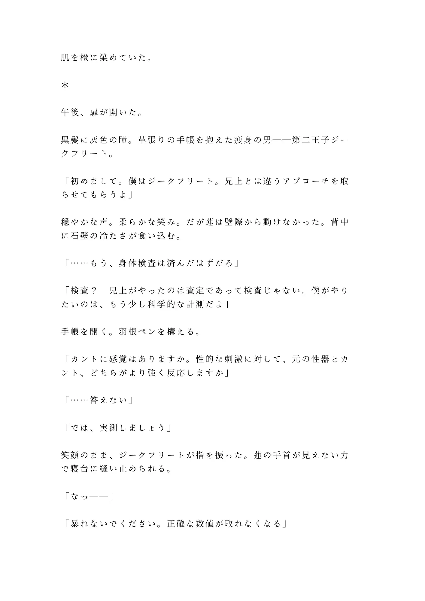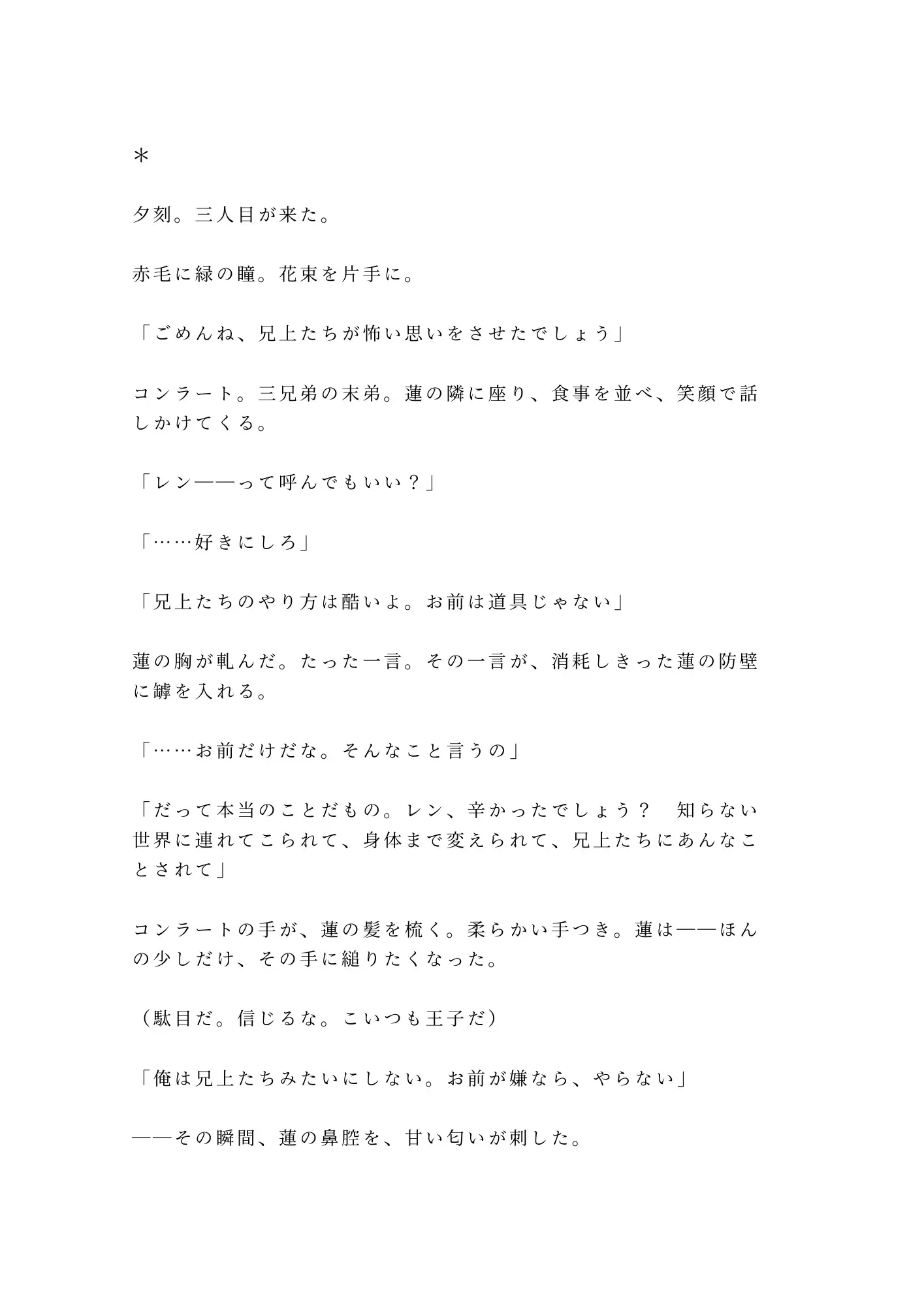第一王子ディートリヒ。感情のない目で蓮の身体を「査定」し、「使える」と断じる冷酷な支配者。第二王子ジークフリート。笑顔で蓮のカントに器具を挿し込み、絶頂までの秒数を手帳に記録する狂気の学者。第三王子コンラート。唯一キスをくれる優しい末弟——だがその甘さの裏に、兄たちより深い執着が潜んでいる。