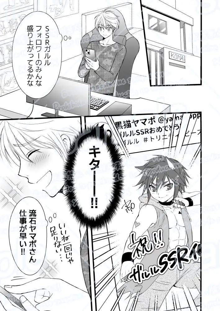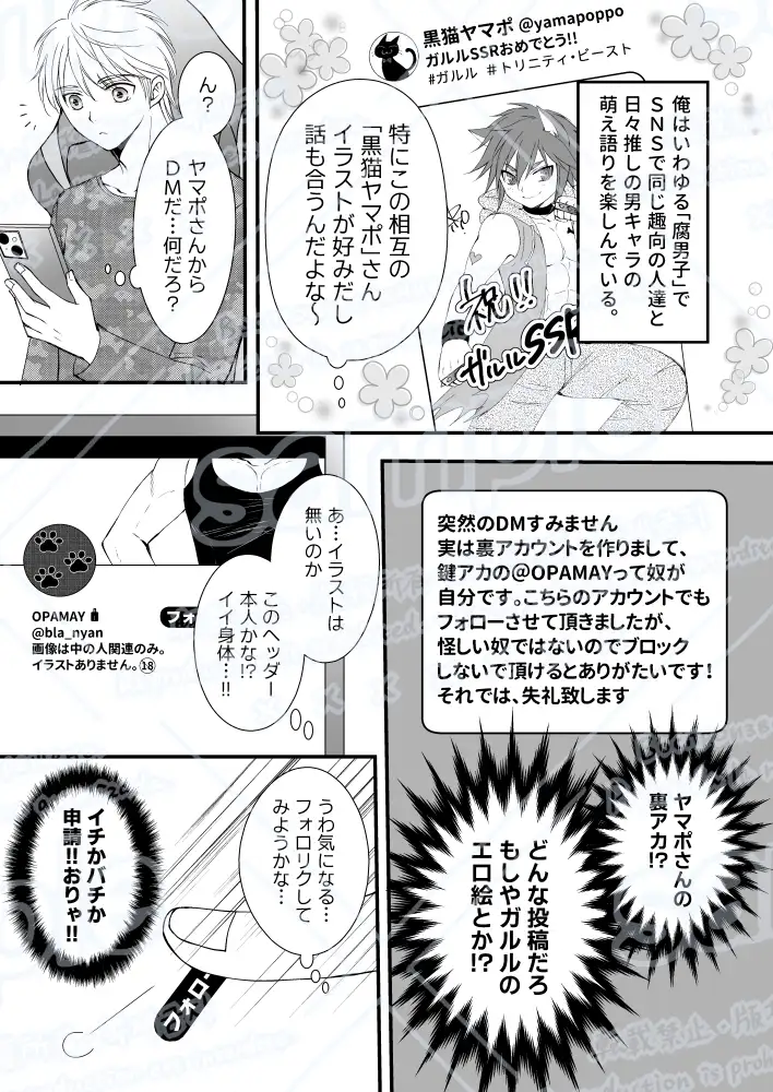 ハーフの大学1年生。「トリニティ・ビースト」という獣人キャラのスマホゲームにハマっている腐男子。相互フォロワーの黒猫ヤマポ氏に憧れている。