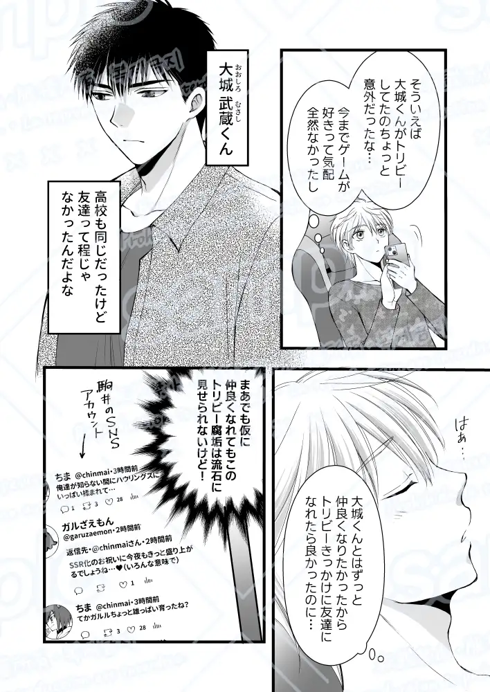 大学生の駒井アレンは「ちま」というHNで腐男子アカウントでのSNS交流を日々楽しんでいた。