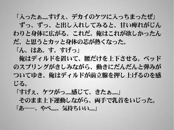 39歳の会社員は、金曜日の夜、疲れた身体の奥でうずく欲望をもてあまし、独りで自分のケツをいじりはじめる。ディルドをぶち込み、乳首とチンポを刺激して、成熟したオスの肉体はいっそうエロさを増してゆく。